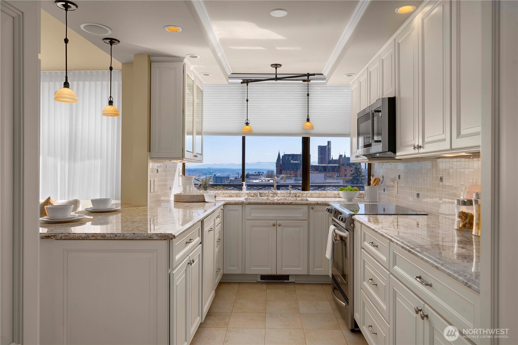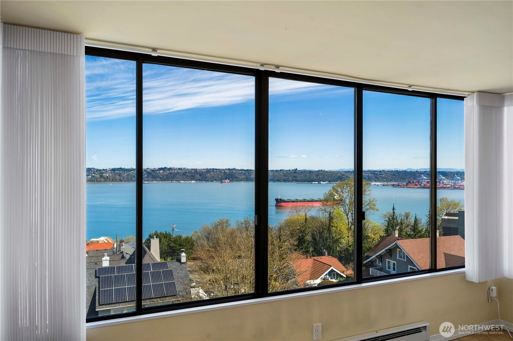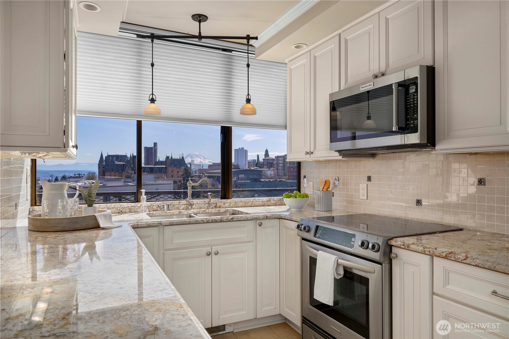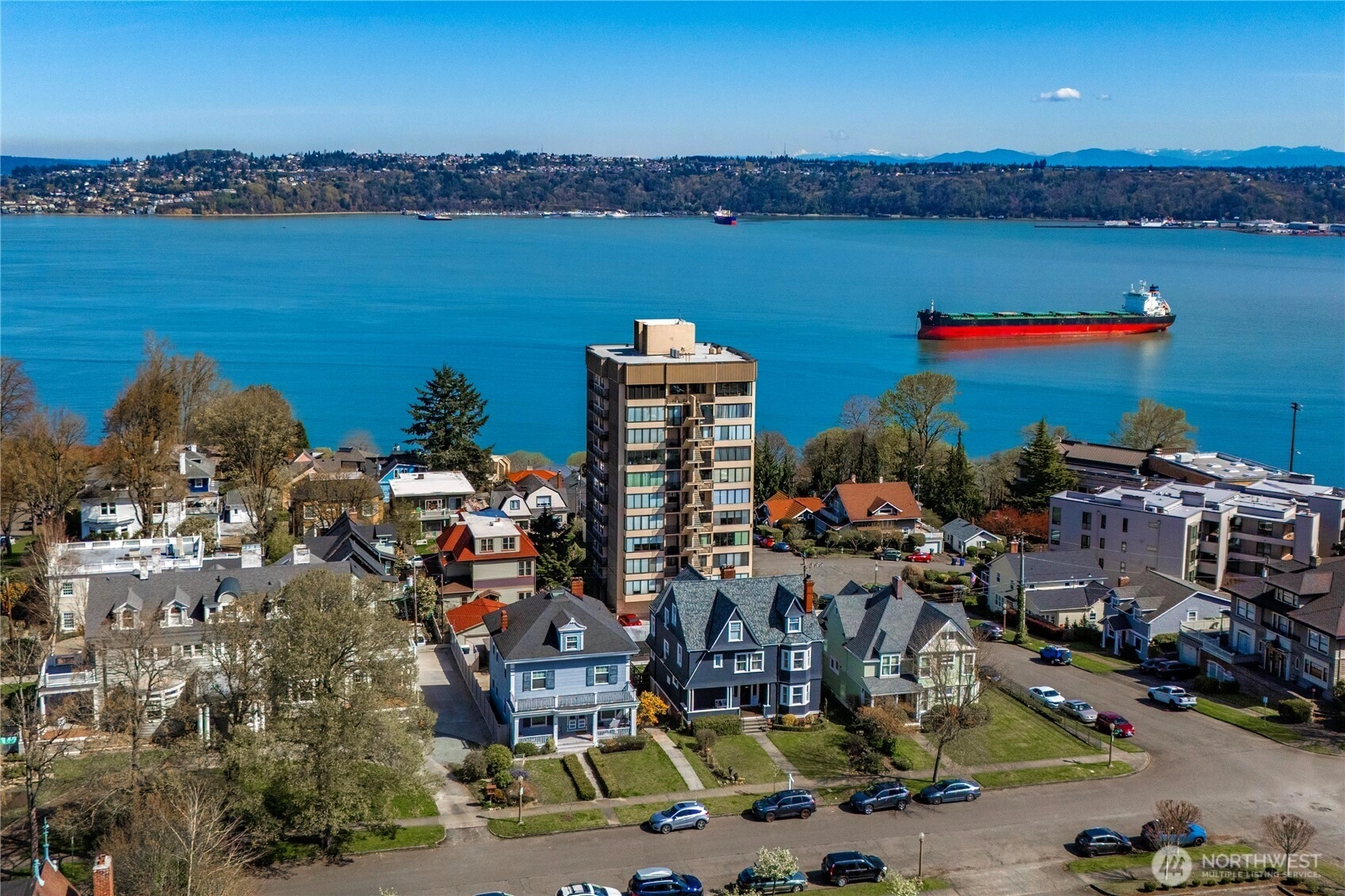 LAST CHANCE! Seller wants to sell! Don't let this deal get away. From the sunrise over Mt Rainier to the moon rise over Commencement Bay, The views are captivating! 180 degree views from 3 sides await the new owner of this light filled 6th floor unit. Enjoy the privacy, quiet and walkable Stadium District. Close to shopping, eateries and transit. Beautifully updated with high end finishes this unit offers 3 bedrooms and 2 baths in a secure and well maintained building. 2 covered parking spaces, common patio, exercise room and sauna round out the amenities. A rare opportunity! The large primary suite has a full bath and 2 closets. All appliances are included. Blinds in LR AND DR are programmable
