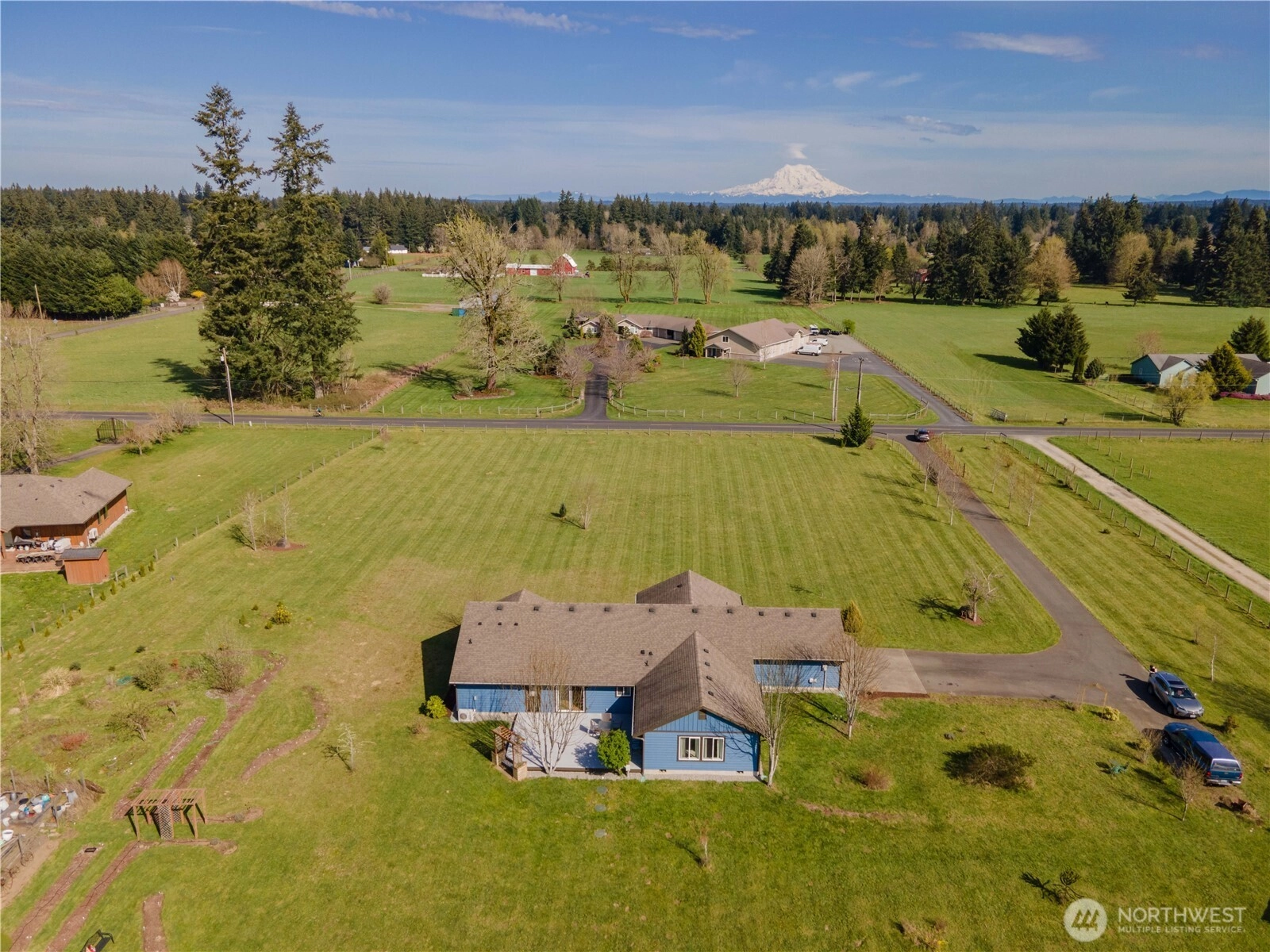 Enjoy single level living in this lovely, open concept home on 5 acres with peak a boo view of Mt. Rainier! Wonderful features including hardwood floors, new carpet in bedrooms, granite slab countertops in all baths and generous kitchen island, walk-in pantry, fabulous trim, energy-efficient ductless heating and cooling, and more! The large primary suite boasts a luxurious 5-piece bath and walk-in closet. Relax on the covered front porch or entertain on the tranquil Trex deck. Meticulously maintained, quality-built home with freshly stained cedar siding, custom gate, asphalt driveway, fully fenced with gardens. Conveniently located to amenities, feels miles away!
