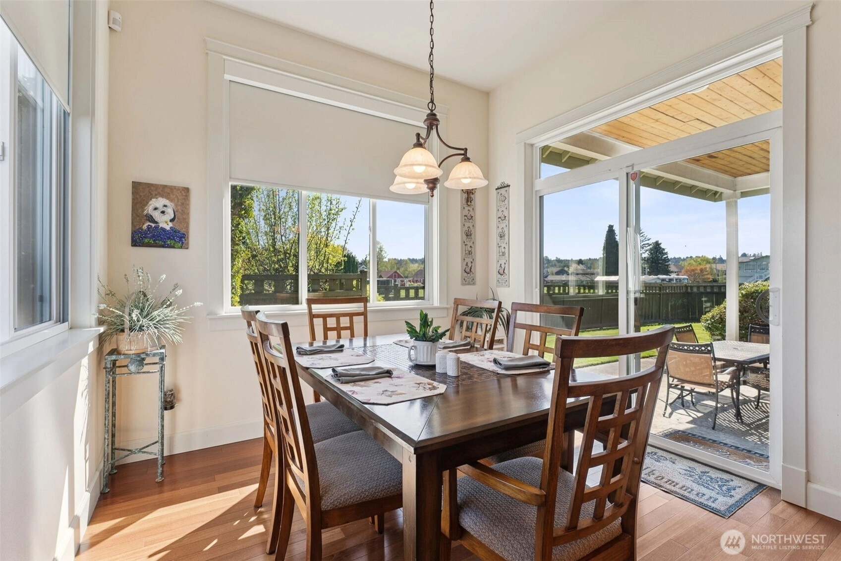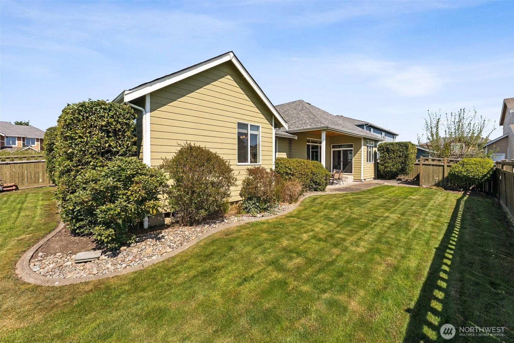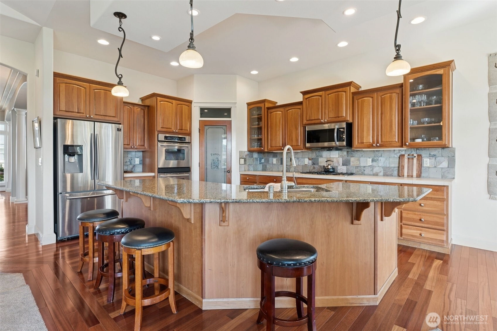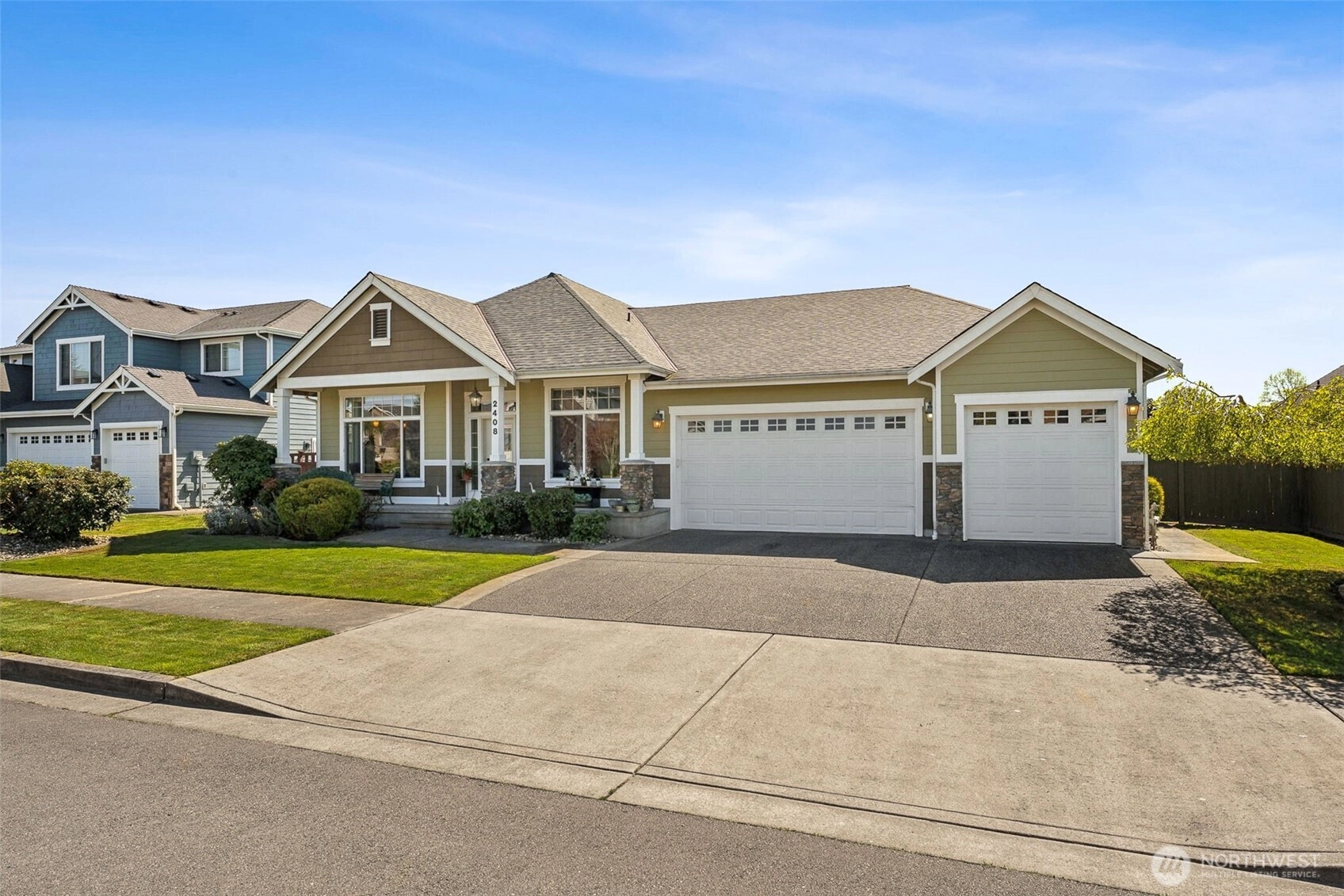 Stunning Custom Rambler in Puyallup Valley, this 3 bedroom / 2.5 bathroom (2431 sq ft) home offers an incredible floor plan. Some of the many features include a formal entry, a dedicated office, Brazilian cherry hardwoods in entry, kitchen & dining area, formal living & family rooms w/ built-ins. Beautiful chef's kitchen, all SS appliances included, oversized island, pantry with eating area, auto blinds in dining and family room. Primary suite is spacious & features built ins in walk in closet. A convenient 3 car garage deep garage w/ man door, large covered stamped patio, lovely landscaping & fully fenced to enjoy year round.Bonus include granite counters, surround sound, new AC, New roof, central vac, 9+ ft ceilings, etc. Truly a gem!