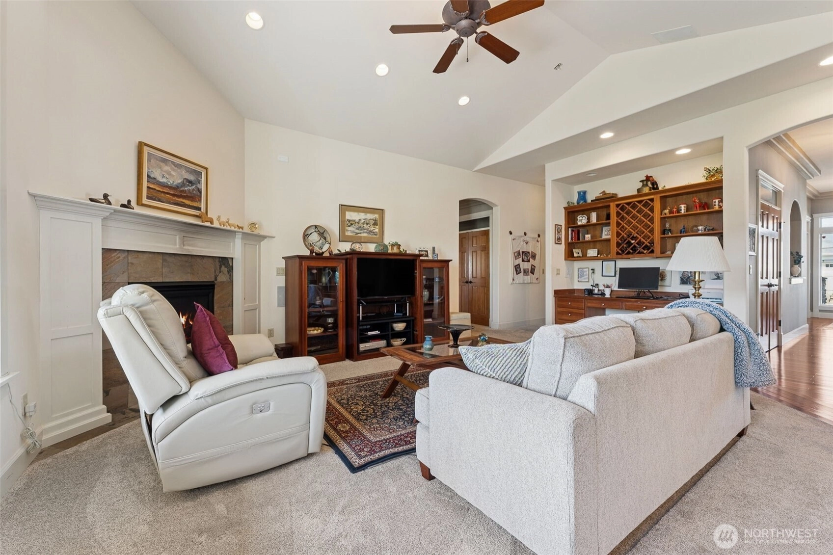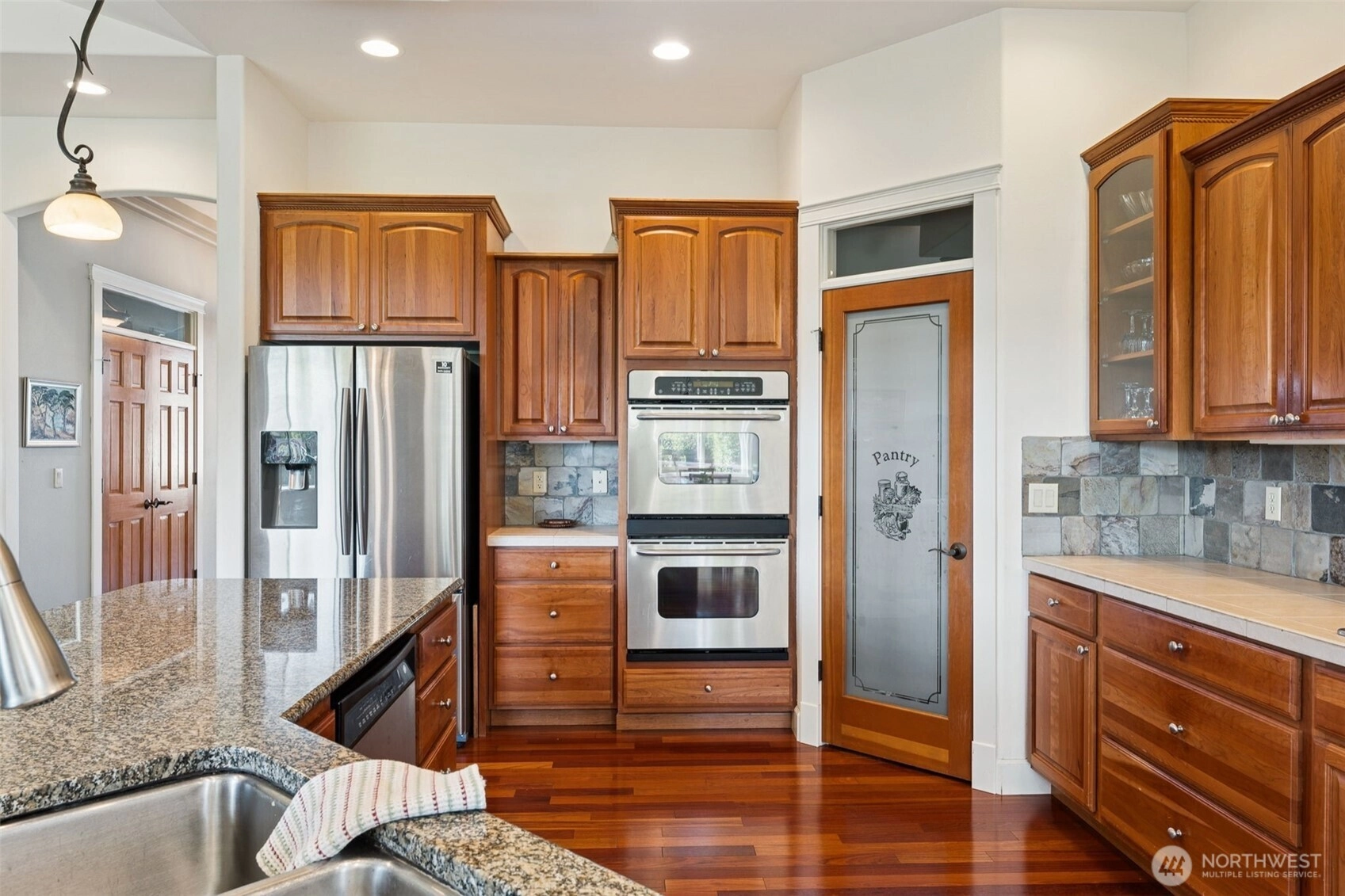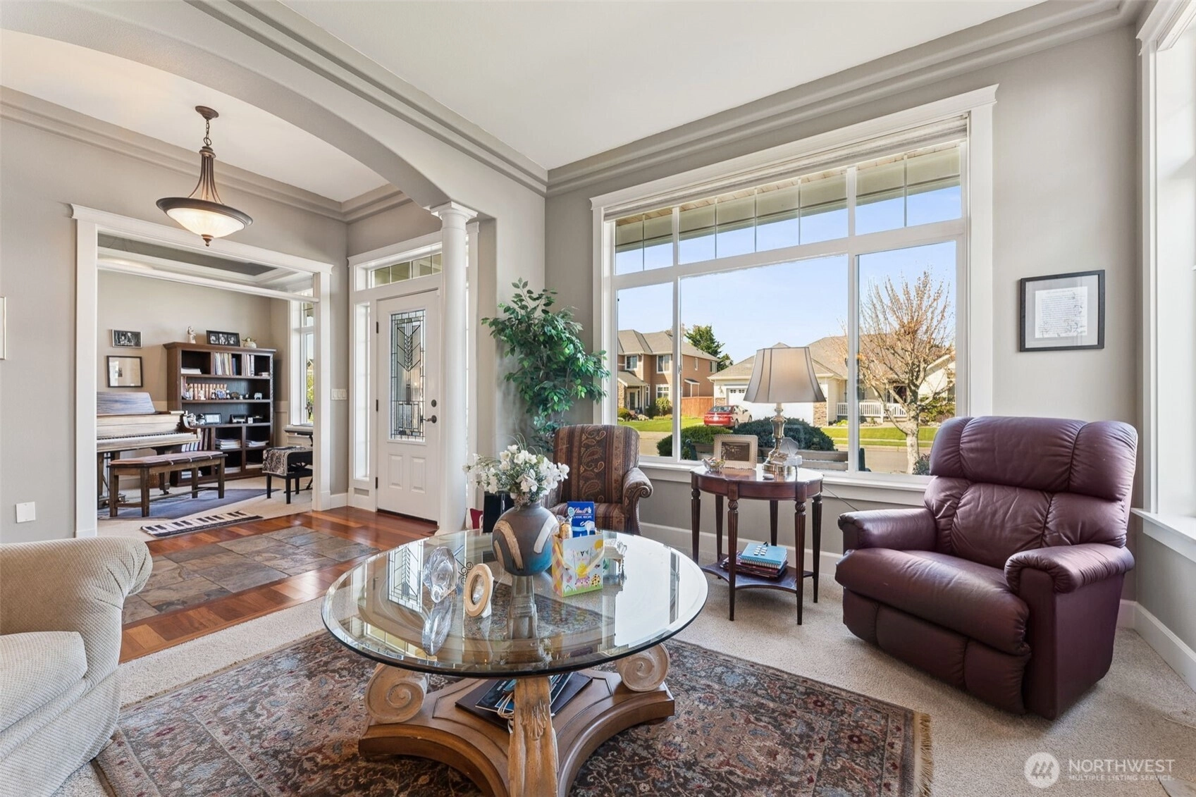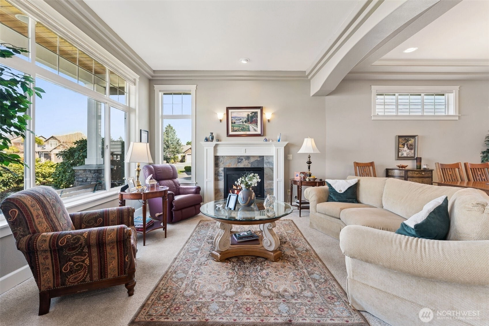 Stunning Custom Rambler in Puyallup Valley, this 3 bedroom / 2.5 bathroom (2431 sq ft) home offers an incredible floor plan. Some of the many features include a formal entry, a dedicated office, Brazilian cherry hardwoods in entry, kitchen & dining area, formal living & family rooms w/ built-ins. Beautiful chef's kitchen, all SS appliances included, oversized island, pantry with eating area, auto blinds in dining and family room. Primary suite is spacious & features built ins in walk in closet. A convenient 3 car garage deep garage w/ man door, large covered stamped patio, lovely landscaping & fully fenced to enjoy year round.Bonus include granite counters, surround sound, new AC, New roof, central vac, 9+ ft ceilings, etc. Truly a gem!