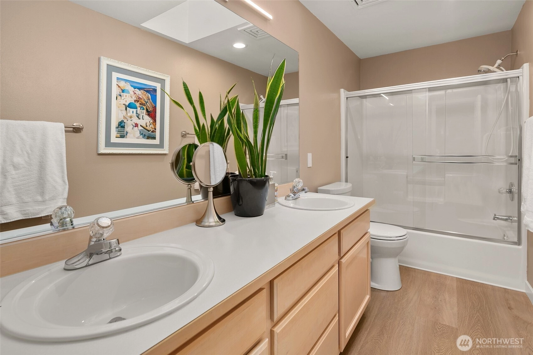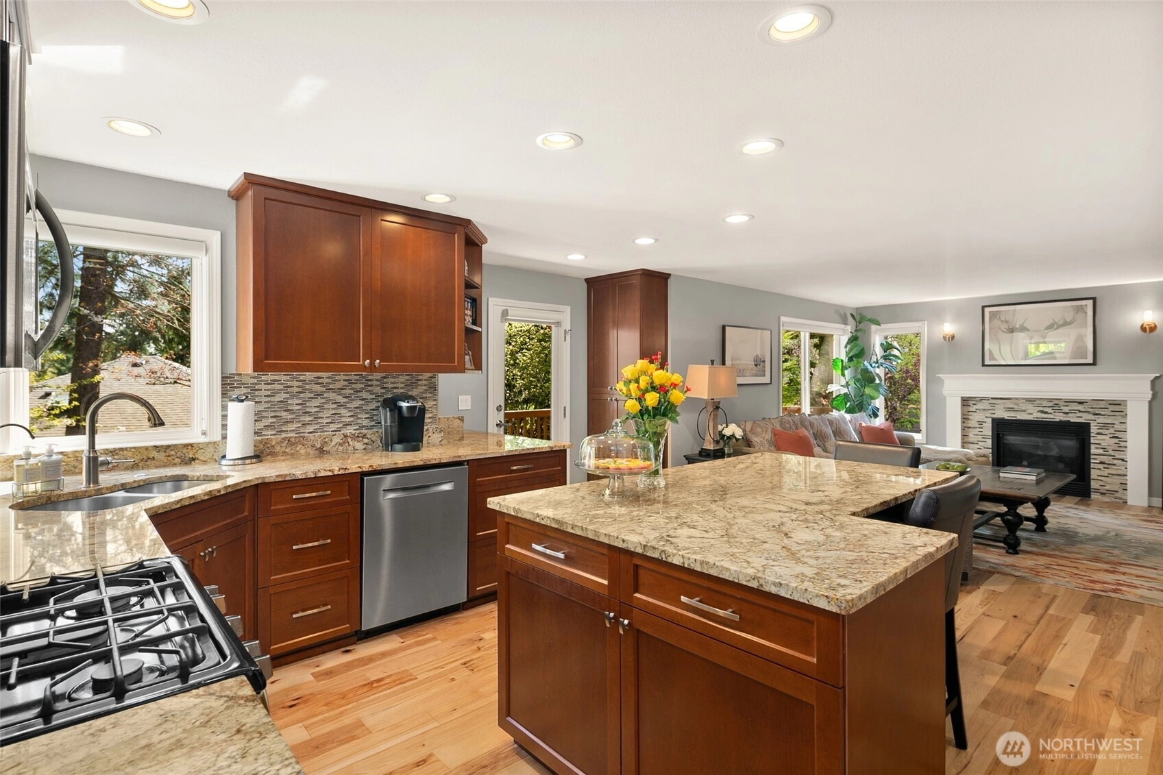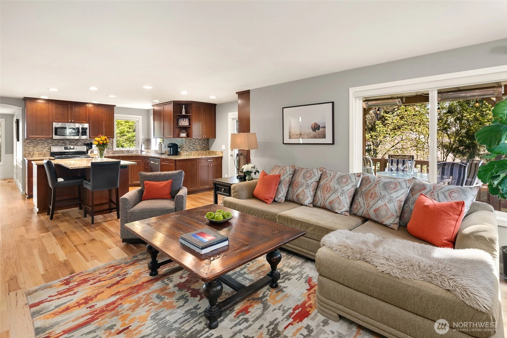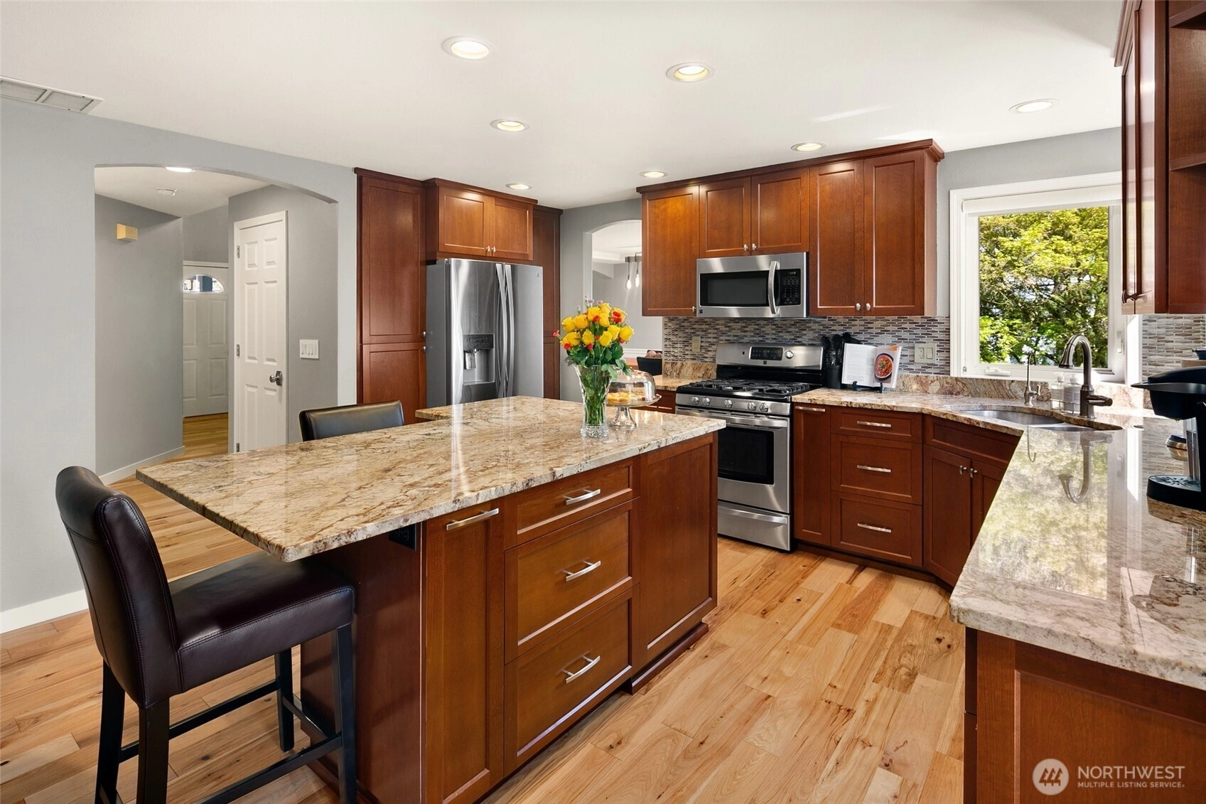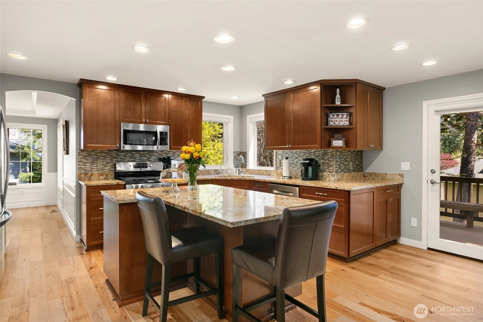 Tucked away in a quiet cul-de-sac in Redmond, just minutes from Microsoft HQ, this beautifully updated home in Rose Hill offers versatile living across three spacious levels. The main floor features an open-concept kitchen with granite counters flowing into a light-filled living room and a deck with outdoor heaters—perfect for year-round entertaining. Upstairs, the large primary suite is joined by 3 additional bedrooms and a full bath. The daylight basement includes a second living area, wine storage, the 5th bedroom, and full bath—ideal for guests or multigenerational living. Enjoy central A/C, a 3-car garage, shed, and a new fully fenced yard with space for a fire pit and mature landscaping. Minutes to downtown Redmond and Kirkland!