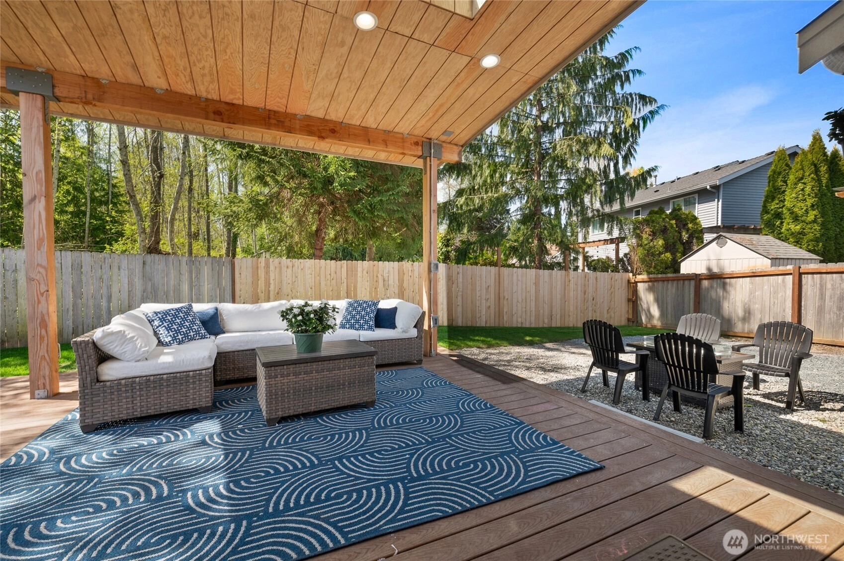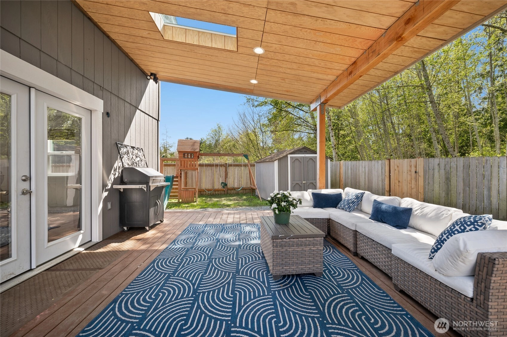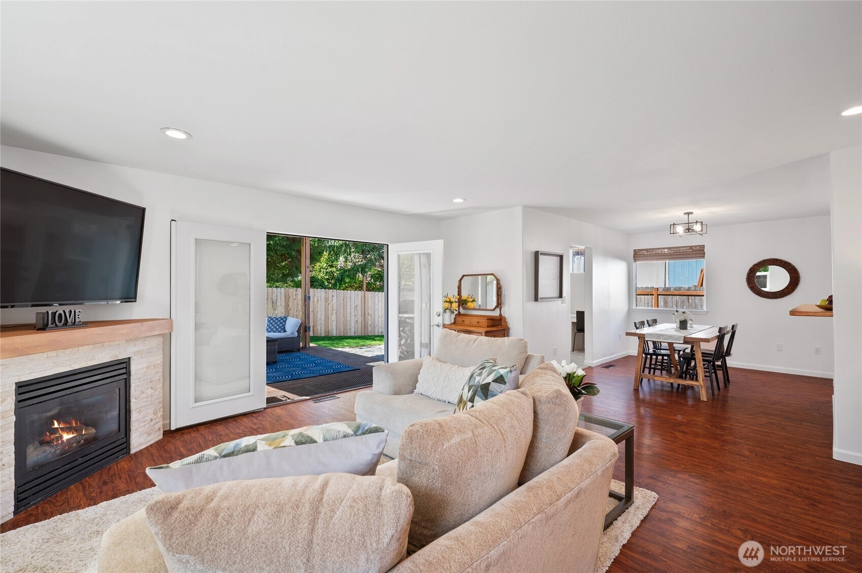 Charming, updated & lovingly maintained 3-bedroom/2.5-bath home in the desirable & quiet Lake Stevens "Noble Court" neighborhood. A spacious open-concept light/bright living area has a gas fireplace & French doors that open to a beautiful covered 16x17 deck that backs to a lush green belt bringing the outdoors in. The fully fenced yard offers a garden area, play toy & shed. An office is located just off the dining area. Vaulted ceilings, ceiling fan, walk-in closet & 5-pc bath in the Primary Suite. Two other upstairs bedrooms share a Jack & Jill bath. Other extras: new paint inside/out, additional parking on north side of house, etc. A/C, a community park, close to all amenities, Lake Stevens & Sunset Beach! A real gem not to be missed!
