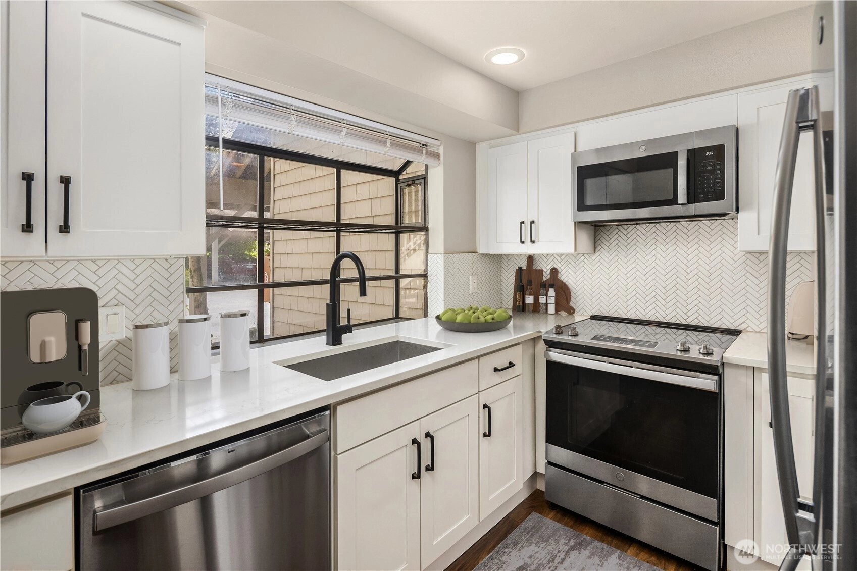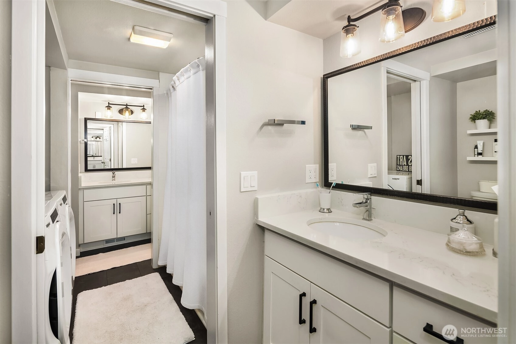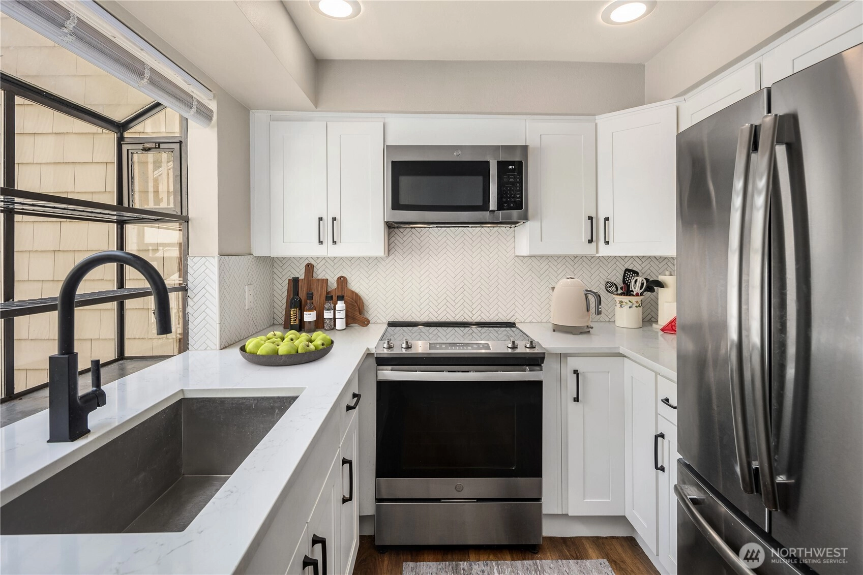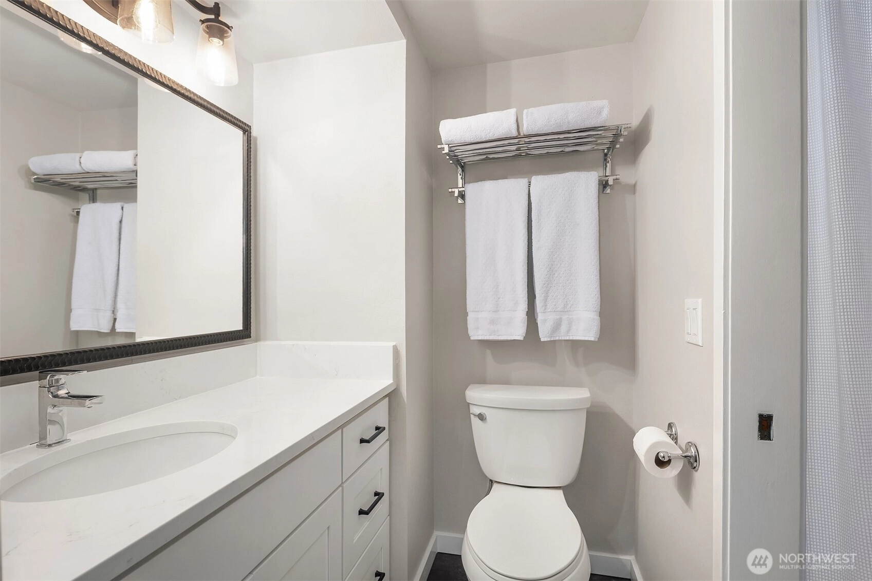 Welcome to Village Park Condominiums! This charming main-level unit offers convenient, stair-free living with 2 bedrooms, 1 full bath, and in-unit washer & dryer. Enjoy the comfort of an updated kitchen and bathroom, along with ample storage and two reserved parking spots. Step onto your private balcony and take in the peaceful greenbelt views—your own quiet retreat. Centrally located near Yarrow and Houghton, with easy access to I-405 and 520, you're just minutes from downtown Kirkland, Bellevue, and a quick commute to Seattle. HOA includes Water, Sewer, Garbage, Cable & Common Area Maintenance. This is the ideal blend of location, comfort, and convenience.