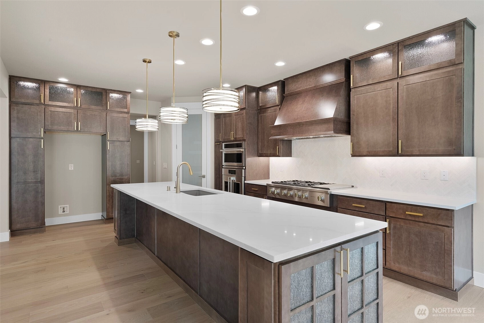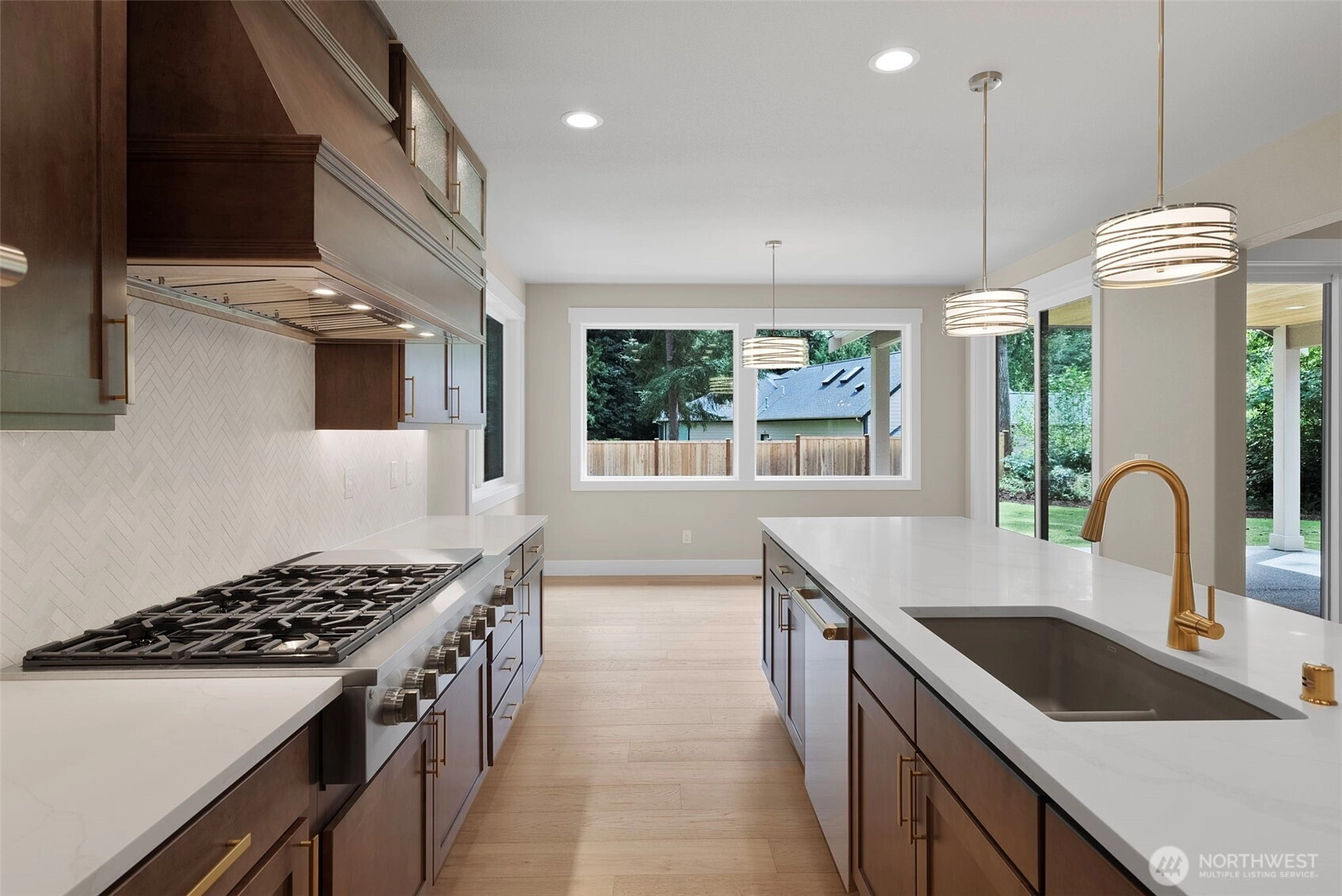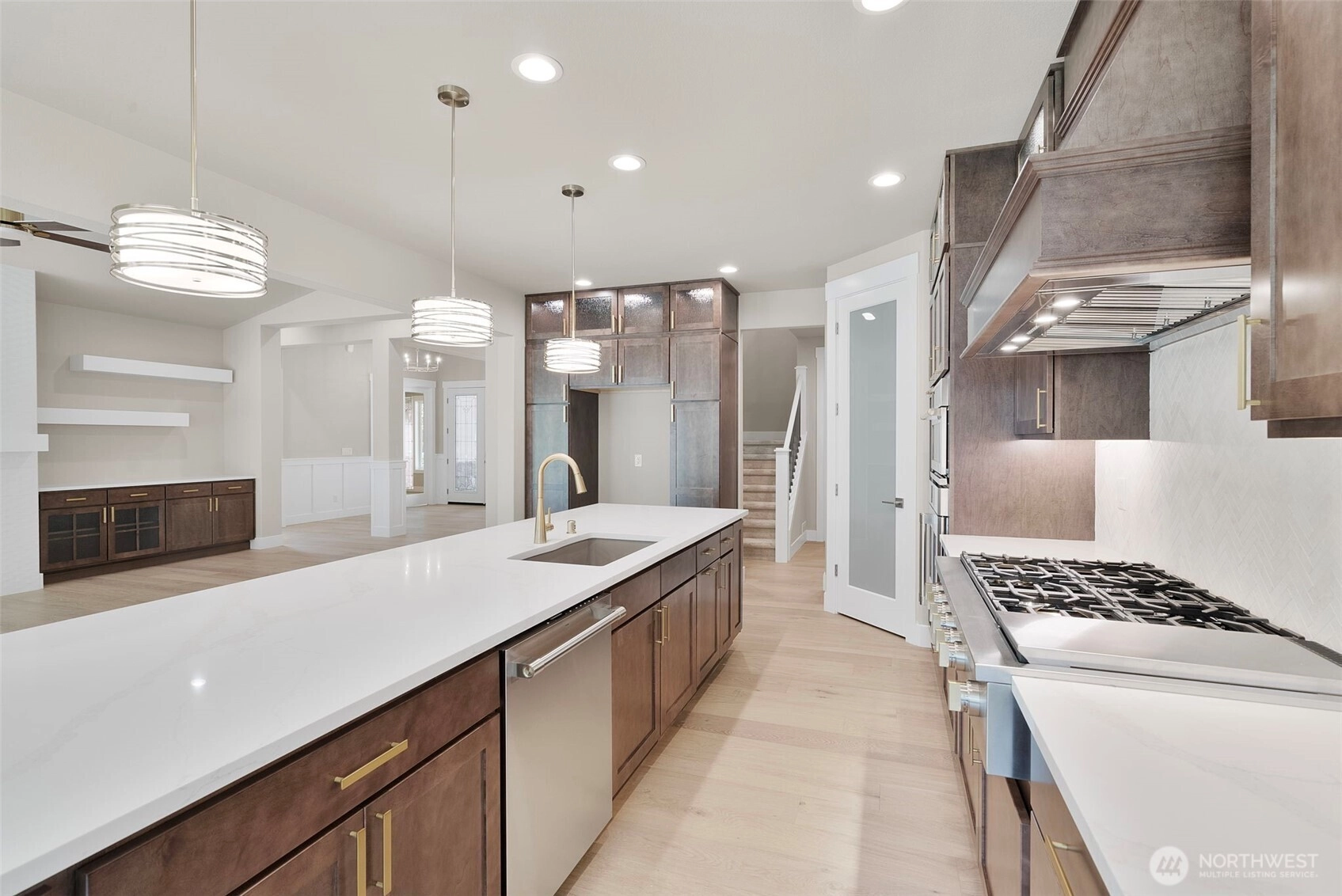 Rob Rice Homes presents another exceptional new construction home in West Oly, beautifully situated on a nearly acre corner lot. Designed with high-end finishes, every space reflects thoughtful craftsmanship—from elegant wainscoting to the gourmet kitchen featuring Cocoa maple cabinetry and premium Monogram appliances. The main-floor primary offers a spa-like retreat with a full tile shower and dual walk-in closets. A split-bedroom layout provides privacy, with two additional bedrooms, a den, and a ¾ bath on the opposite side of the home. Upstairs, you'll find a rec room, bonus room, full bath, and a stylish bar area with beverage cooler. Landscaped and irrigated around the home!