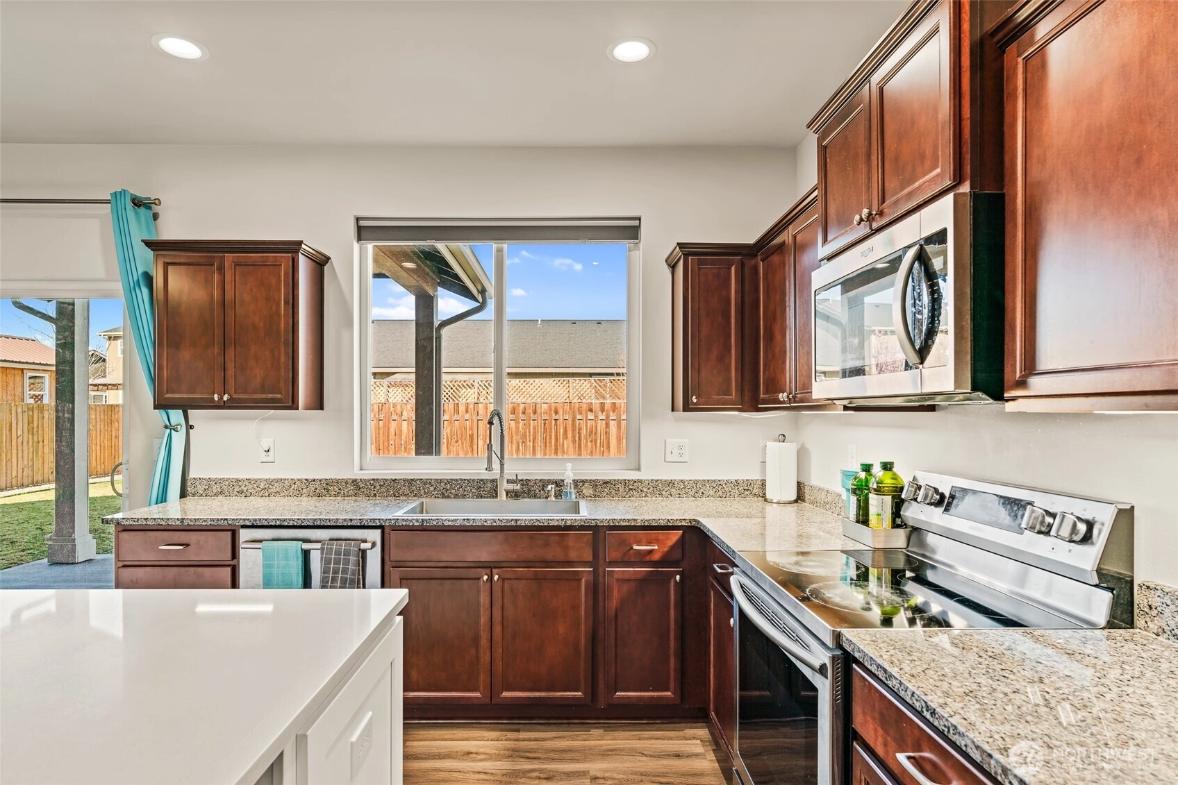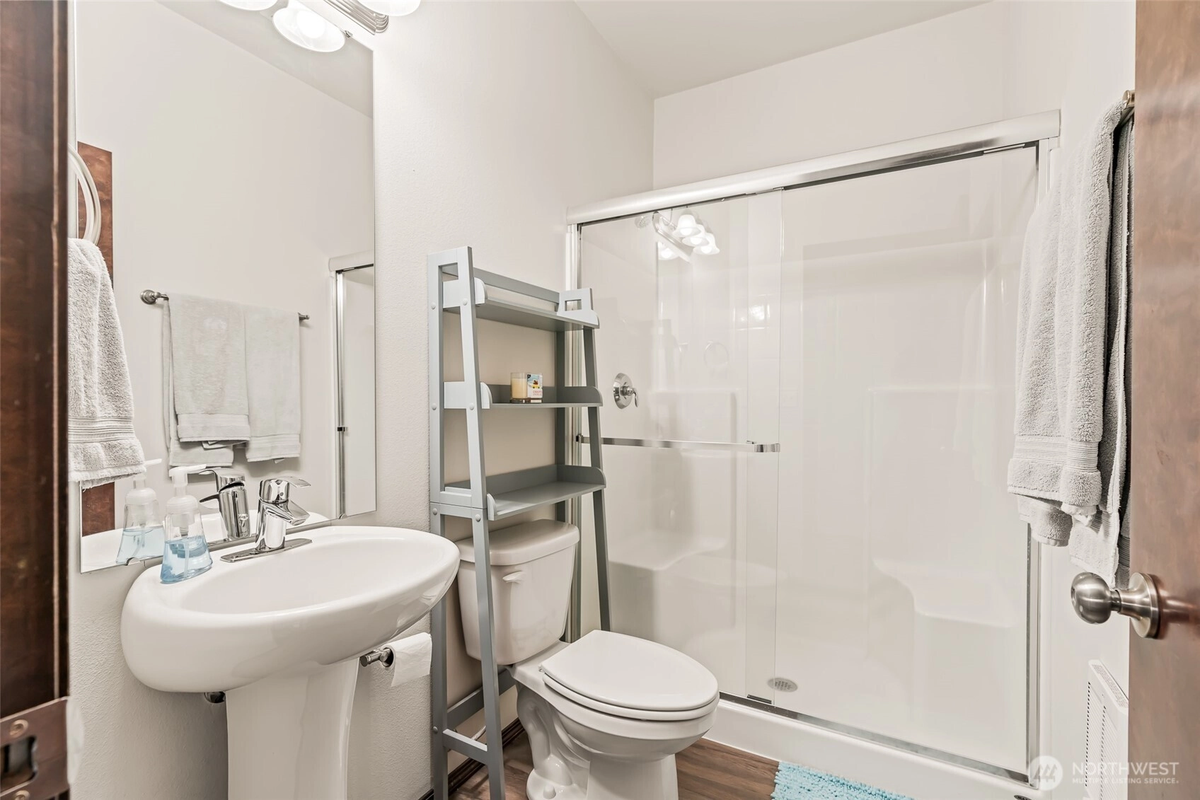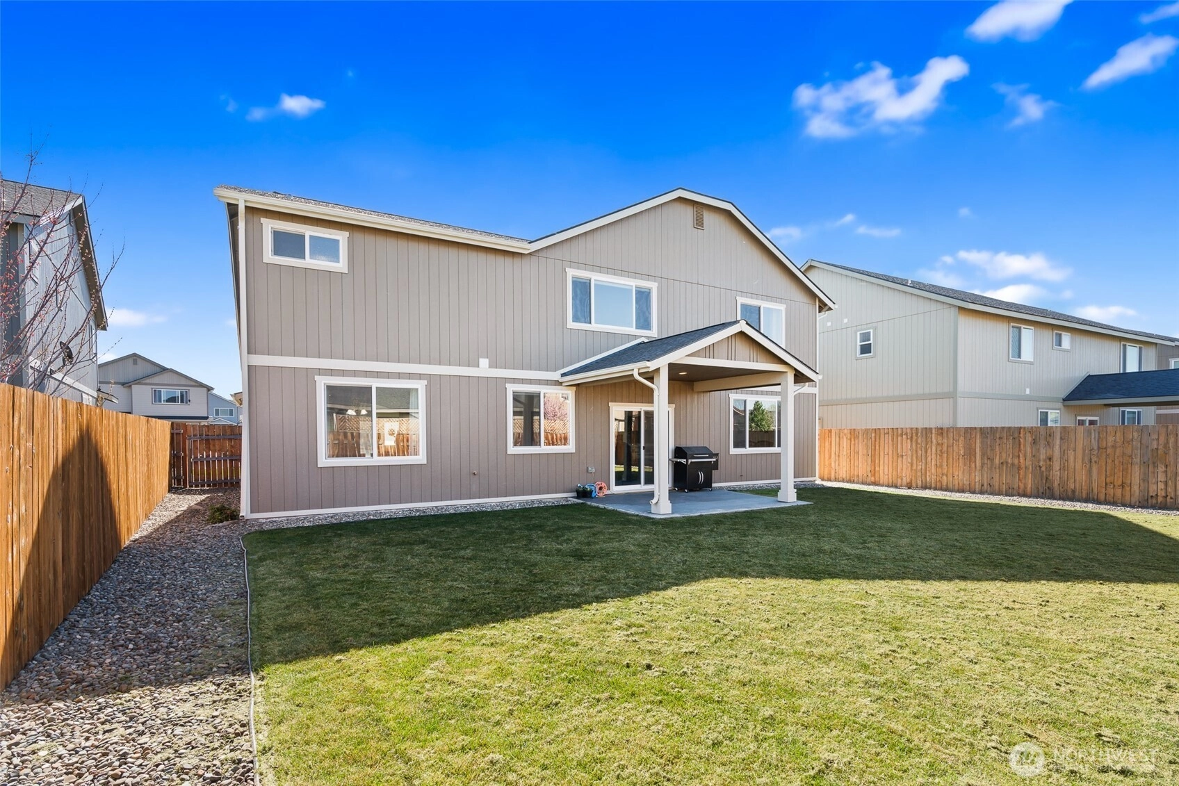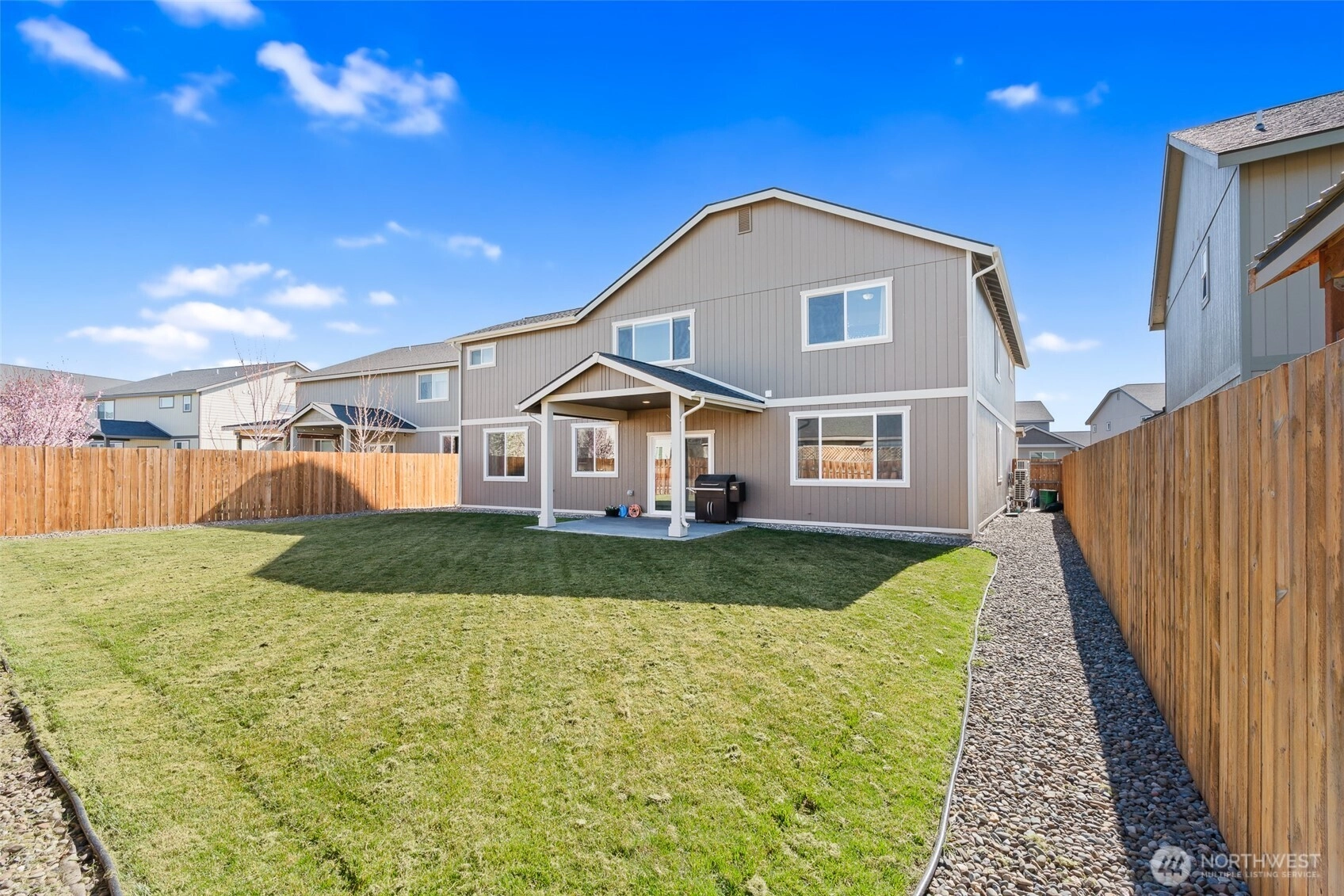 Step into exceptional space and comfort in Currier Creek’s largest floorplan! This 3,333 sq ft home features 5 bedrooms, including a main-floor guest room, bathroom with shower, 2 living areas, and a spacious upstairs bonus room. A grand entry with sweeping staircase opens to an airy layout and a chef-inspired kitchen with under-cabinet lighting, stainless farm sink, Bosch dishwasher, quad-door fridge/freezer, walk-in pantry, and 8-ft quartz island with outlets and seating for 4. Upstairs offers a versatile landing, luxurious primary suite, 3 guest rooms, full bath, a bonus room and laundry room. This home is completed with a large fenced yard, covered patio, and 3-car garage.