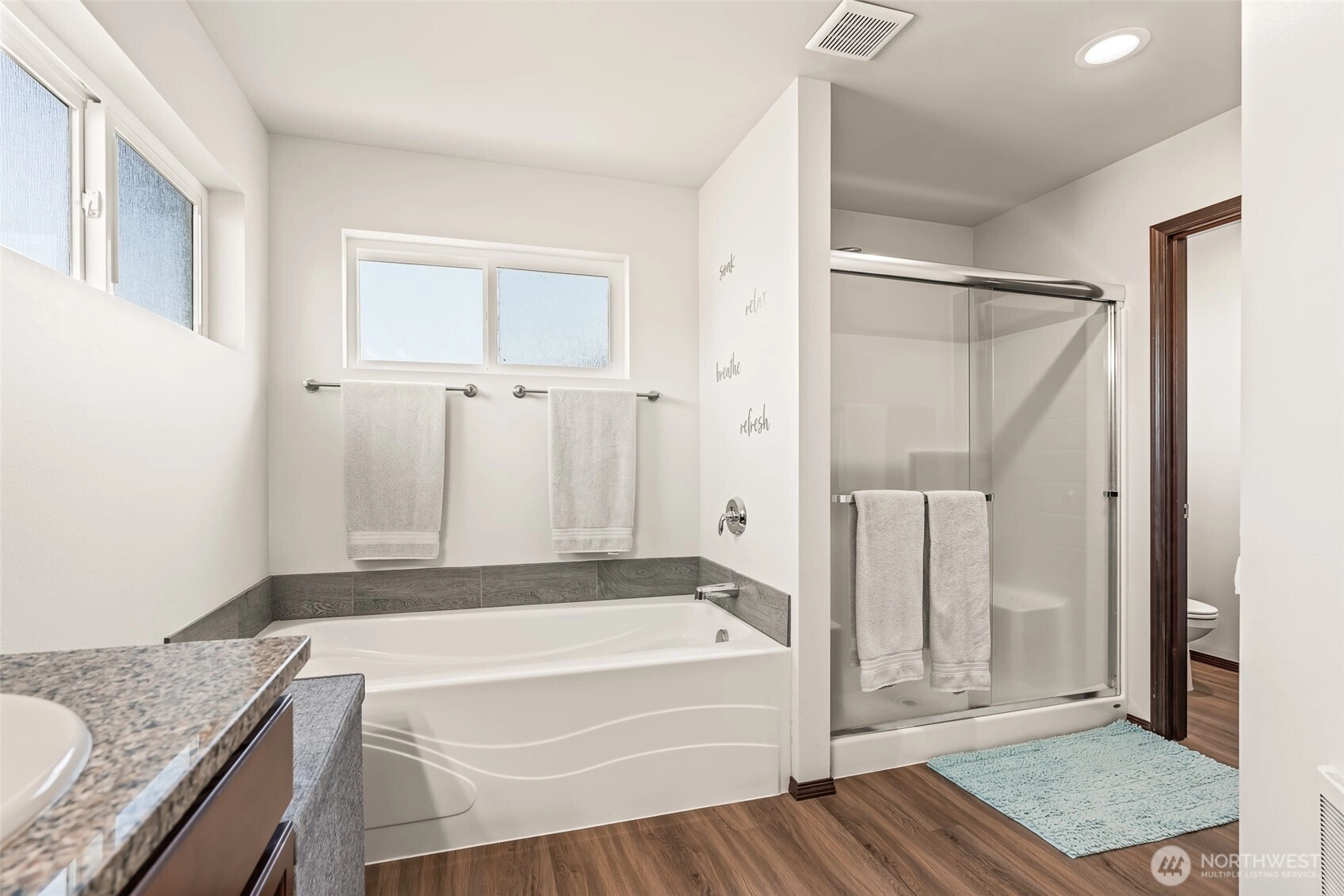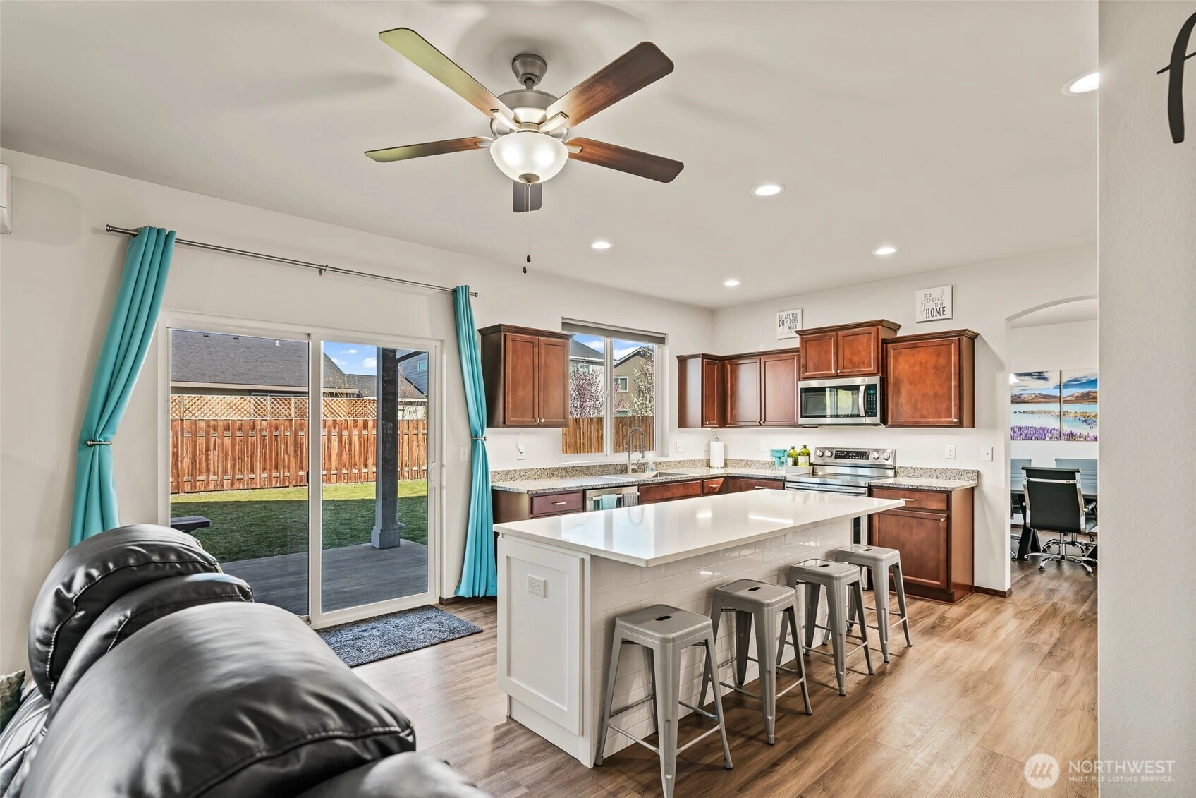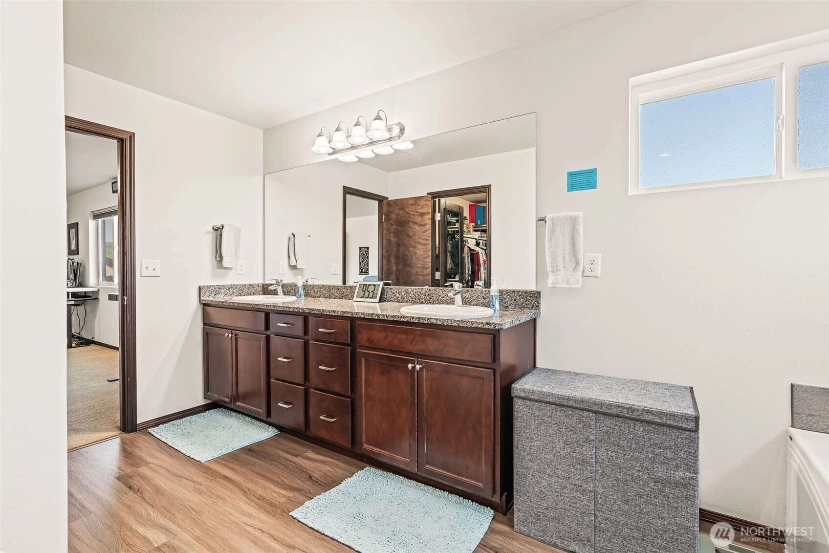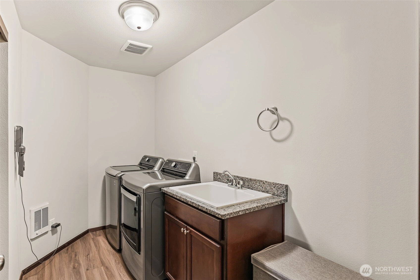 Step into exceptional space and comfort in Currier Creek’s largest floorplan! This 3,333 sq ft home features 5 bedrooms, including a main-floor guest room, bathroom with shower, 2 living areas, and a spacious upstairs bonus room. A grand entry with sweeping staircase opens to an airy layout and a chef-inspired kitchen with under-cabinet lighting, stainless farm sink, Bosch dishwasher, quad-door fridge/freezer, walk-in pantry, and 8-ft quartz island with outlets and seating for 4. Upstairs offers a versatile landing, luxurious primary suite, 3 guest rooms, full bath, a bonus room and laundry room. This home is completed with a large fenced yard, covered patio, and 3-car garage.