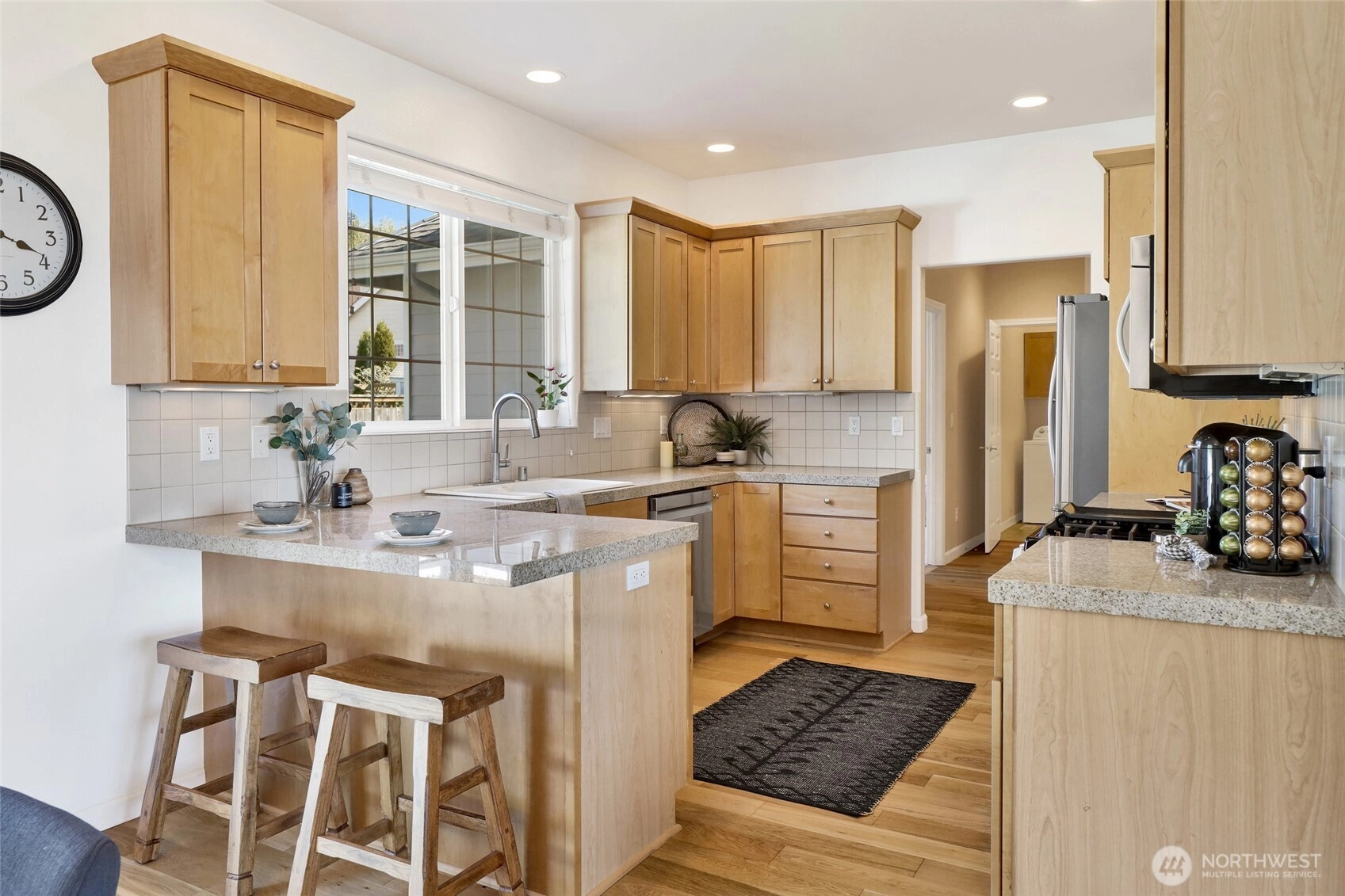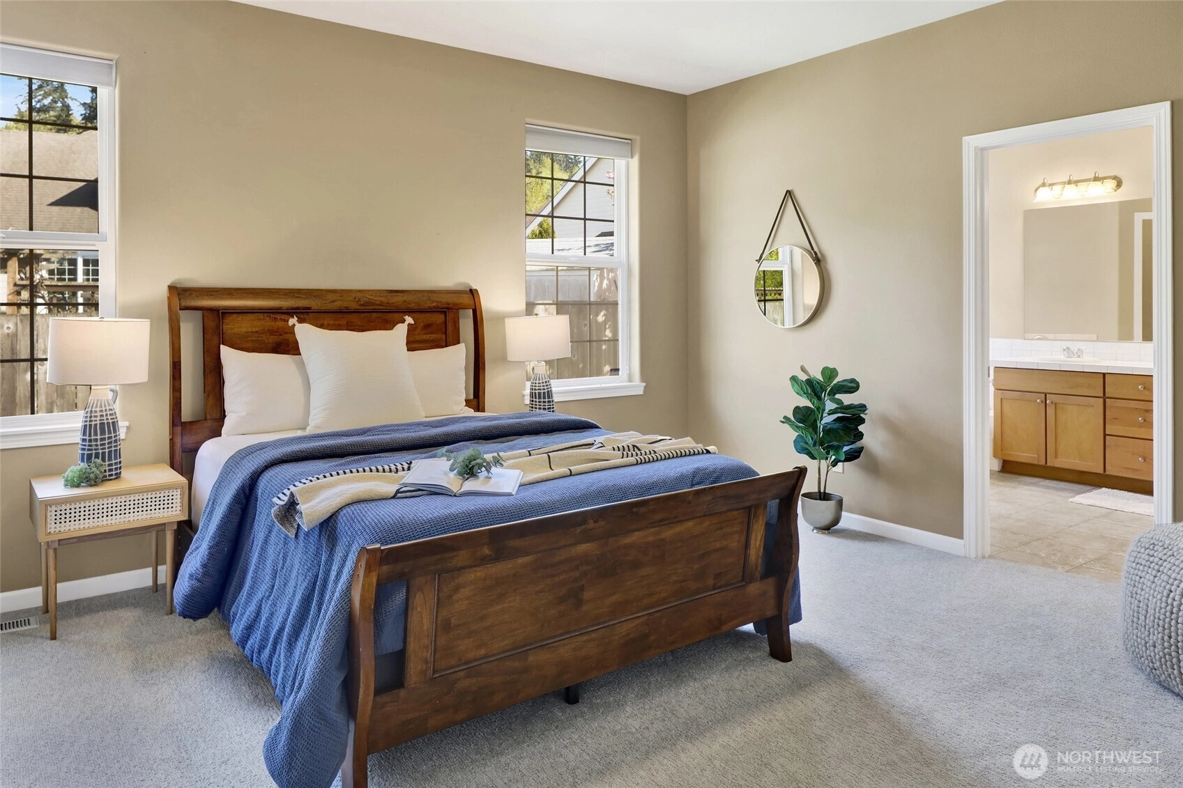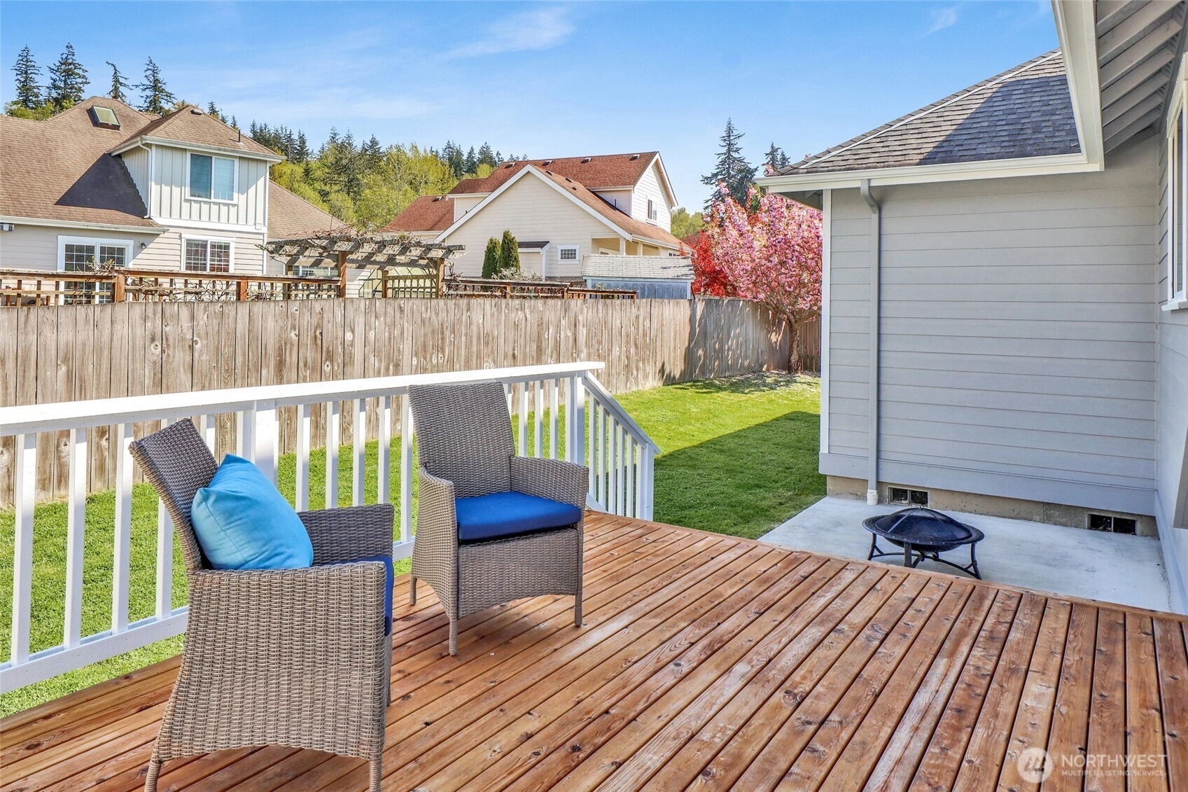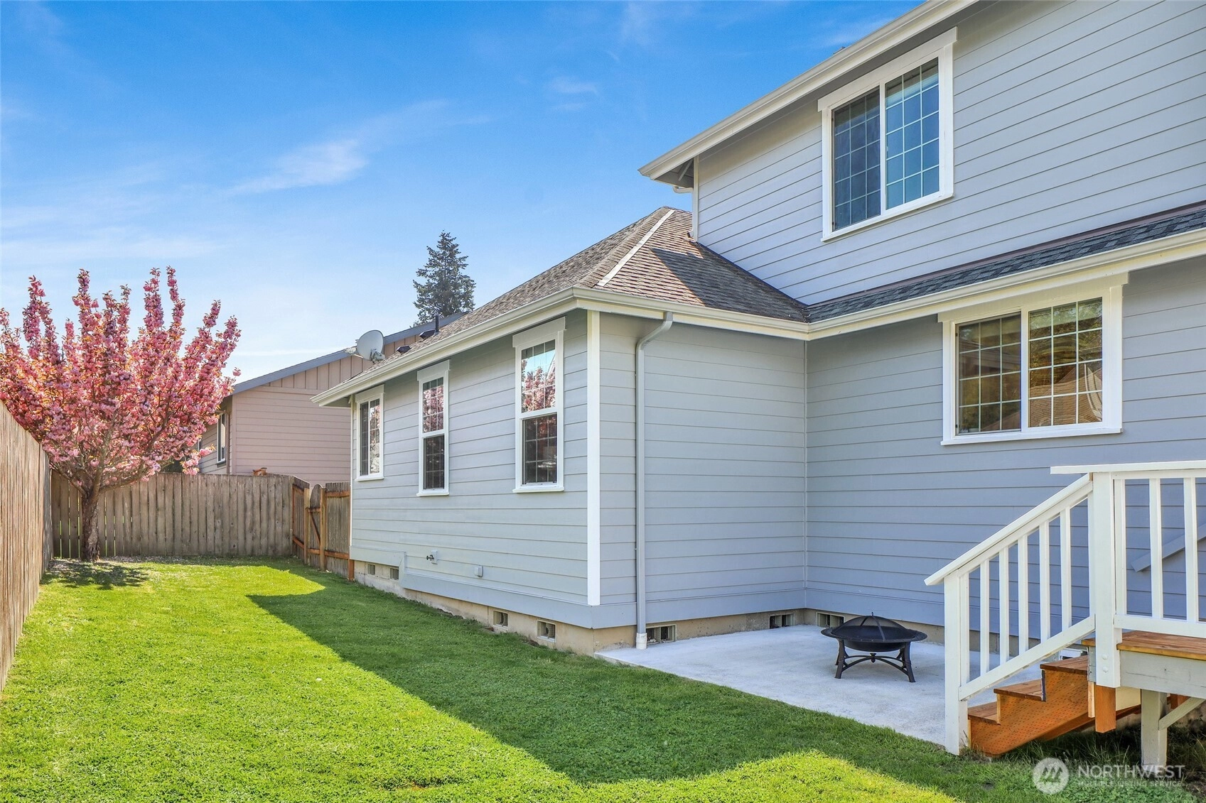 A quick stroll to Whole Foods, the Aquatic Center, Sportsplex & dining, this beautiful turnkey home sits quietly nestled in the Puget neighborhood. Thoughtfully designed & updated throughout with new hardwoods & carpet, the main level includes a versatile front room—ideal as an office, guest space, or den—an open living room with gas fireplace flowing into the dining area & kitchen with granite countertops, updated stainless appliances & walk-in pantry. The generous main level primary features a 5-piece en-suite & walk-in closet. Upstairs are two more bedrooms & a full bath. Outside: beautifully refreshed exterior paint, new decking & a recently poured patio (hot tub rated). The fully fenced backyard with cherry tree to add seasonal charm.