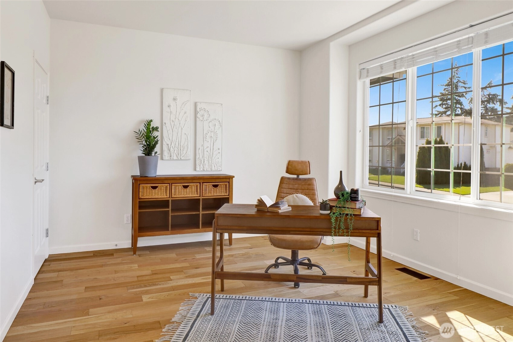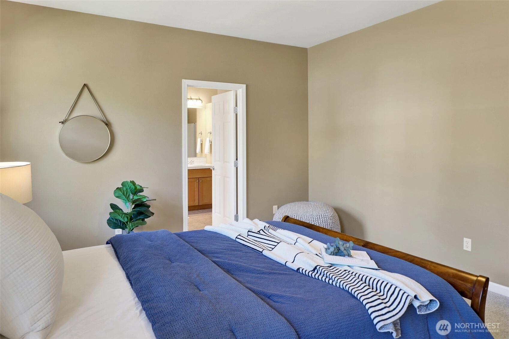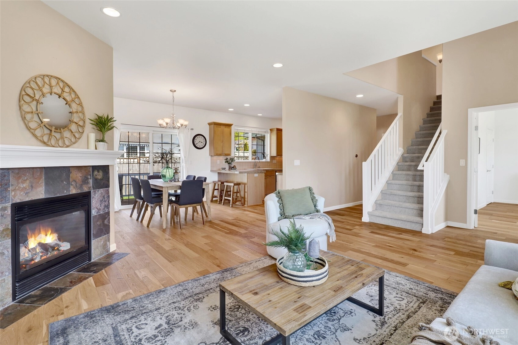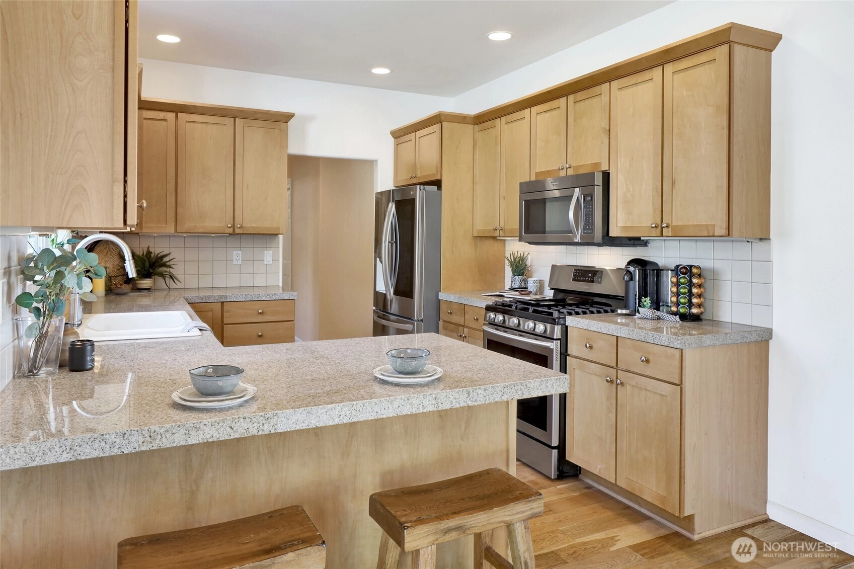 A quick stroll to Whole Foods, the Aquatic Center, Sportsplex & dining, this beautiful turnkey home sits quietly nestled in the Puget neighborhood. Thoughtfully designed & updated throughout with new hardwoods & carpet, the main level includes a versatile front room—ideal as an office, guest space, or den—an open living room with gas fireplace flowing into the dining area & kitchen with granite countertops, updated stainless appliances & walk-in pantry. The generous main level primary features a 5-piece en-suite & walk-in closet. Upstairs are two more bedrooms & a full bath. Outside: beautifully refreshed exterior paint, new decking & a recently poured patio (hot tub rated). The fully fenced backyard with cherry tree to add seasonal charm.