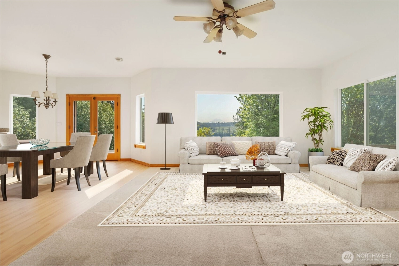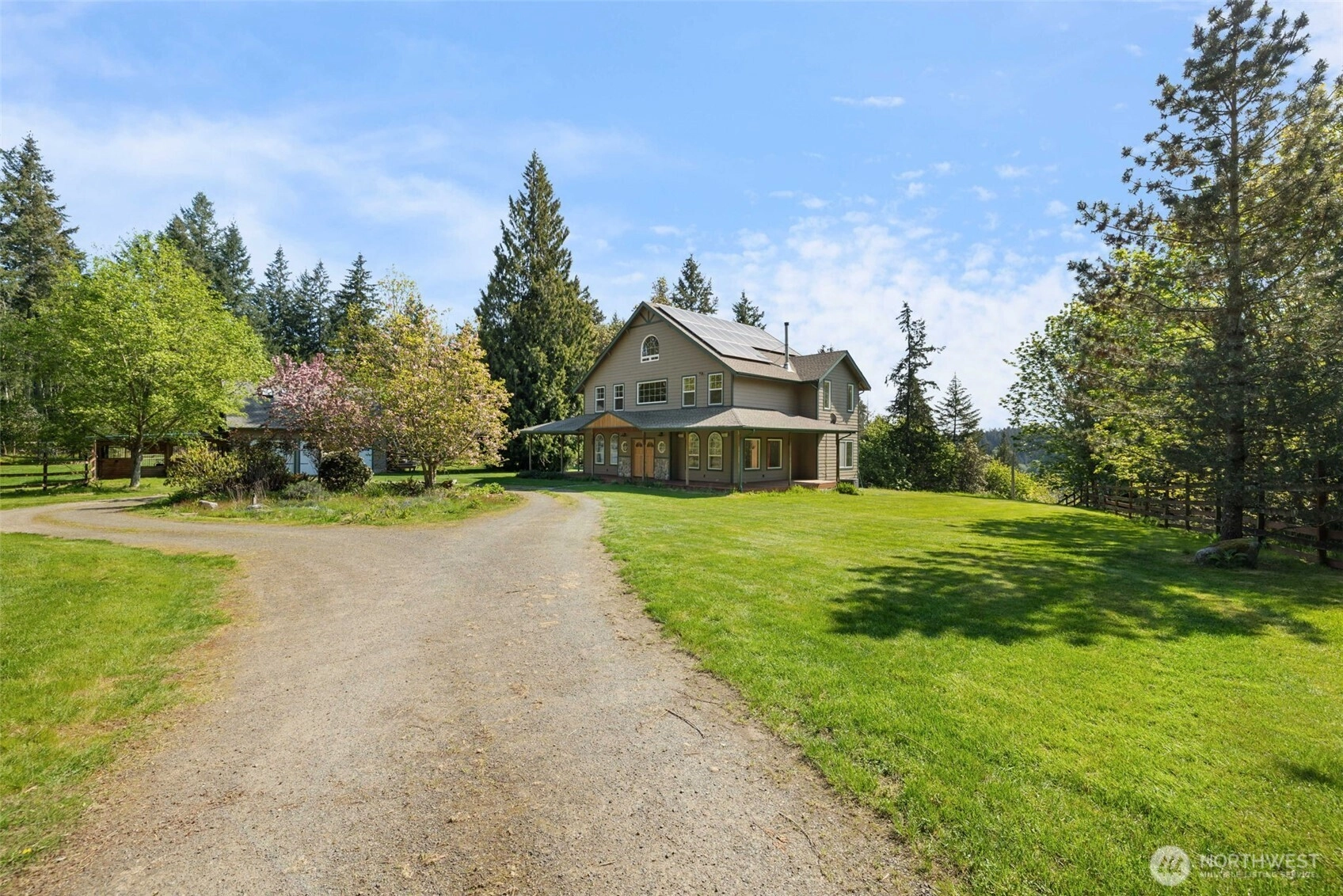 This property has it all: sweeping views of majestic Mt Rainier and the serene South Sound, beach access, bonus lot & an equestrian property all in one package. 4 bedroom 3 story house nestled on a private 2.5 acres. This custom home interior features: new LVP flooring and new carpet, new windows\ & fresh interior paint. Exterior features include detached 2-car garage with a 450 studio. 2.5 acres are fenced and cross fenced, 2 stalls and 2 separate pastures and an orchard. Solar panels for reduced power bills. Expansive front and back porches. Back porch tiger wood. A true country estate in Lakebay WA. Owner Financing available. An additional 2.5 acres available at additional price.