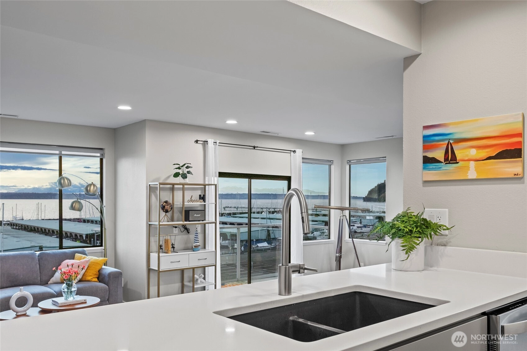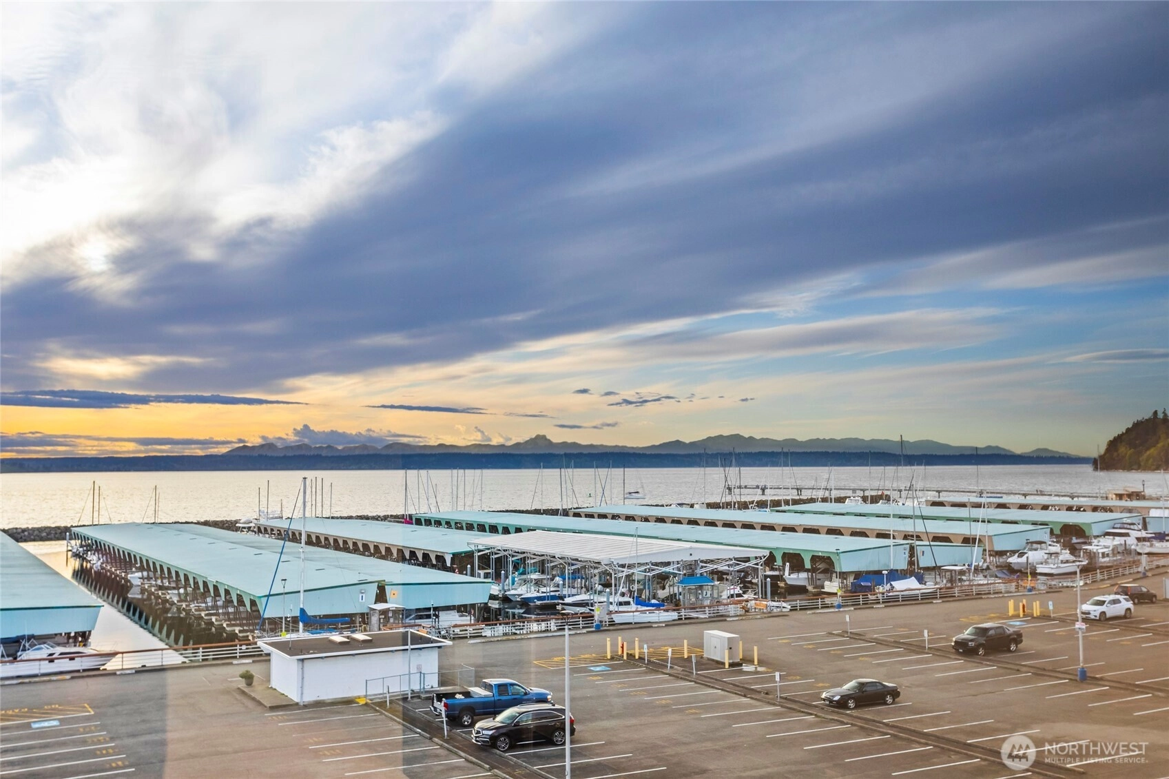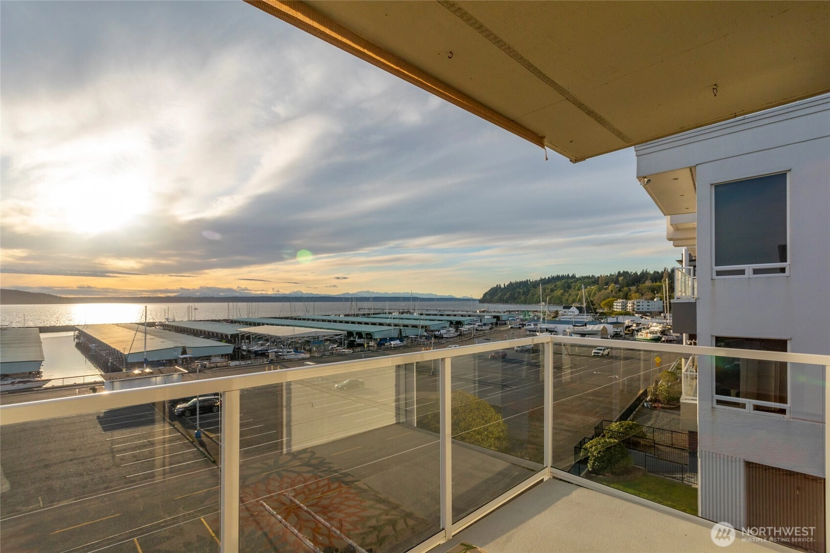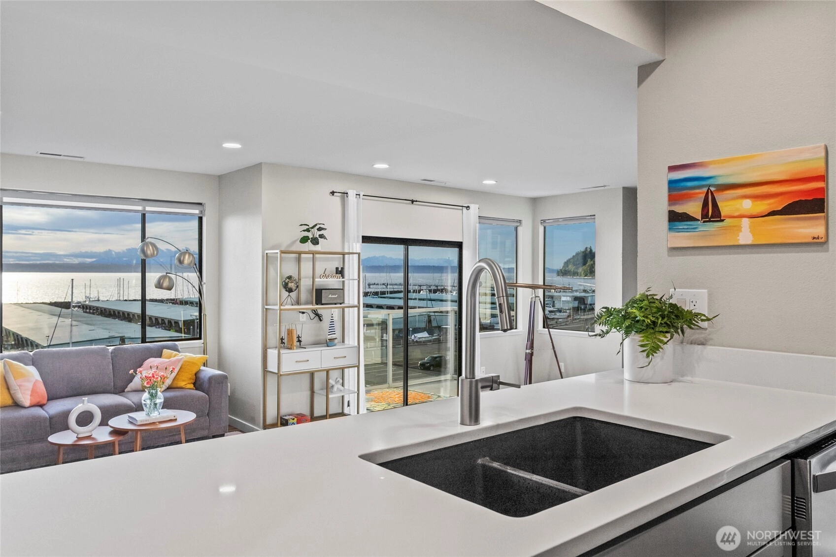 Stunning Penthouse end unit condo. Panoramic views of Des Moines Marina, Puget Sound and Cascade Mtns. Meticulously updated throughout with local interior designer. Quartz countertops w/undermount kitchen sink and stainless appliances. Tinted windows to cut down on UV and heat, central ac to keep you cool. No shared common walls! Primary bathroom features heated floors, walk in closet, lots of storage, double vanity with makeup area w/lighted mirror. Custom walk in shower w/full tile and glass. 2nd bedroom features a murphy bed with storage. Close walking distance to the beach, marina, or the downtown shops/restaurants. Take in the beautiful sunsets from this condo. HOA includes high speed internet, cable, water, sewer and garbage.