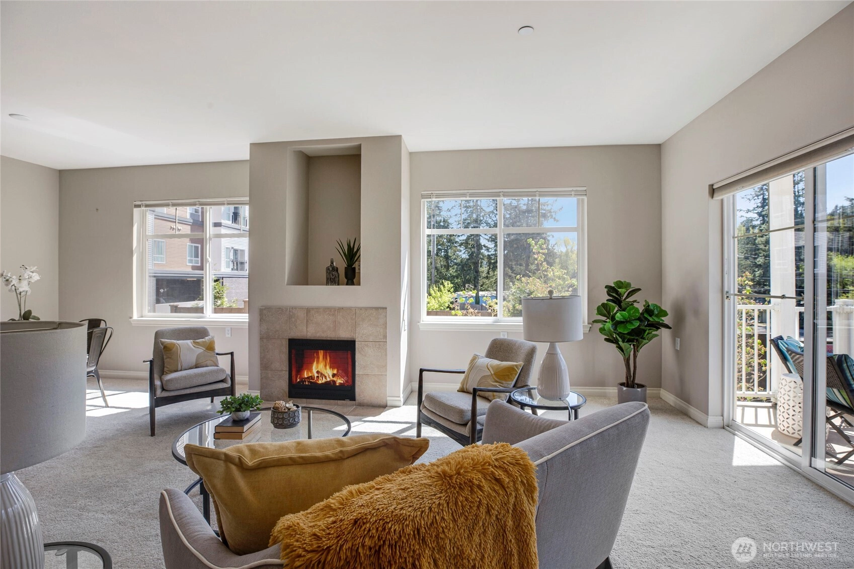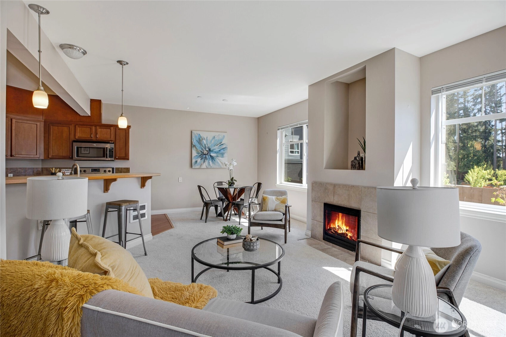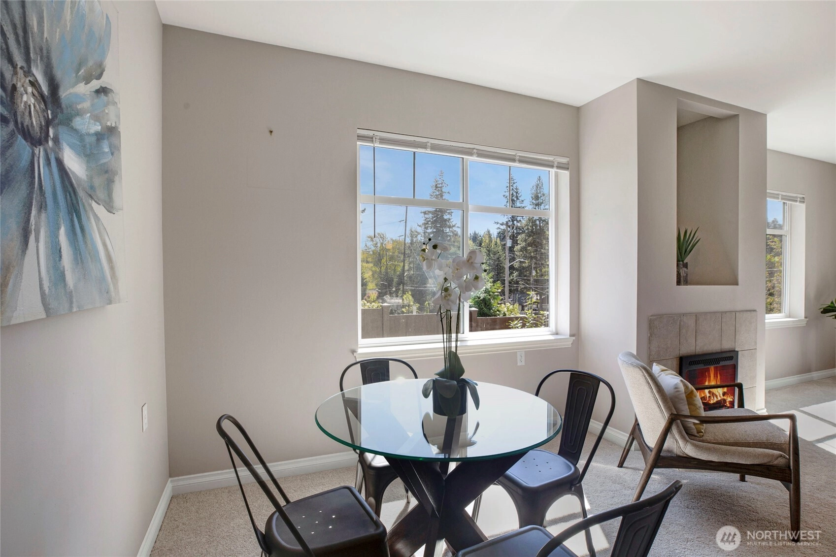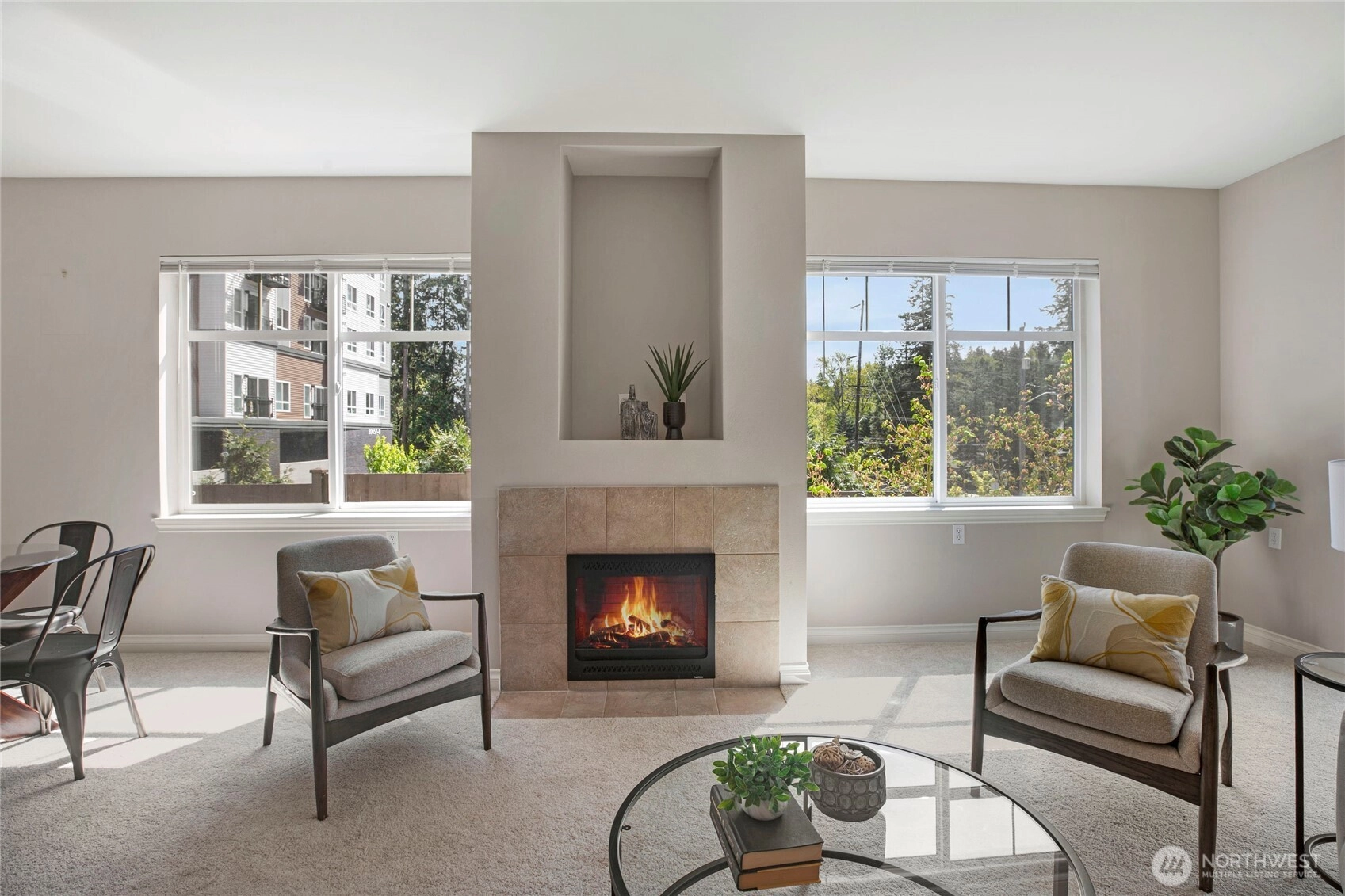 Experience modern elegance in this rare front-facing corner unit, bathed in natural light and boasting a spacious, open floor plan. The great room concept flows seamlessly, featuring a bright, clean interior with a cozy fireplace at its heart. The large kitchen includes stainless steel appliances, ample counter space, and a built-in computer desk. Enjoy meals in the separate dining area with a large window that invites plenty of natural light. The expansive primary suite offers a serene retreat. Located in a prime area with quick access to I-5, Edmonds and Shoreline. The secure building includes two parking spaces and extra storage. Steps away from parks, shopping, and dining, it’s the perfect blend of comfort & convenience.