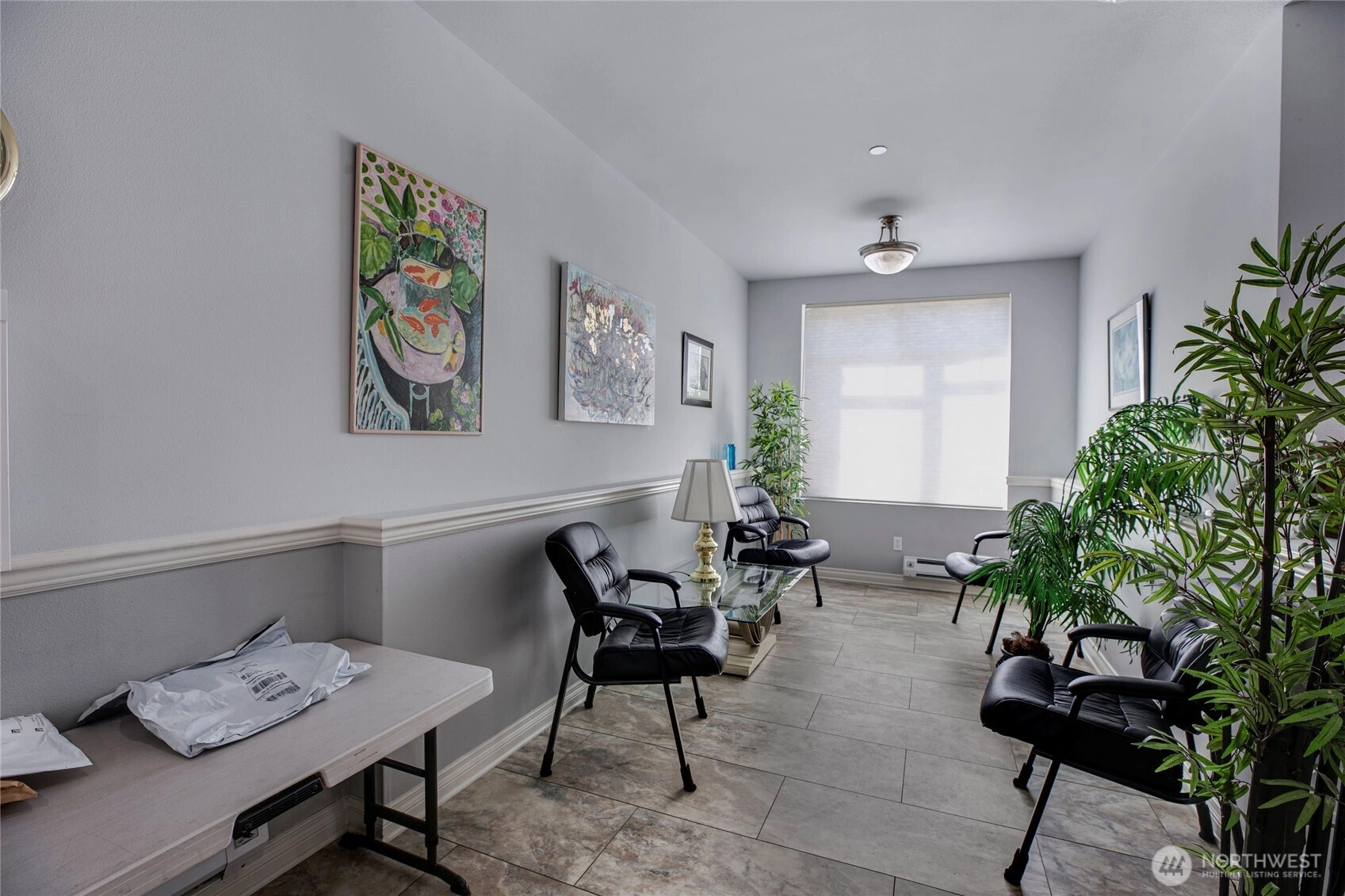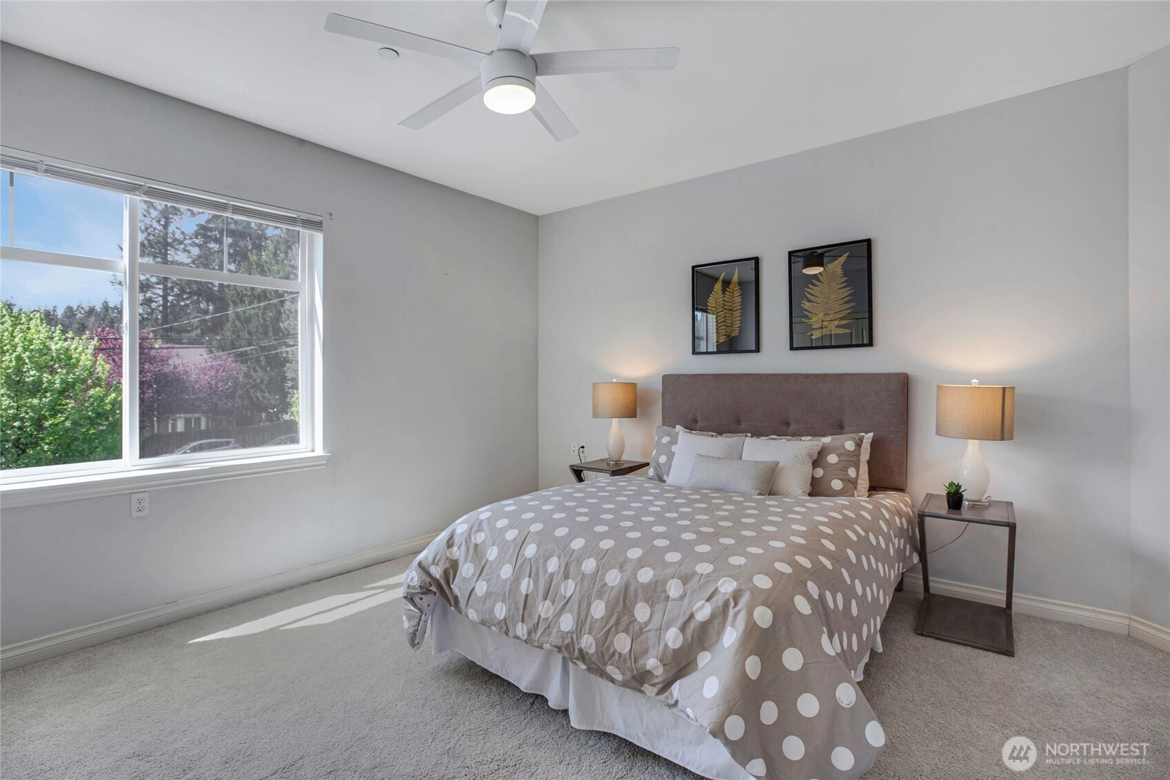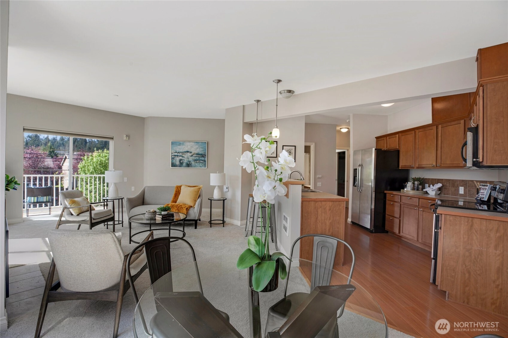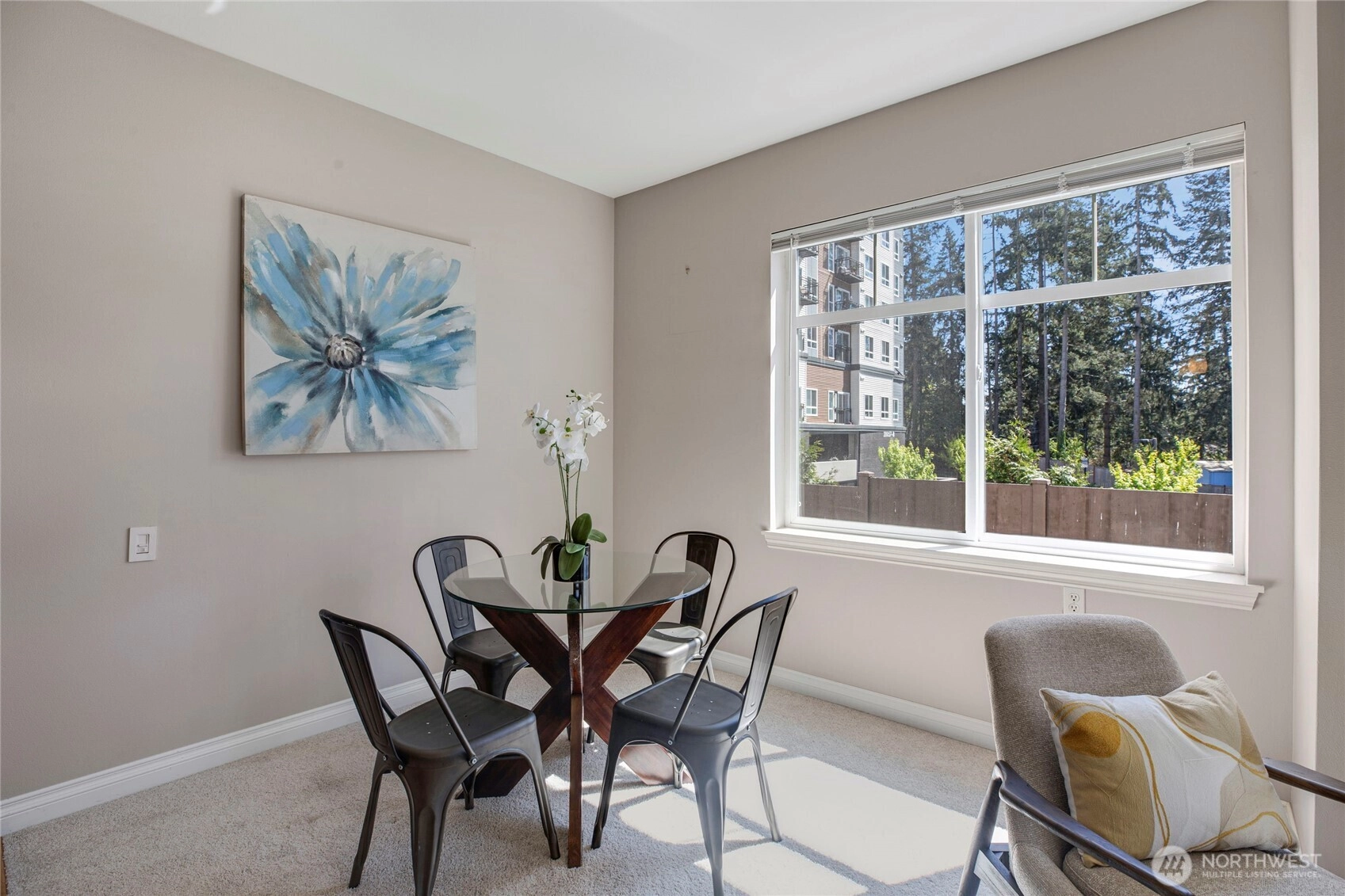 Experience modern elegance in this rare front-facing corner unit, bathed in natural light and boasting a spacious, open floor plan. The great room concept flows seamlessly, featuring a bright, clean interior with a cozy fireplace at its heart. The large kitchen includes stainless steel appliances, ample counter space, and a built-in computer desk. Enjoy meals in the separate dining area with a large window that invites plenty of natural light. The expansive primary suite offers a serene retreat. Located in a prime area with quick access to I-5, Edmonds and Shoreline. The secure building includes two parking spaces and extra storage. Steps away from parks, shopping, and dining, it’s the perfect blend of comfort & convenience.
