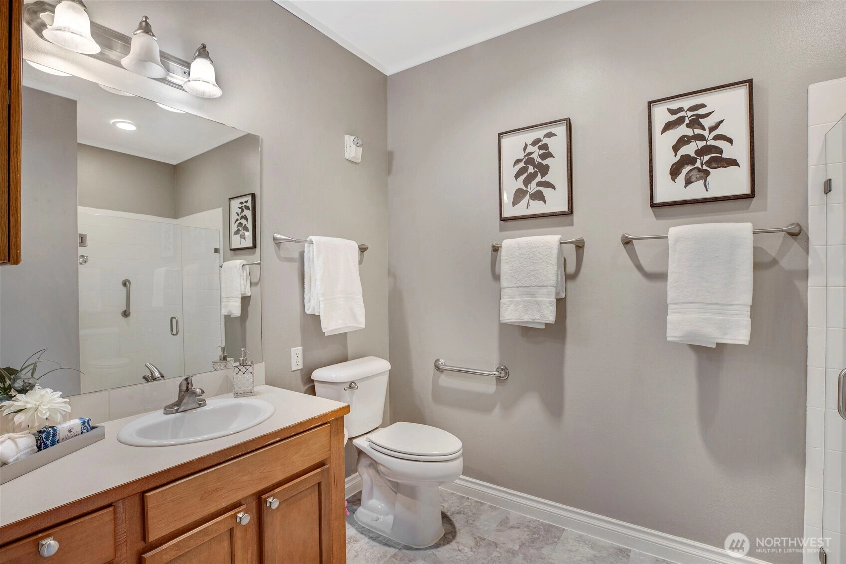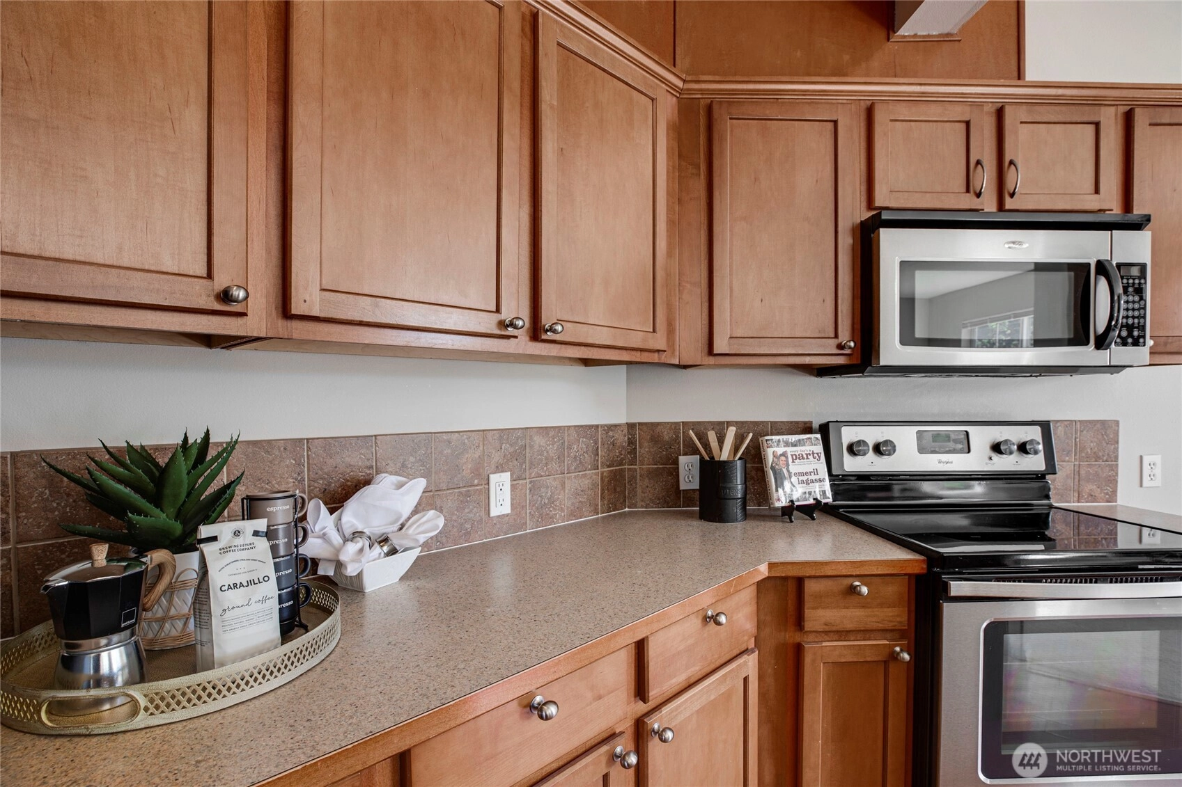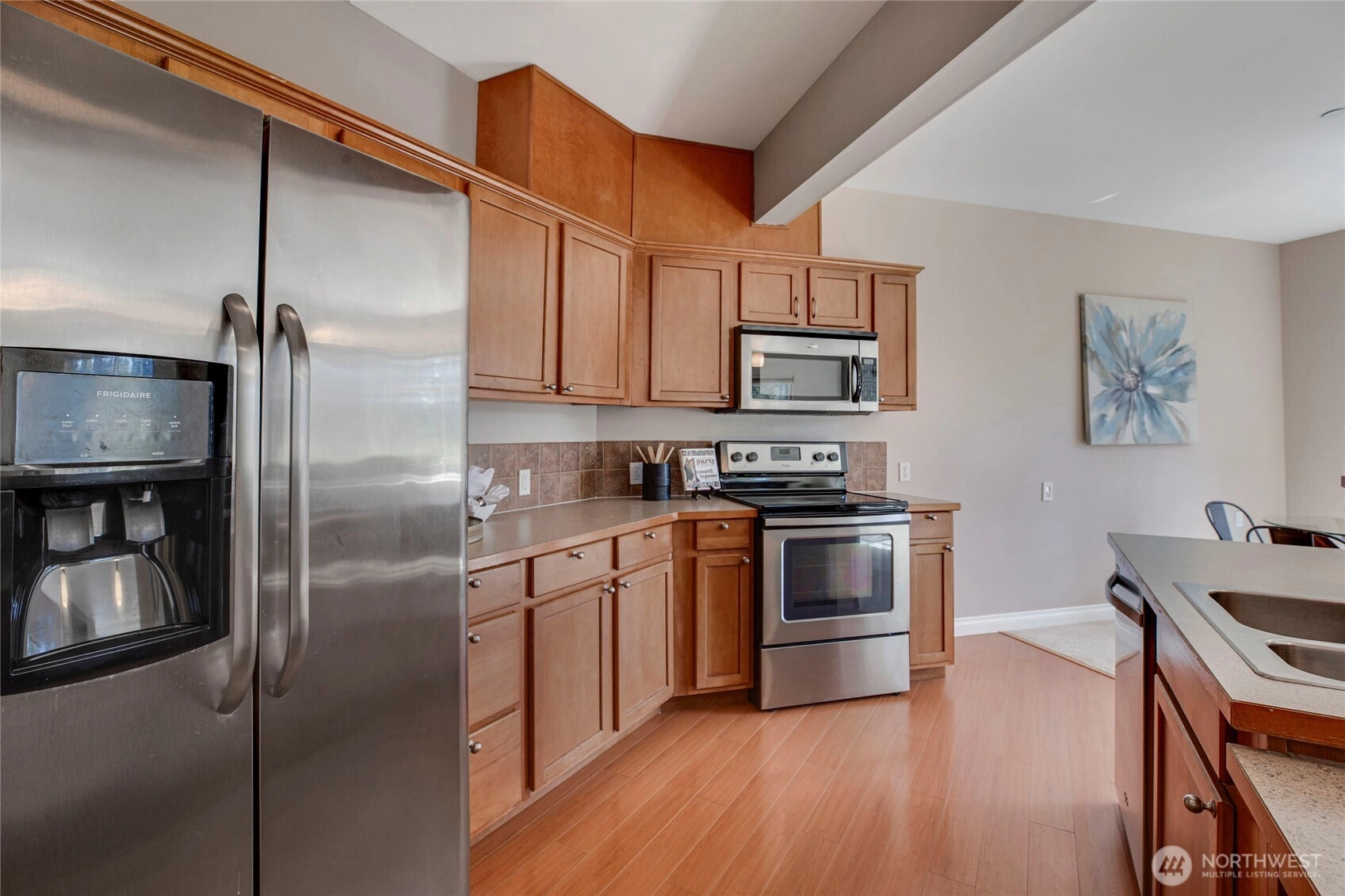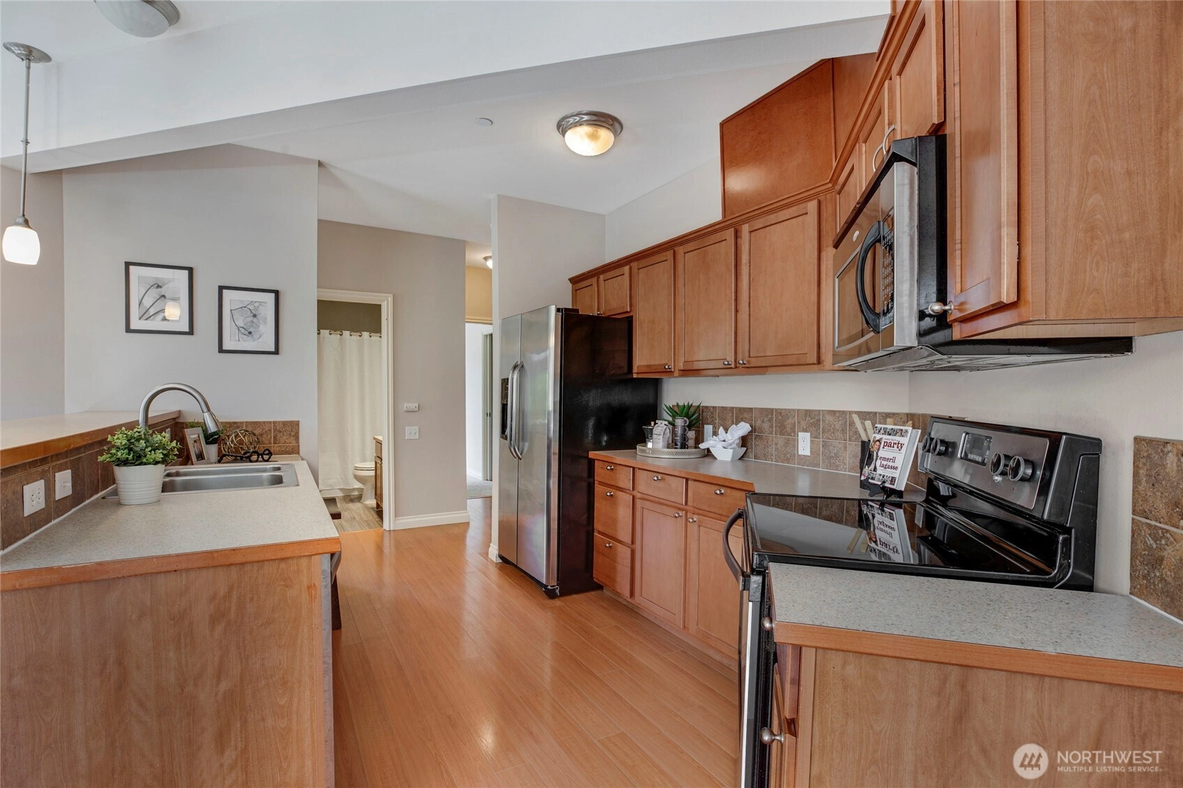 Experience modern elegance in this rare front-facing corner unit, bathed in natural light and boasting a spacious, open floor plan. The great room concept flows seamlessly, featuring a bright, clean interior with a cozy fireplace at its heart. The large kitchen includes stainless steel appliances, ample counter space, and a built-in computer desk. Enjoy meals in the separate dining area with a large window that invites plenty of natural light. The expansive primary suite offers a serene retreat. Located in a prime area with quick access to I-5, Edmonds and Shoreline. The secure building includes two parking spaces and extra storage. Steps away from parks, shopping, and dining, it’s the perfect blend of comfort & convenience.