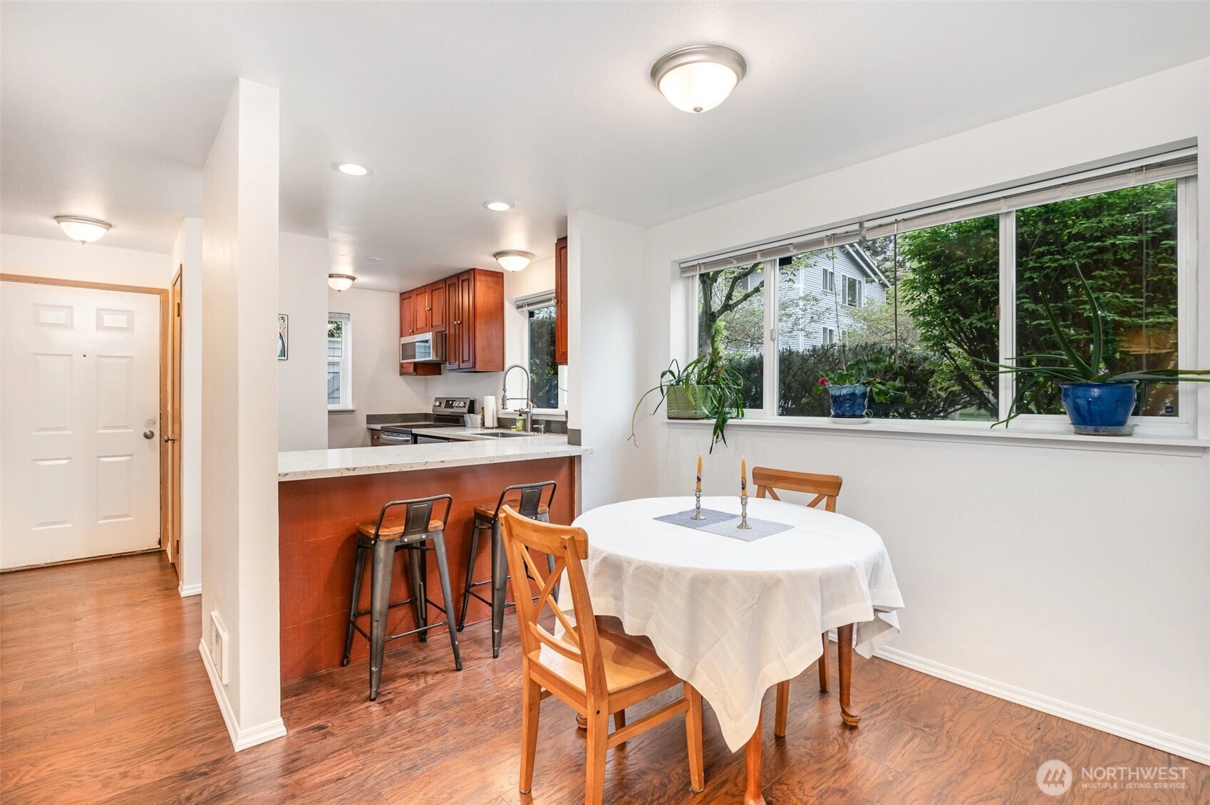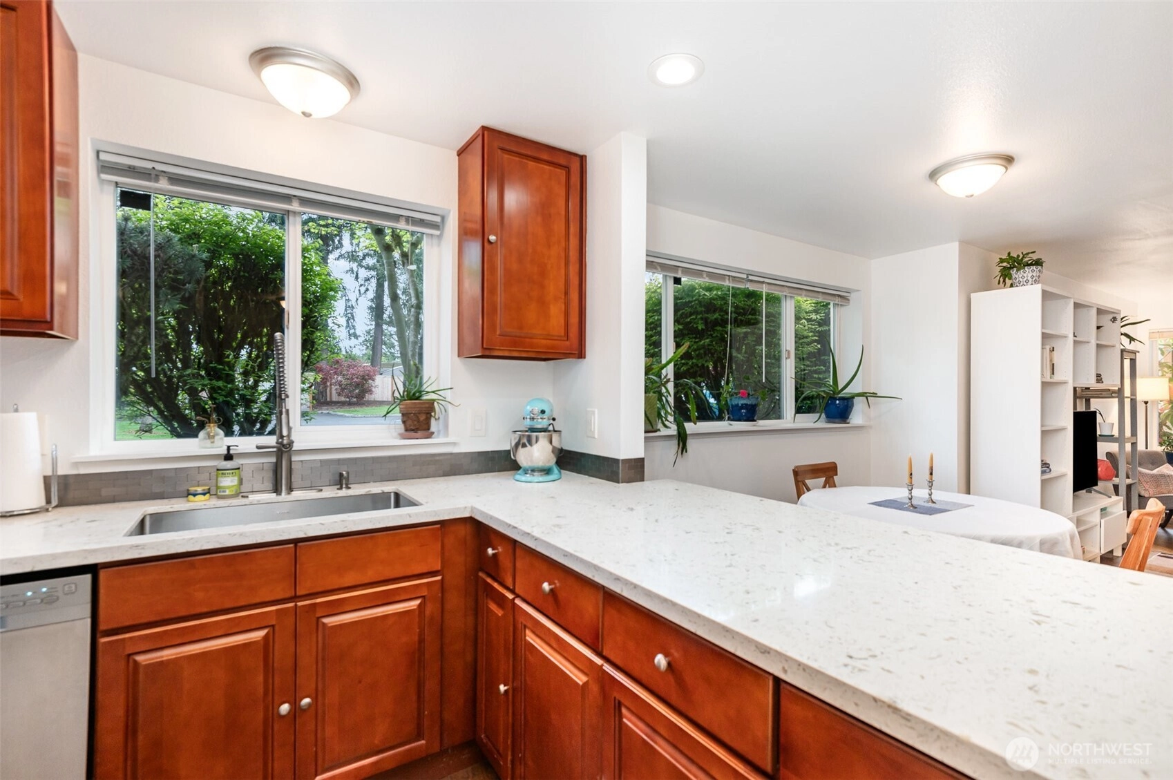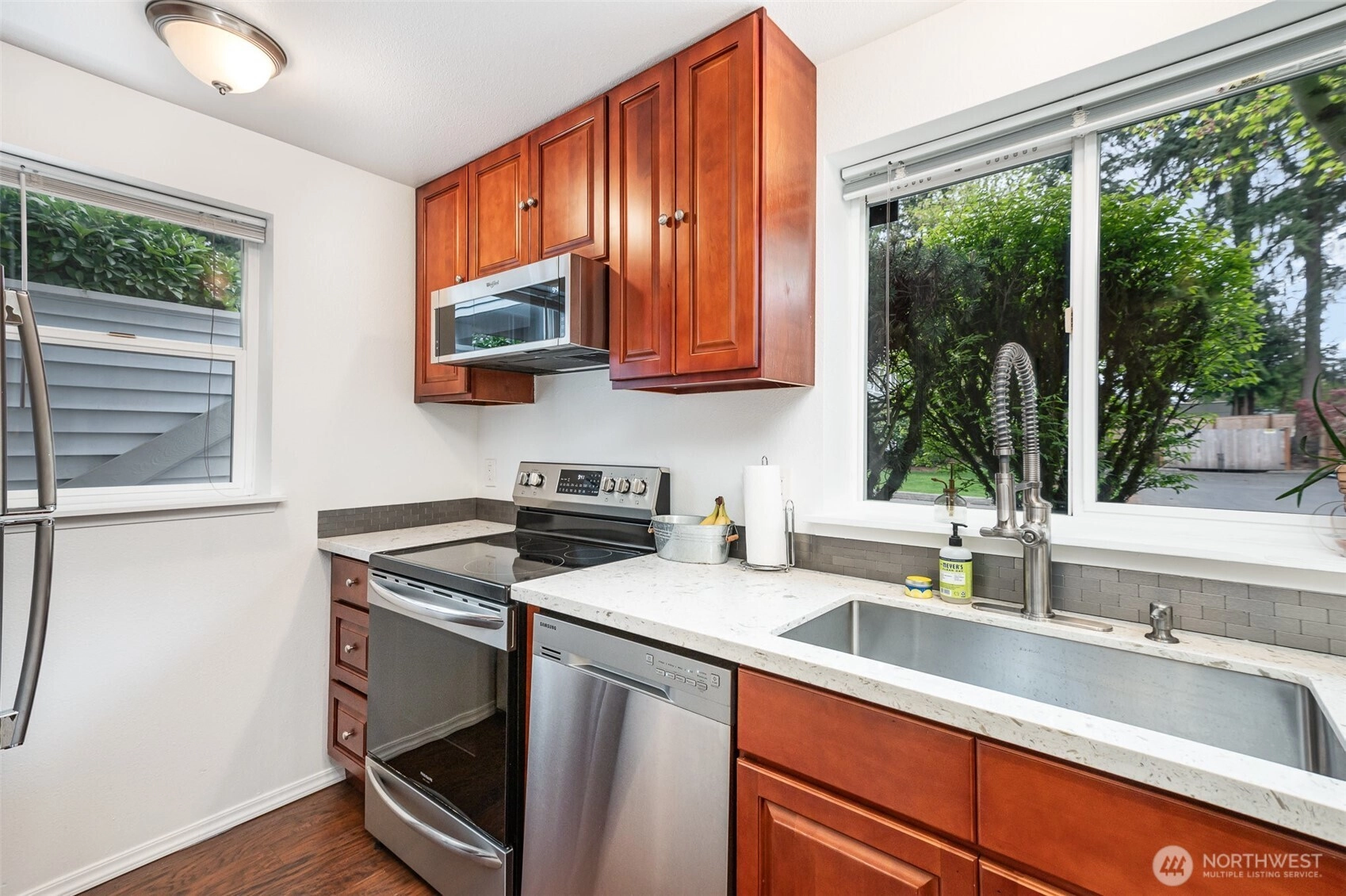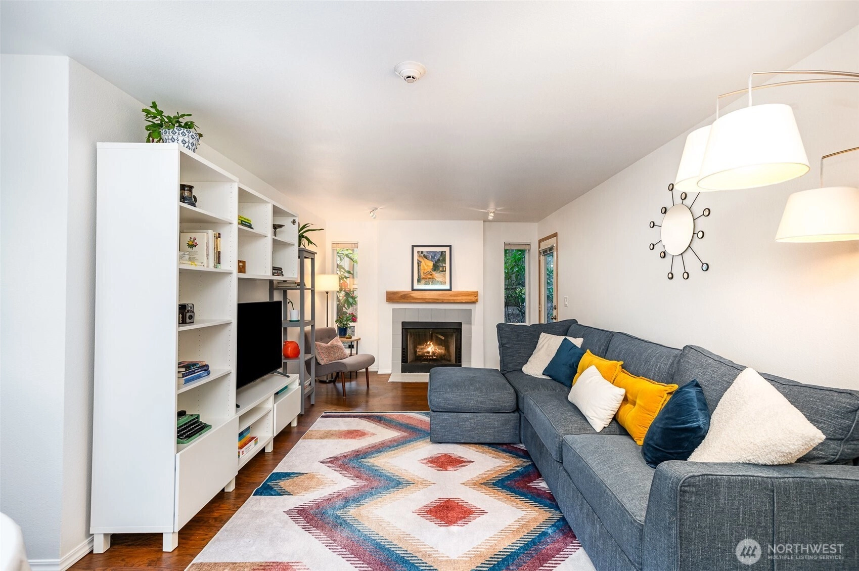Welcome to your peaceful ground-floor retreat! This clean, bright and inviting 2B/2B end unit features a spacious great room with oversized windows, a cozy wood-burning fireplace, primary bedroom with en-suite, and a private patio — perfect for relaxing or entertaining. The interior is freshly painted, and you'll appreciate the full-size washer and dryer, ample storage, and two assigned parking spaces that come with the unit. This is a pet-friendly community with an unbeatable location, just blocks from Edmonds College, Lynnwood Golf Course, local coffee shops, restaurants, and easy access to I-5, Highway 99 and the Lynnwood City Center Station. A fantastic place to call home, or purchase as an investment property (no rental cap).