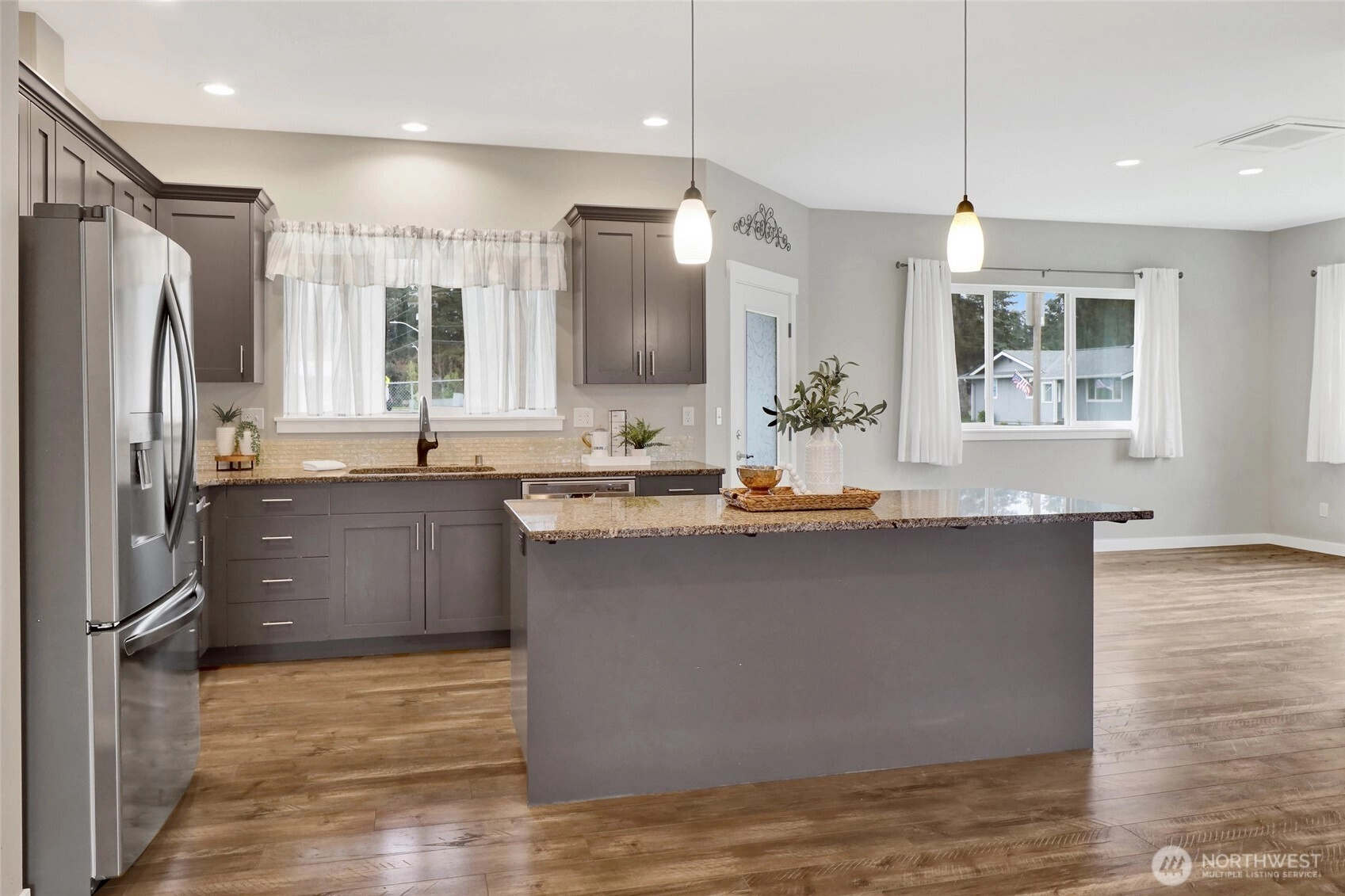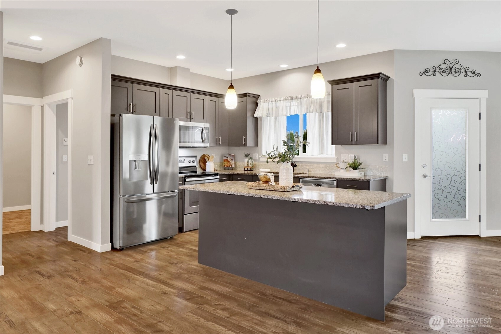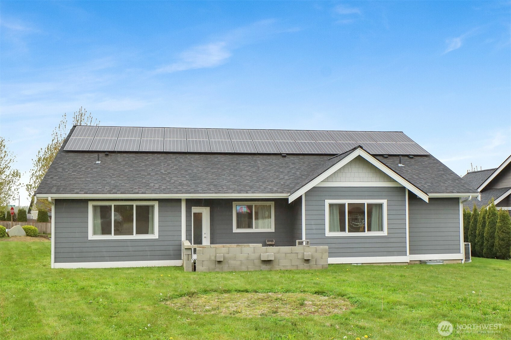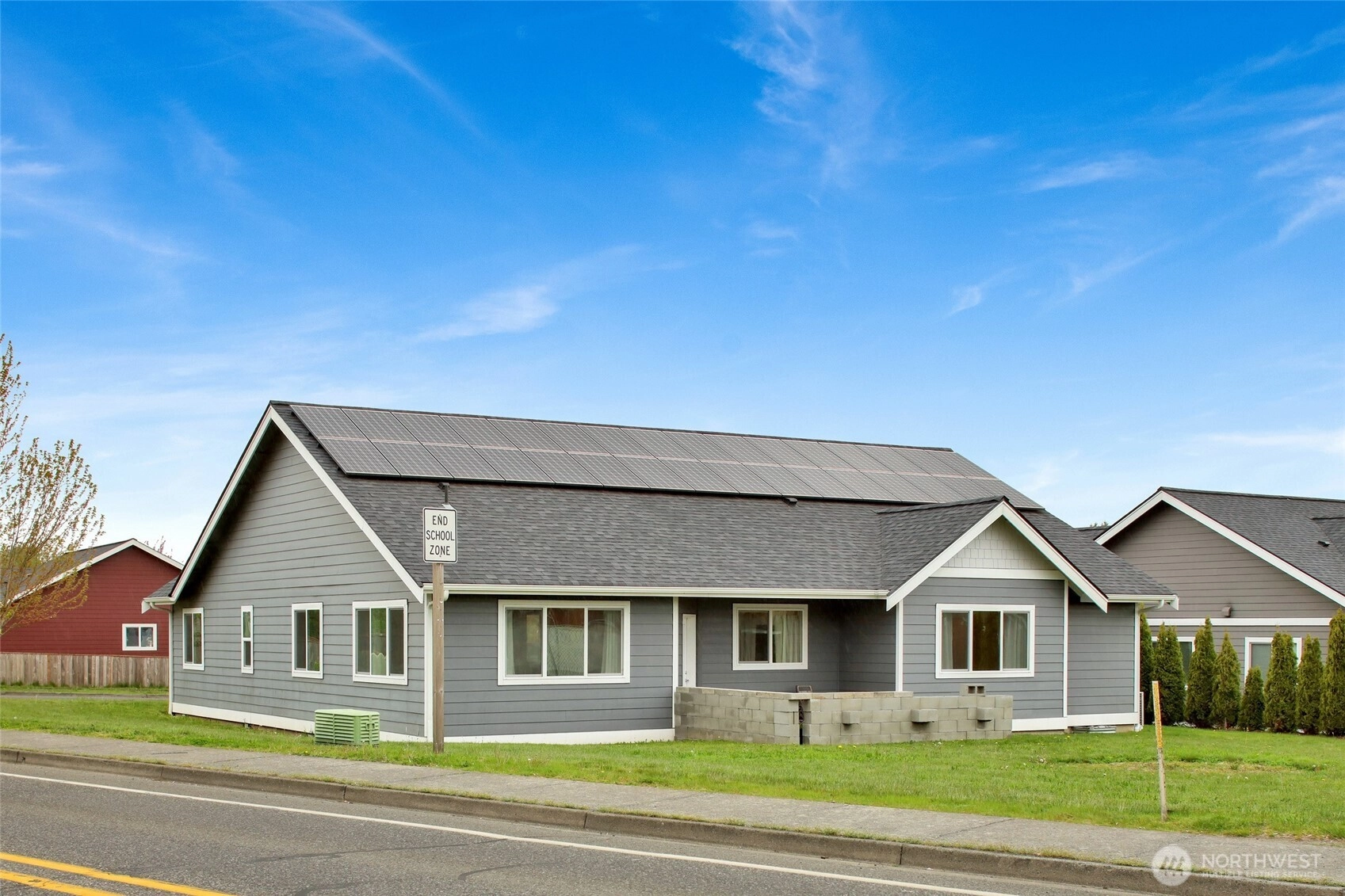 Welcome to your dream home in Everson. This rambler was built in 2017 with an inviting open floor plan that lives large with 1769sf, with 3 bedrooms and 2 full baths on .26 acre level lot and not in the flood plain. Enjoy the abundant natural light, with seller upgraded solar panels producing low power bills, home water filtration system, and you will beat the heat in air-conditioned comfort. Nicely appointed primary bedroom with ensuite soaking tub and walk-in closet. The kitchen is nicely appointed with an island and granite countertops, stainless steel appliances, and kitchen dining area. The kitchen door leads out to patio for barbecuing and enjoying the spacious backyard while relaxing around the firepit and enjoying Mt Baker views.