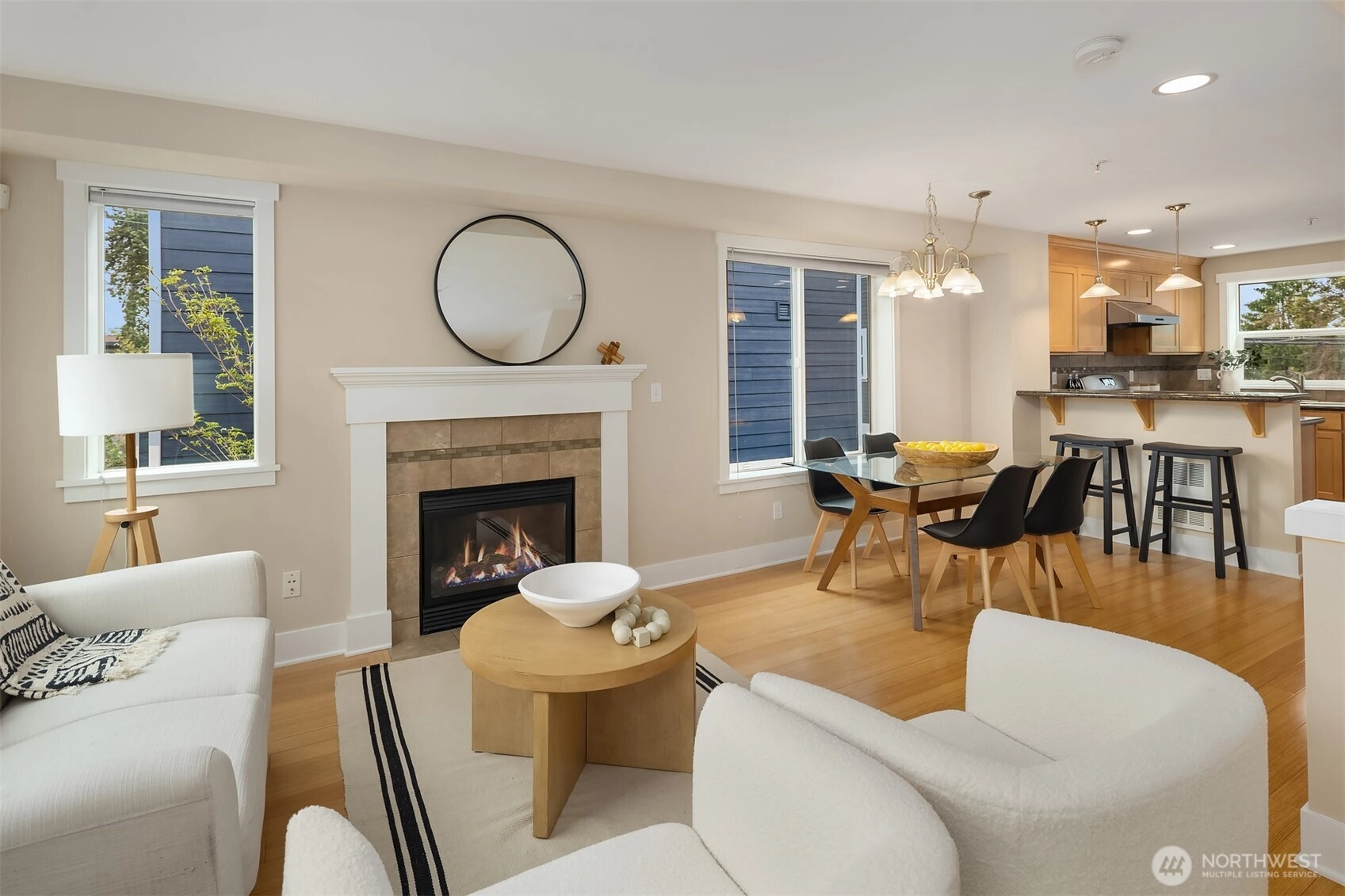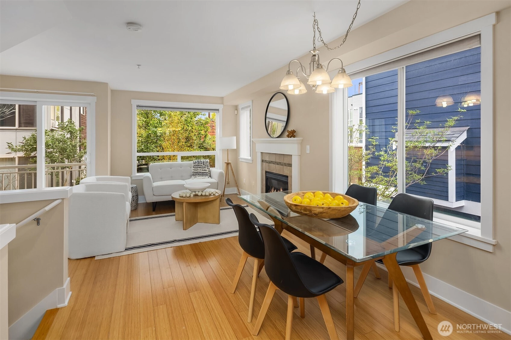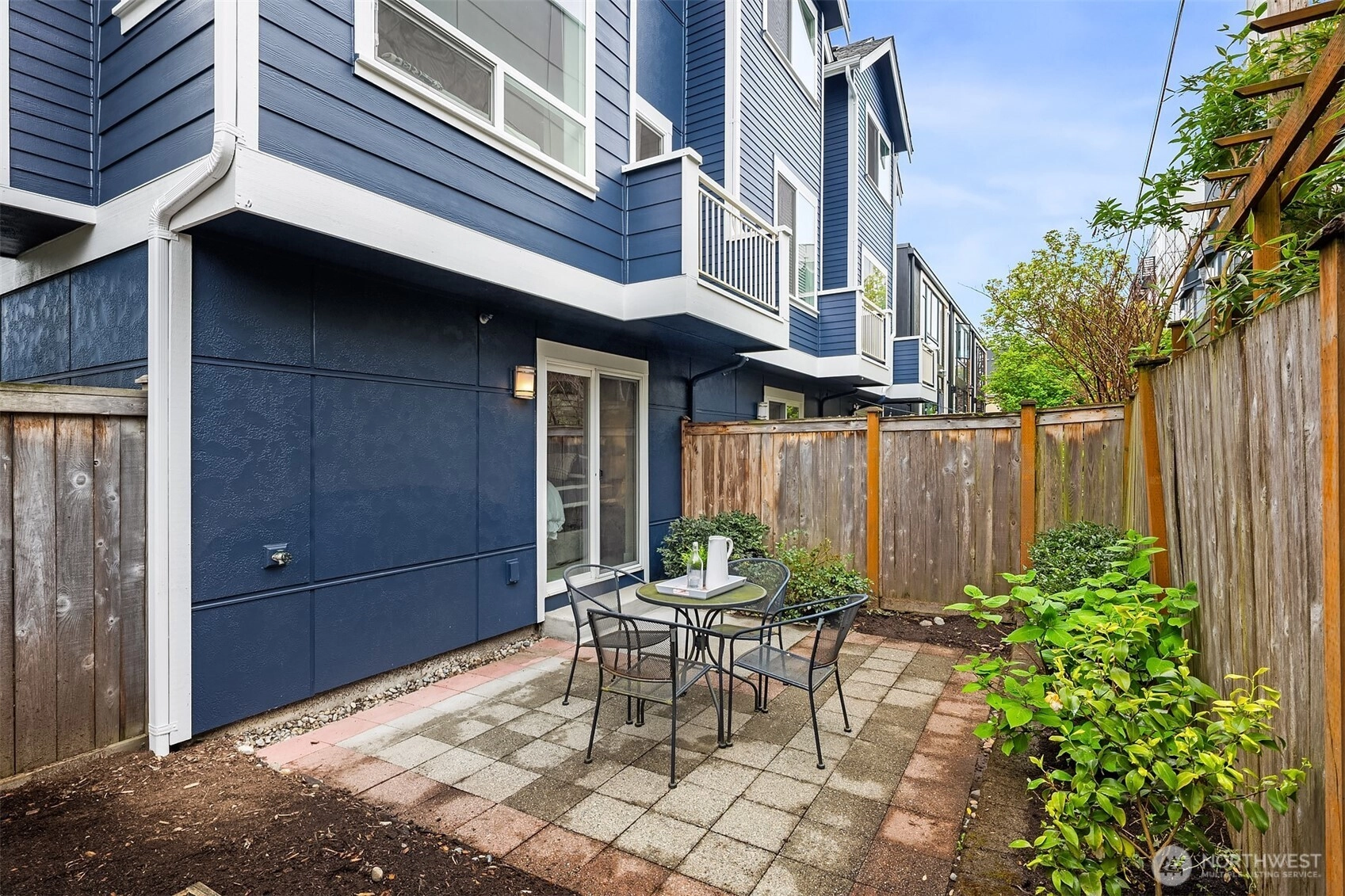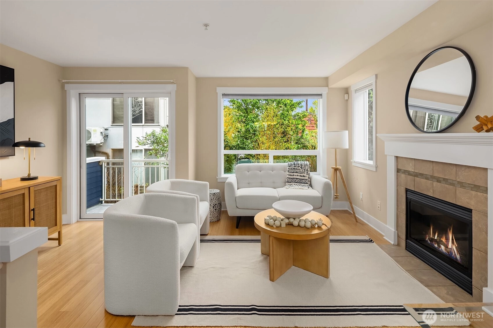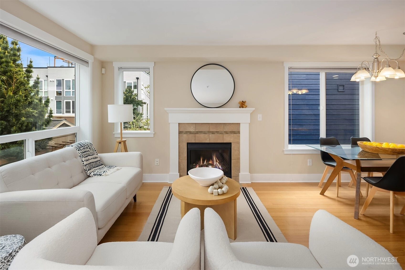 Beautifully crafted end-unit townhome tucked away in a serene setting in the heart of Ballard. Sunlit open-concept main floor showcases living room w/cozy gas fireplace & balcony, flowing to dining area & chef’s kitchen w/breakfast bar, granite countertops & gas range. Upstairs offers 2 bedrooms w/vaulted ceilings, skylight & well-appointed full bath w/dual vanities. Entry level features spacious guest bedroom w/ full bath & laundry room. Enjoy fully fenced private backyard & oversized 1-car attached garage w/ample storage. Recent updates include new carpet, fresh exterior & interior wall paint & new composite deck. Short stroll to SLU & DT Seattle. Steps away from parks, grocery stores, gyms, restaurants & everything Ballard has to offer.