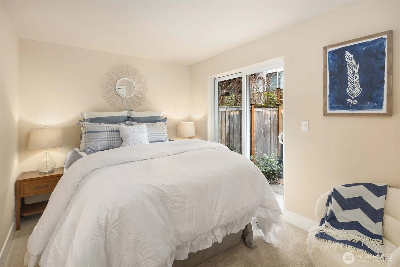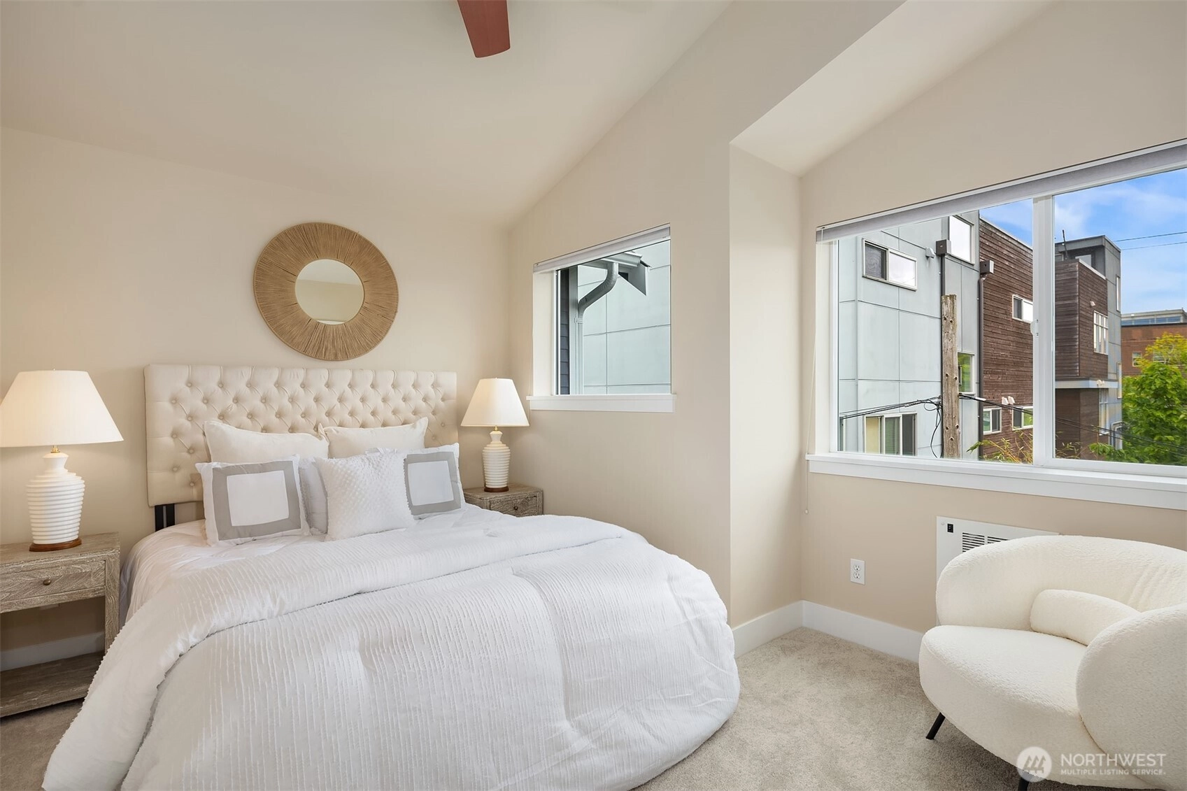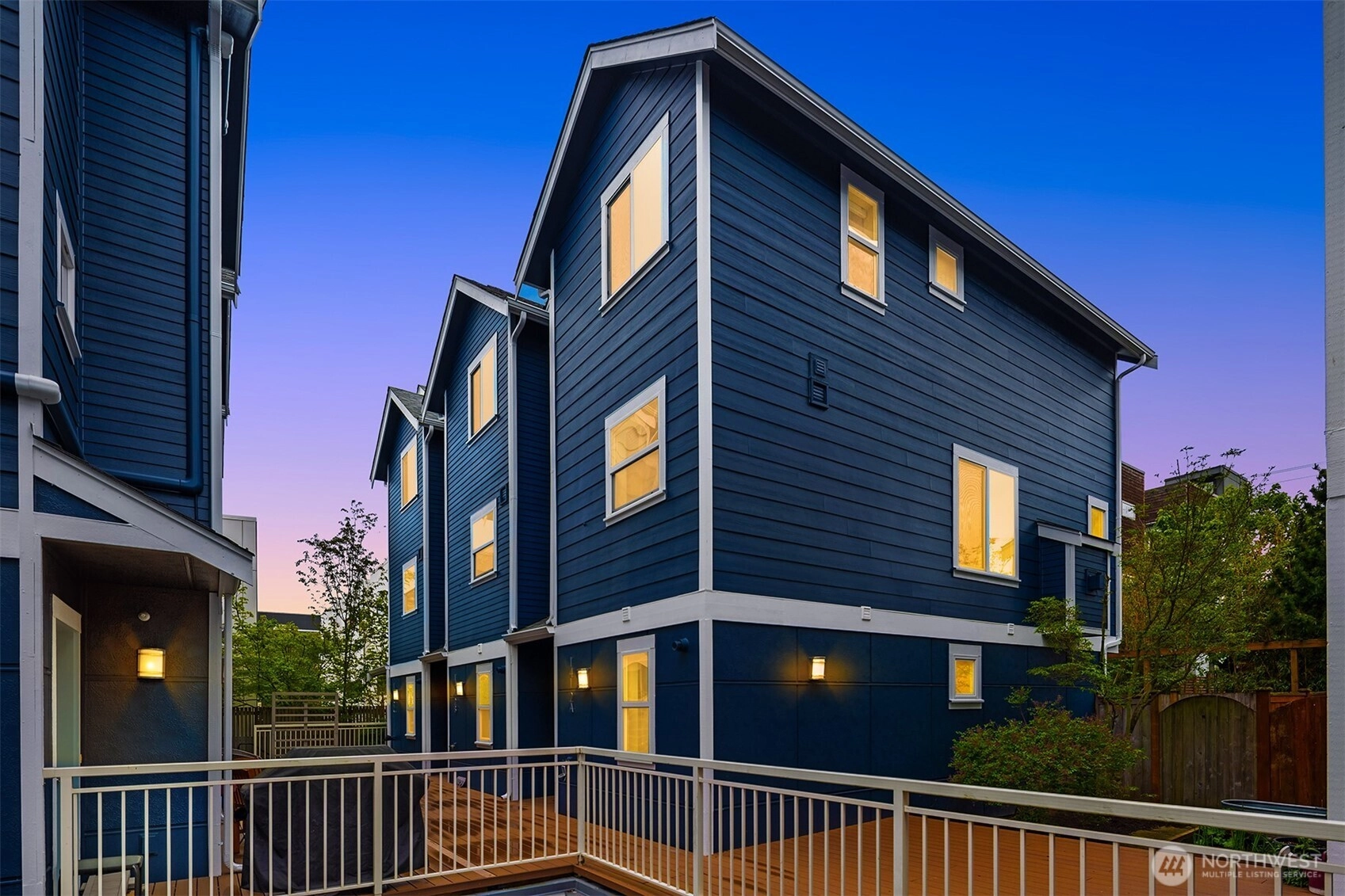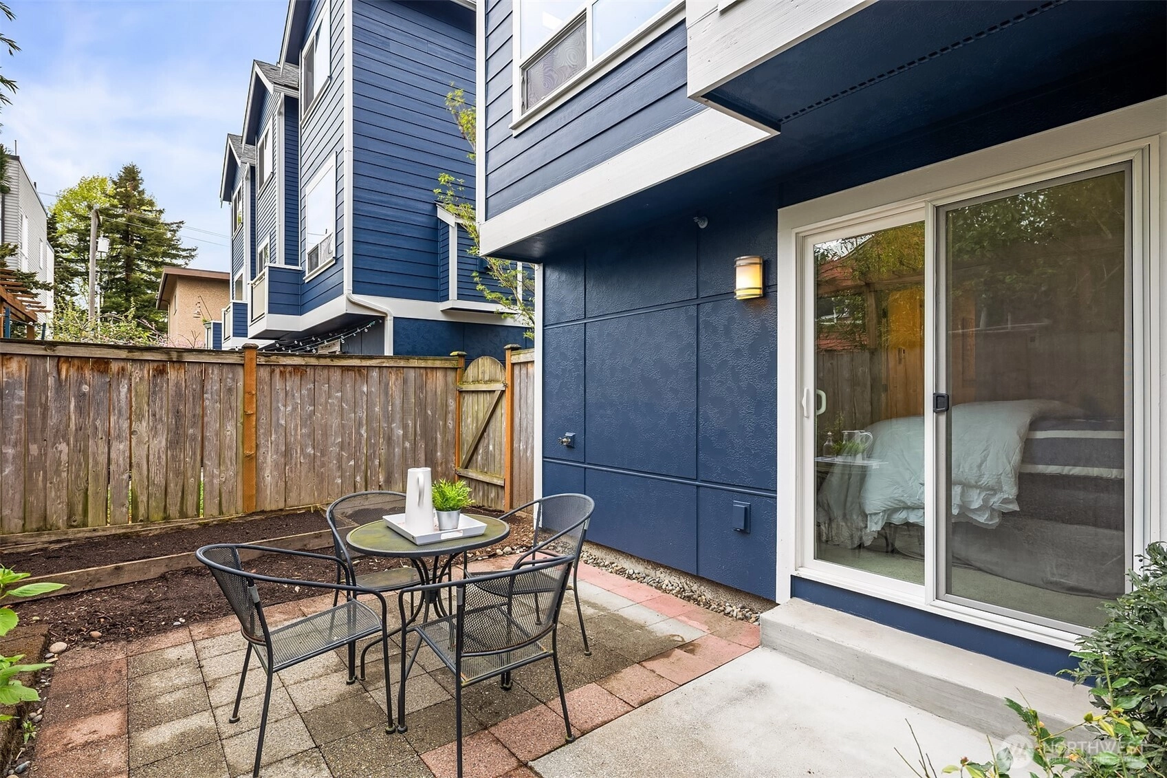 Beautifully crafted end-unit townhome tucked away in a serene setting in the heart of Ballard. Sunlit open-concept main floor showcases living room w/cozy gas fireplace & balcony, flowing to dining area & chef’s kitchen w/breakfast bar, granite countertops & gas range. Upstairs offers 2 bedrooms w/vaulted ceilings, skylight & well-appointed full bath w/dual vanities. Entry level features spacious guest bedroom w/ full bath & laundry room. Enjoy fully fenced private backyard & oversized 1-car attached garage w/ample storage. Recent updates include new carpet, fresh exterior & interior wall paint & new composite deck. Short stroll to SLU & DT Seattle. Steps away from parks, grocery stores, gyms, restaurants & everything Ballard has to offer.