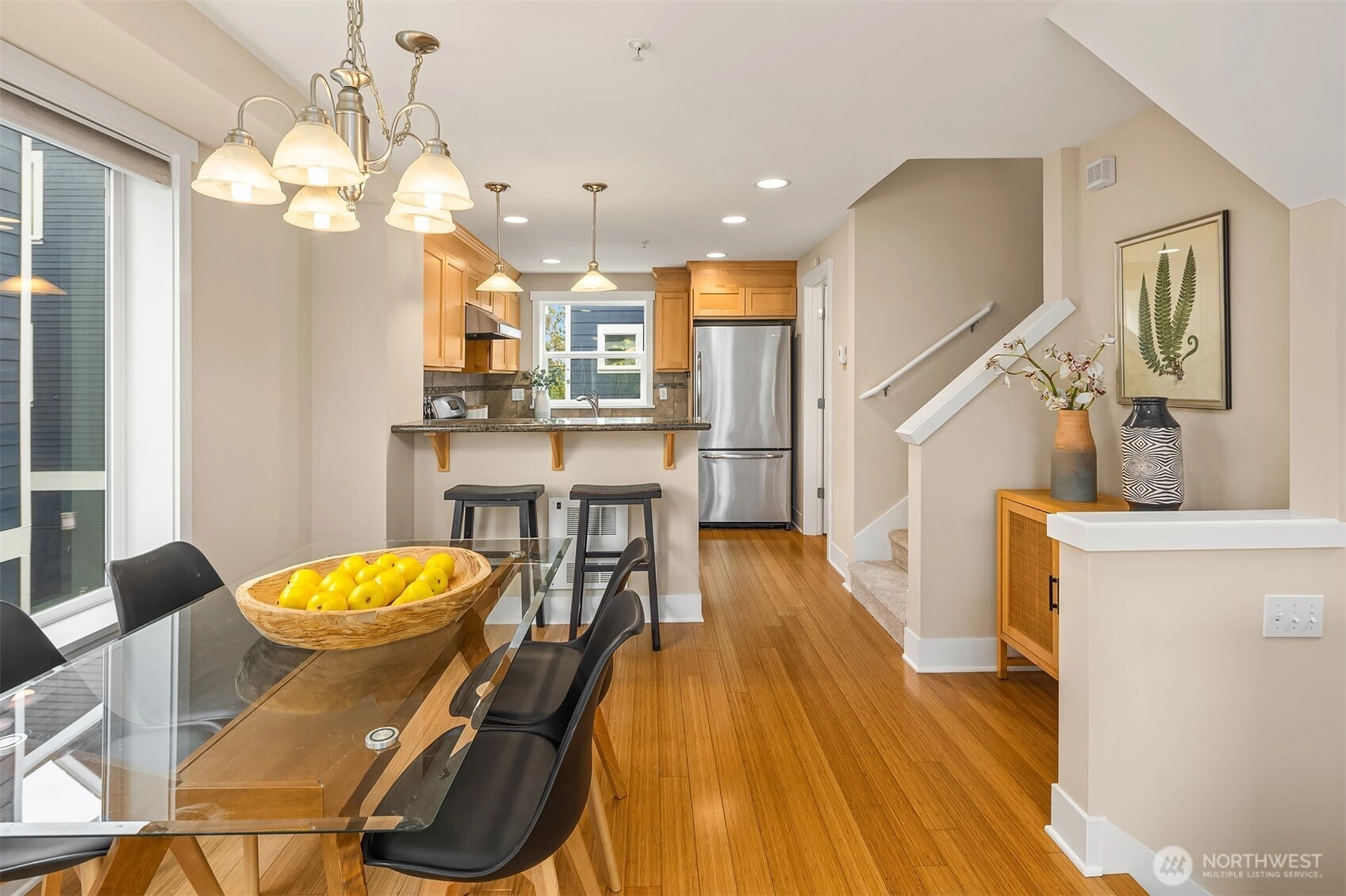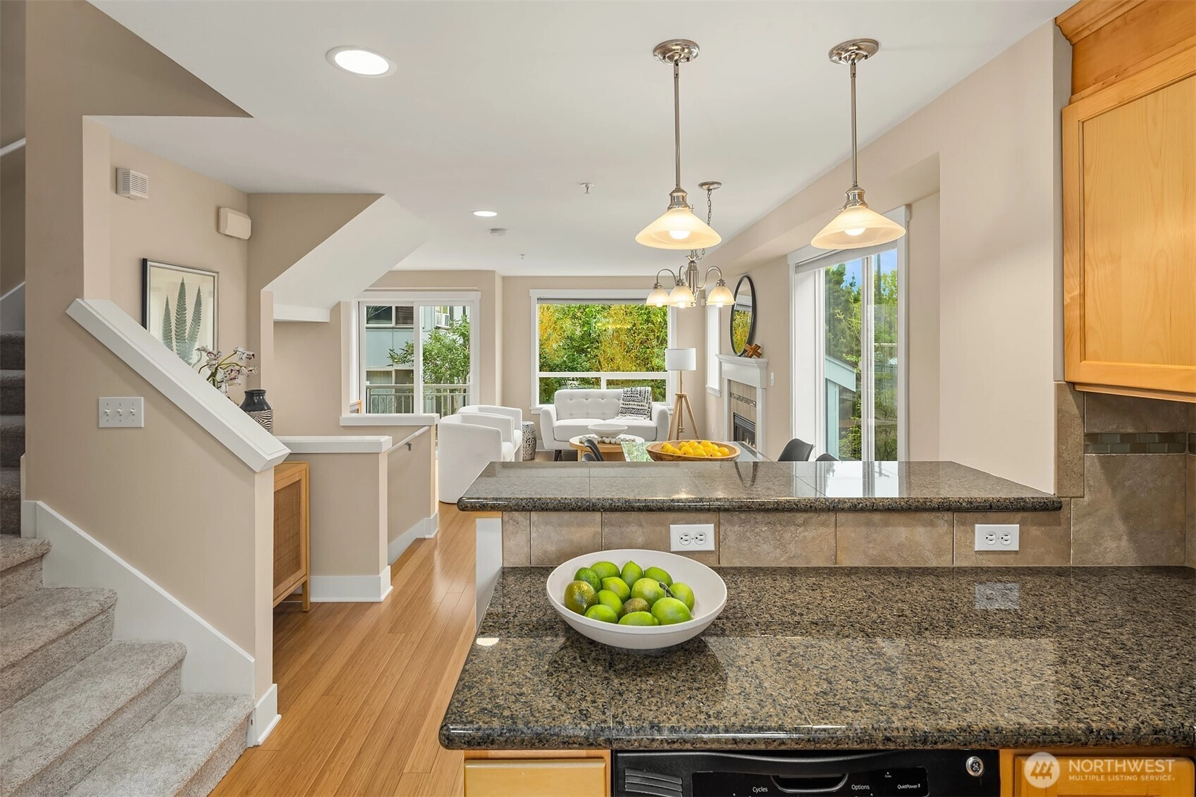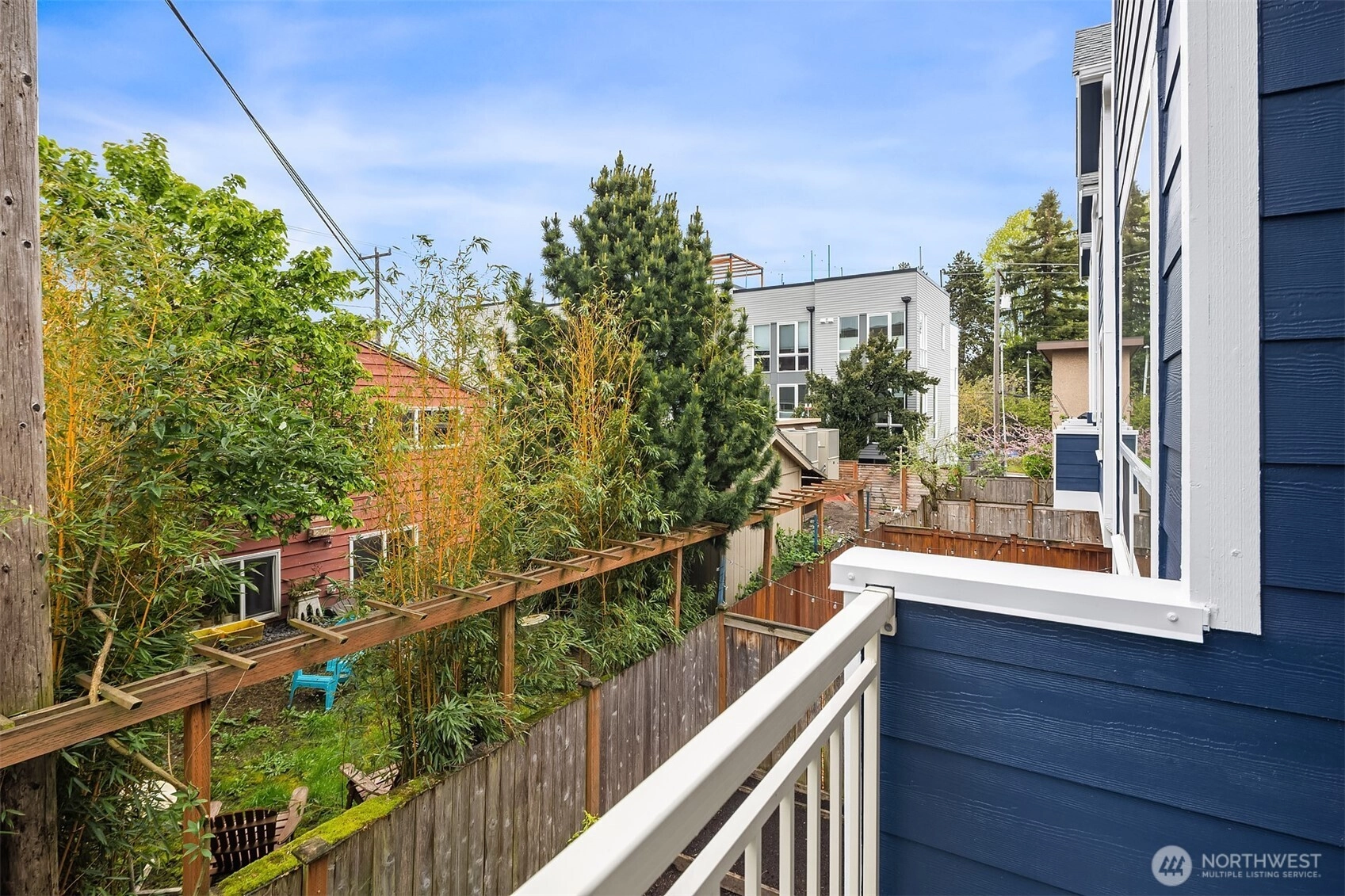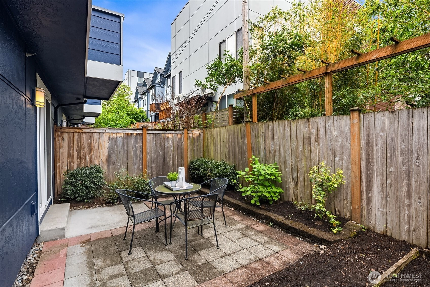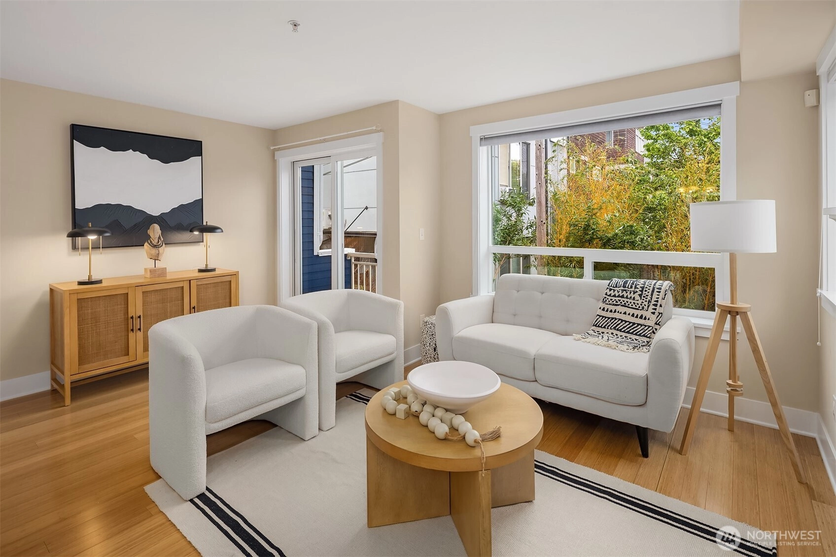 Beautifully crafted end-unit townhome tucked away in a serene setting in the heart of Ballard. Sunlit open-concept main floor showcases living room w/cozy gas fireplace & balcony, flowing to dining area & chef’s kitchen w/breakfast bar, granite countertops & gas range. Upstairs offers 2 bedrooms w/vaulted ceilings, skylight & well-appointed full bath w/dual vanities. Entry level features spacious guest bedroom w/ full bath & laundry room. Enjoy fully fenced private backyard & oversized 1-car attached garage w/ample storage. Recent updates include new carpet, fresh exterior & interior wall paint & new composite deck. Short stroll to SLU & DT Seattle. Steps away from parks, grocery stores, gyms, restaurants & everything Ballard has to offer.