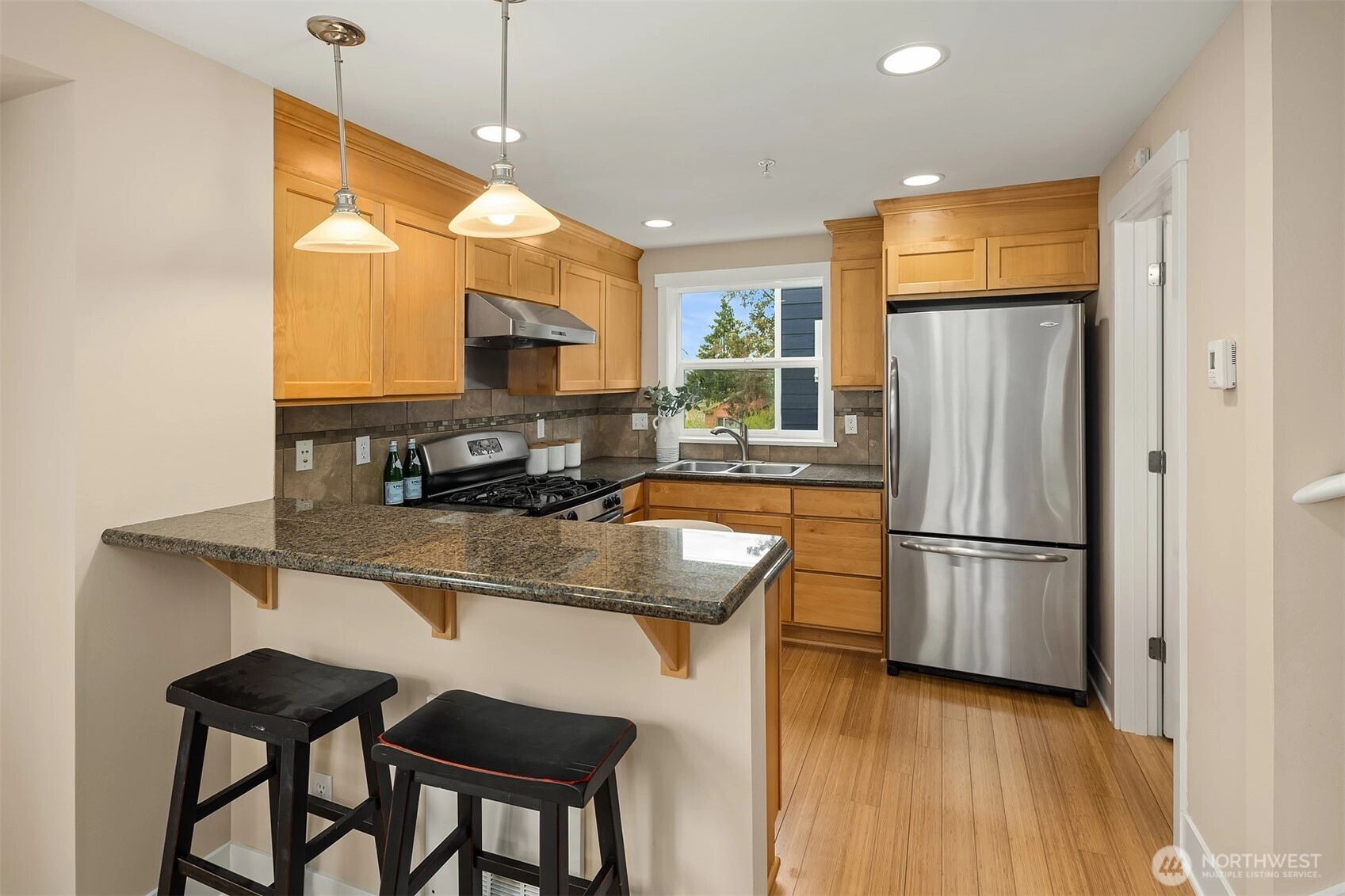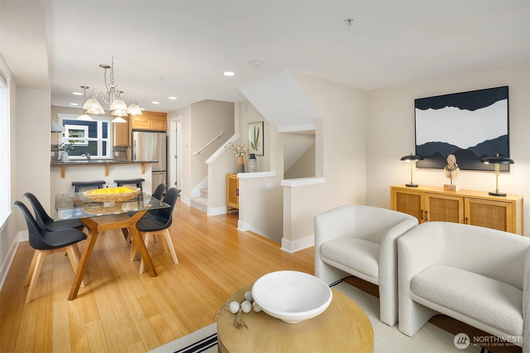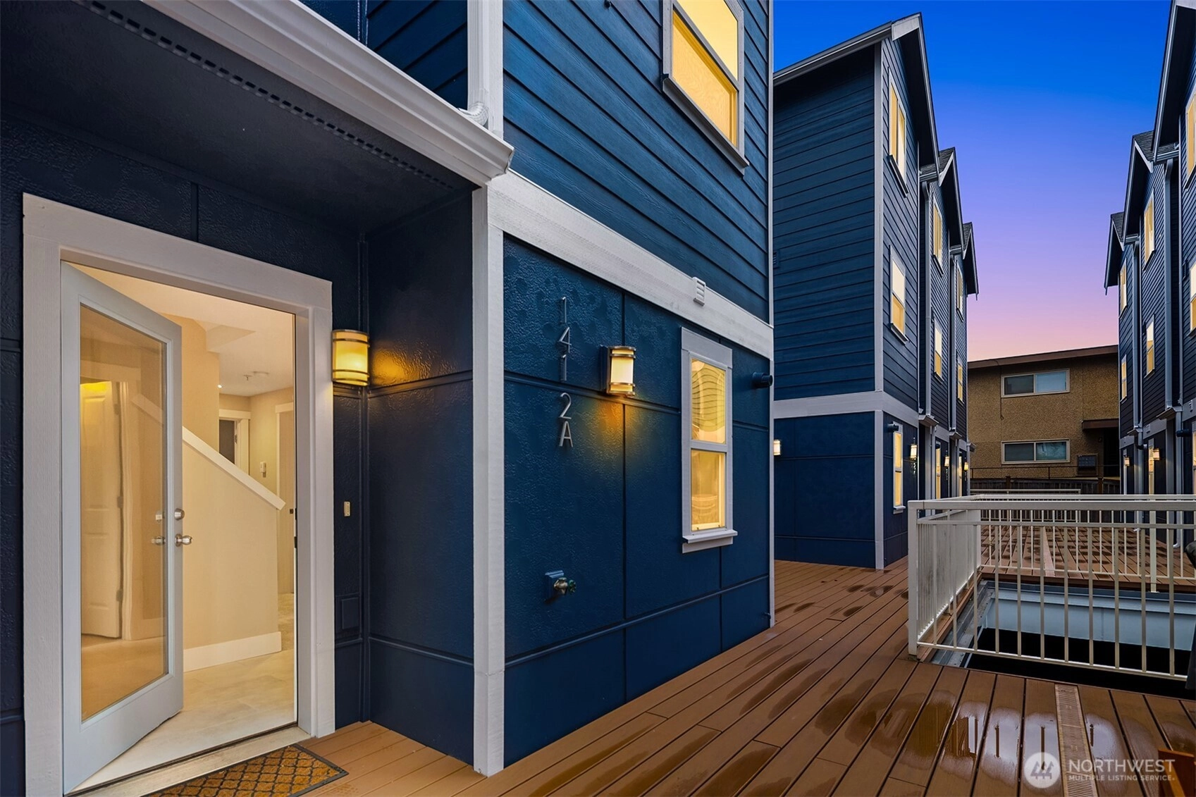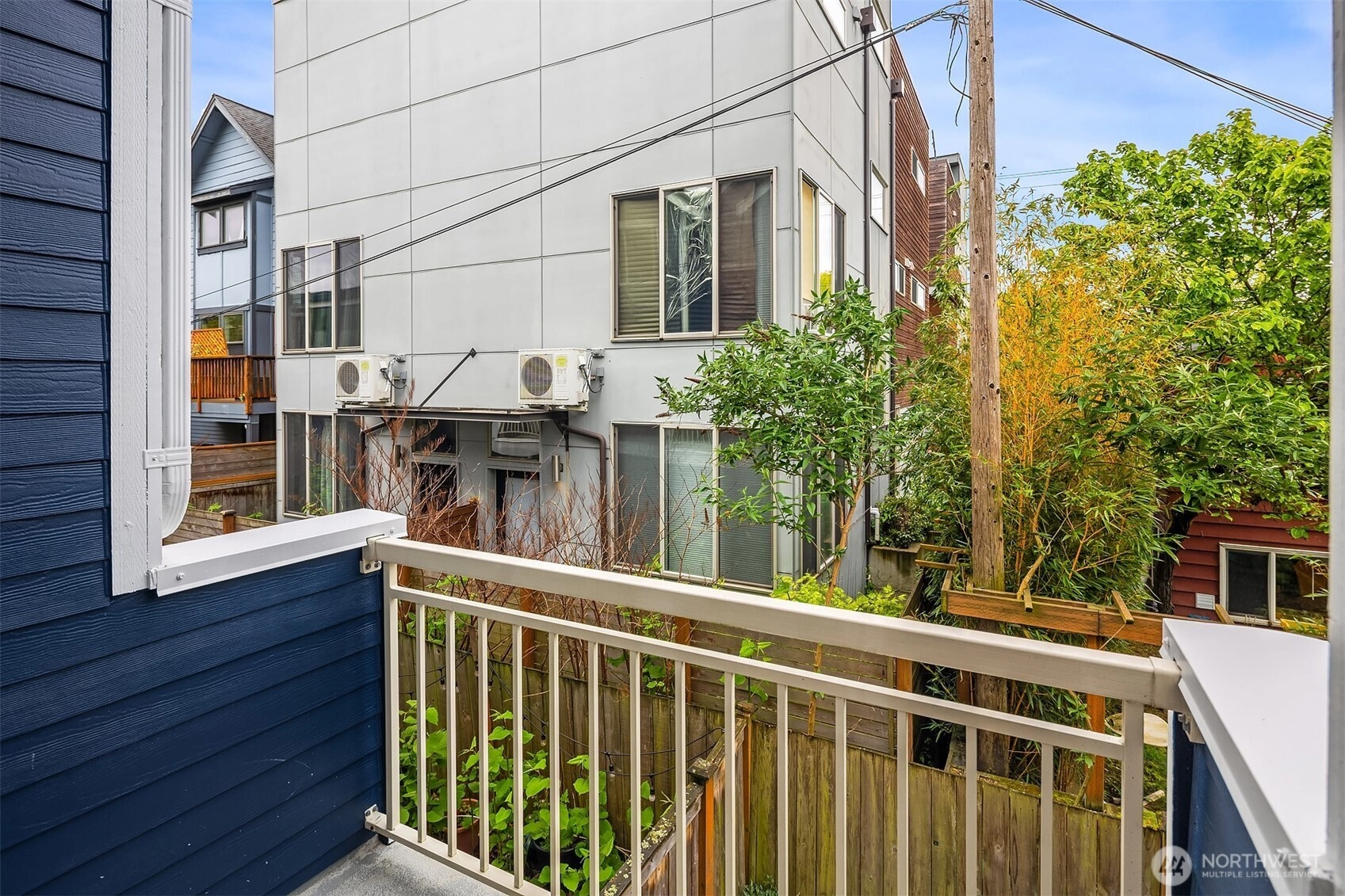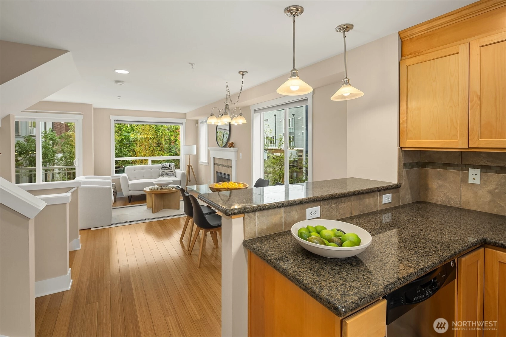 Beautifully crafted end-unit townhome tucked away in a serene setting in the heart of Ballard. Sunlit open-concept main floor showcases living room w/cozy gas fireplace & balcony, flowing to dining area & chef’s kitchen w/breakfast bar, granite countertops & gas range. Upstairs offers 2 bedrooms w/vaulted ceilings, skylight & well-appointed full bath w/dual vanities. Entry level features spacious guest bedroom w/ full bath & laundry room. Enjoy fully fenced private backyard & oversized 1-car attached garage w/ample storage. Recent updates include new carpet, fresh exterior & interior wall paint & new composite deck. Short stroll to SLU & DT Seattle. Steps away from parks, grocery stores, gyms, restaurants & everything Ballard has to offer.
