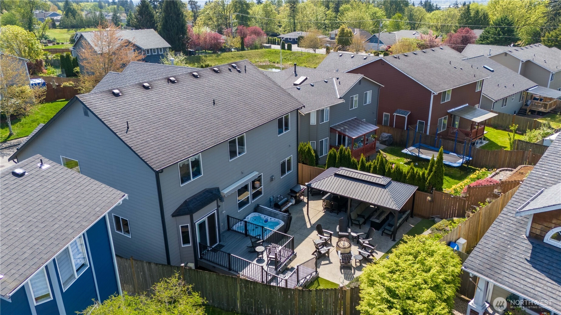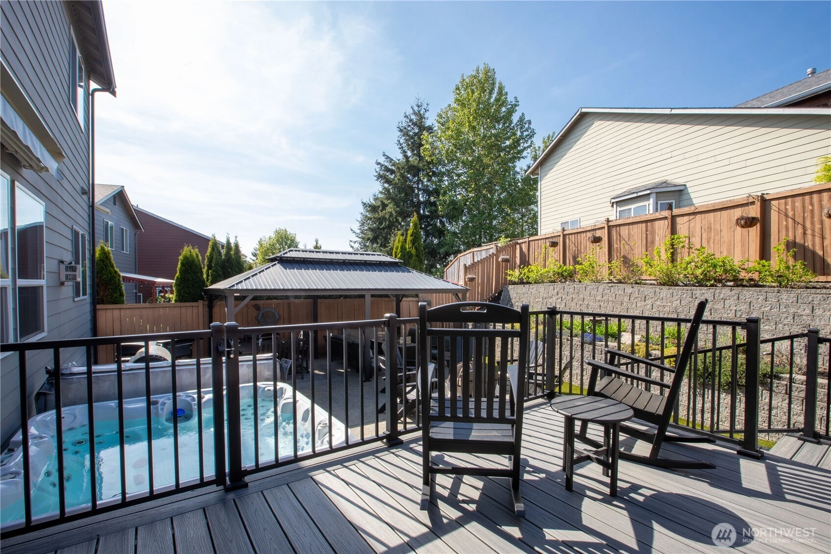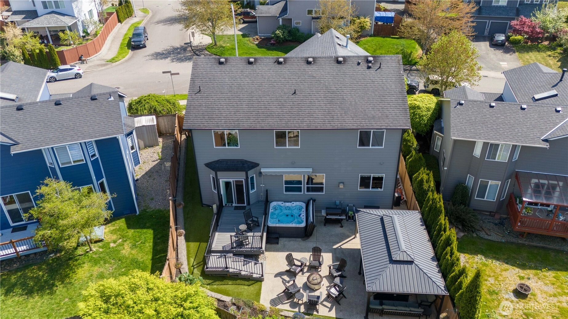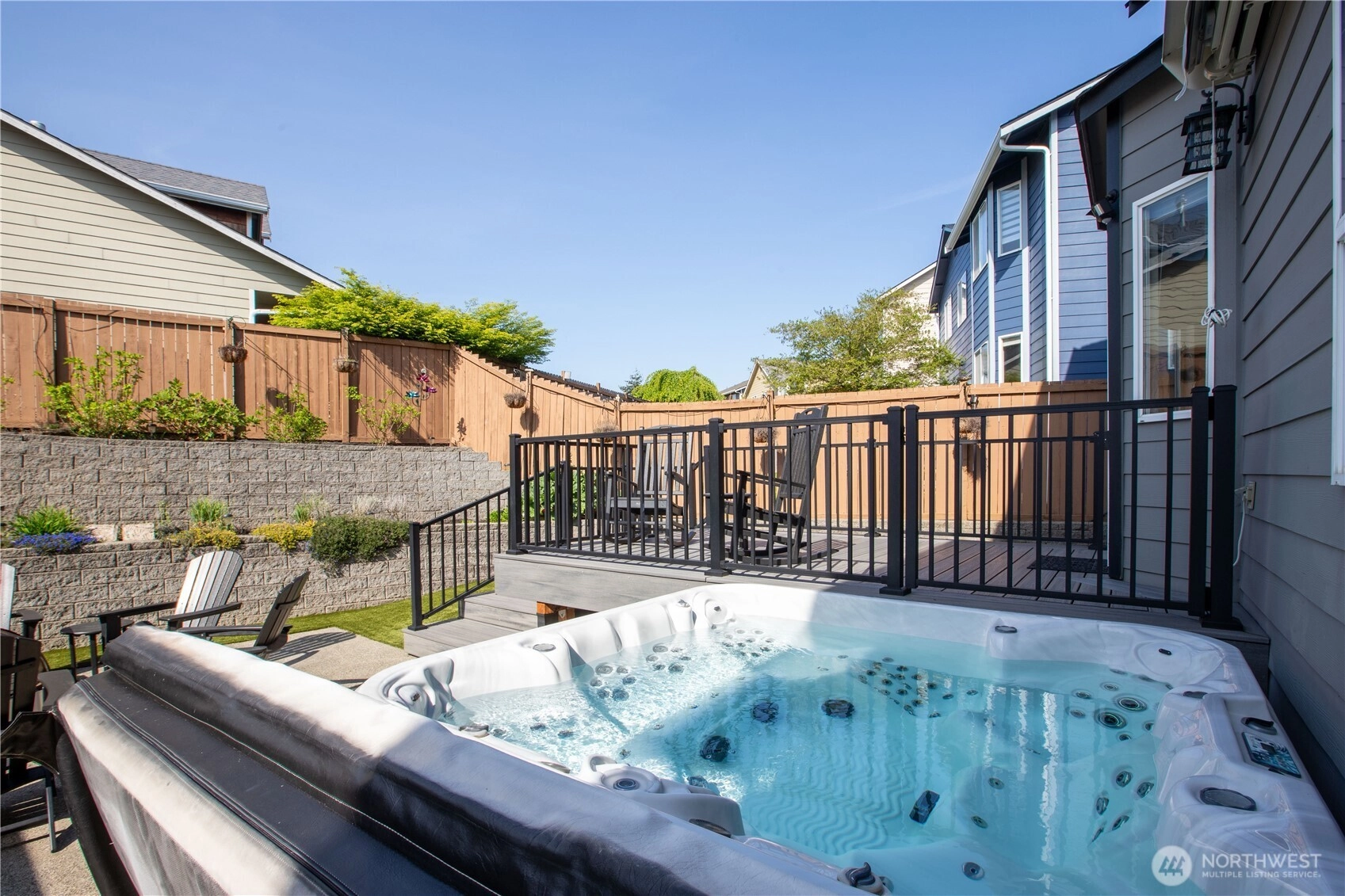 Welcome to this spacious 5-bed, 2.5-bath home with cathedral ceilings in the living and dining rooms and LVP flooring throughout. The open-concept kitchen features walnut soft-close cabinets, quartz counters with seating for 7, SS appliances, and flows into a cozy great room with a gas fireplace. A downstairs bedroom sits next to a large utility room—ideal for guests or a home office. Upstairs, enjoy a roomy primary en-suite with a soaking tub and walk-in closet, plus 3 more bedrooms. Entertain in the backyard oasis w/ Trex decking and aluminum rails, a hot tub with a retractable awning, and low-maintenance artificial turf in the front & back yards. Motivated Sellers. Pre-inspection report available
