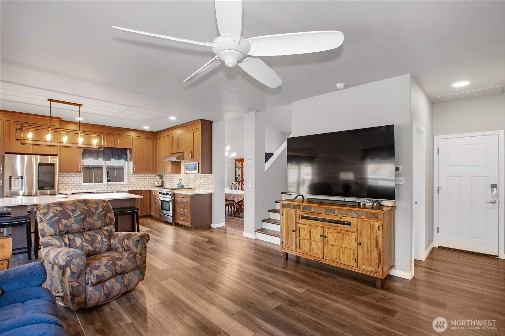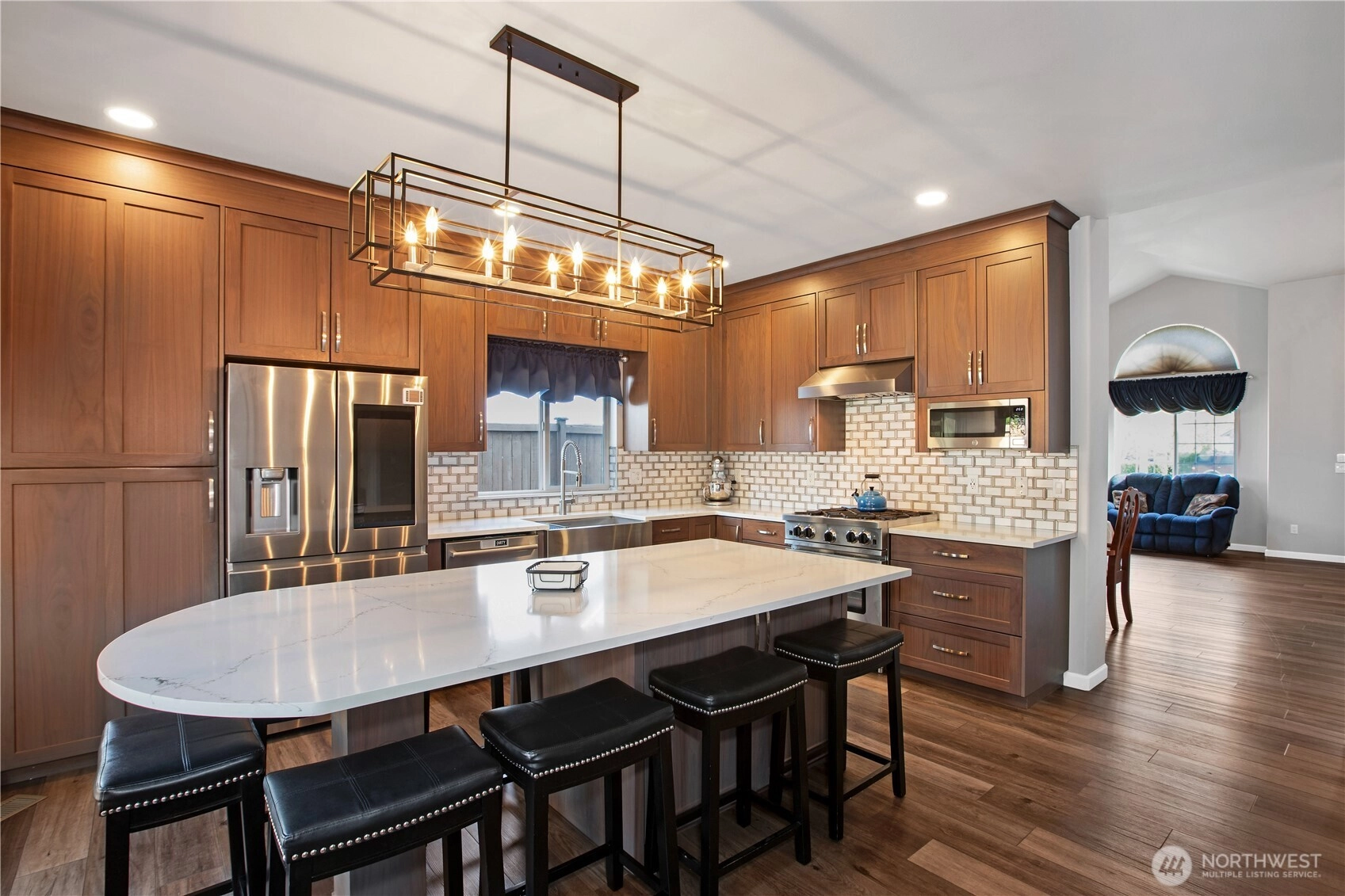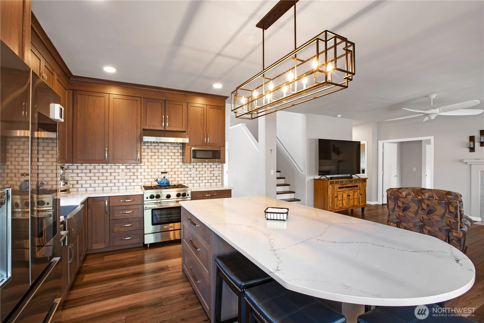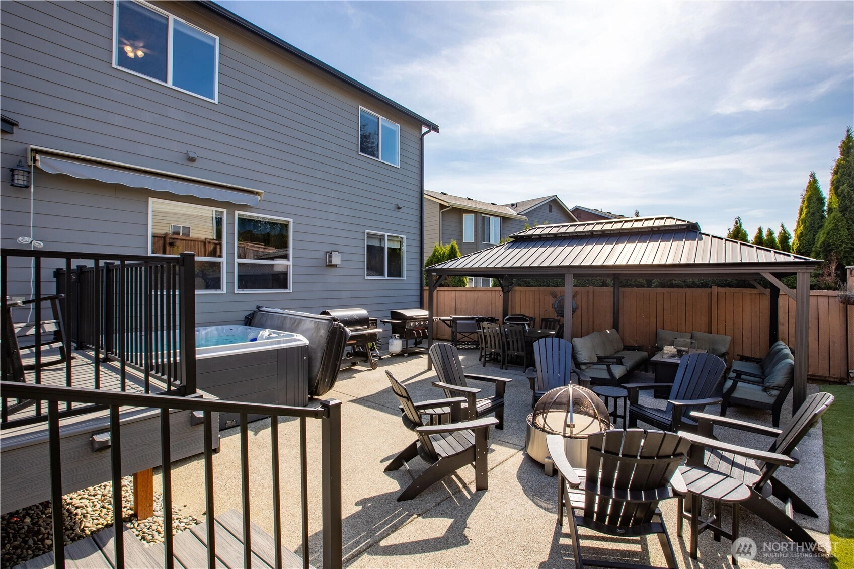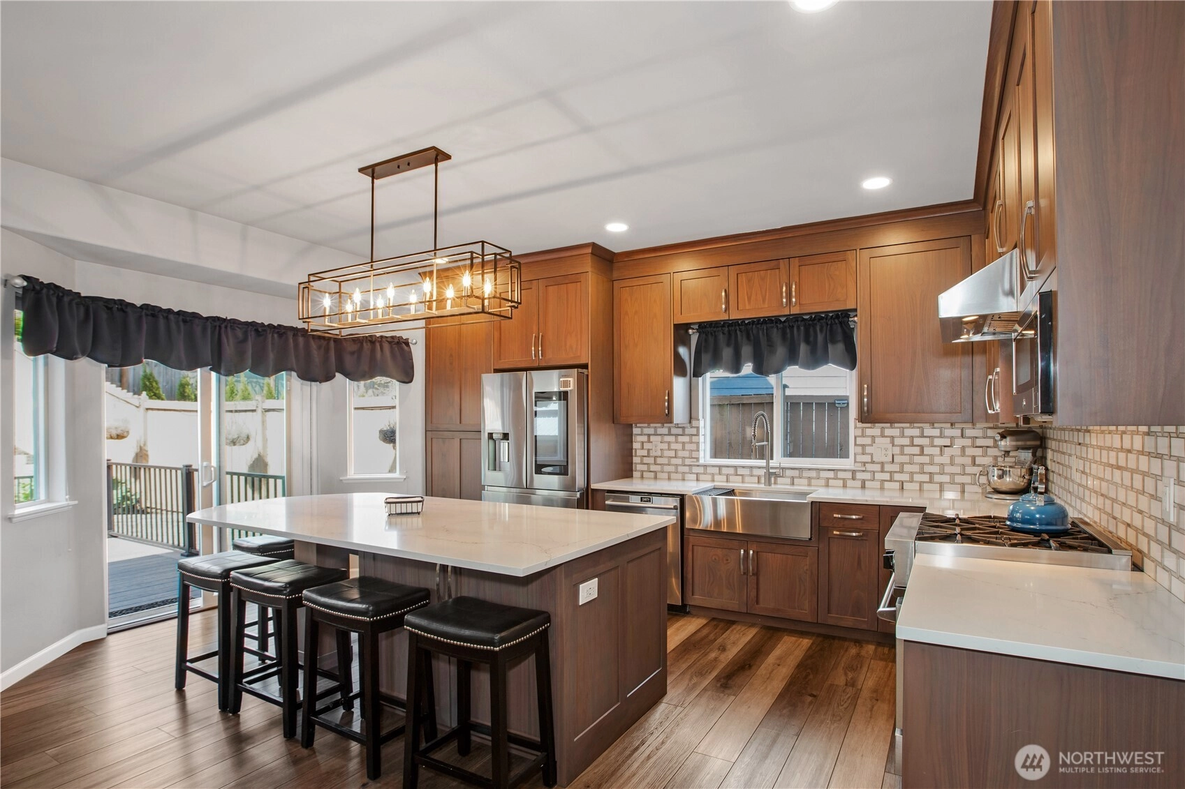 Welcome to this spacious 5-bed, 2.5-bath home with cathedral ceilings in the living and dining rooms and LVP flooring throughout. The open-concept kitchen features walnut soft-close cabinets, quartz counters with seating for 7, SS appliances, and flows into a cozy great room with a gas fireplace. A downstairs bedroom sits next to a large utility room—ideal for guests or a home office. Upstairs, enjoy a roomy primary en-suite with a soaking tub and walk-in closet, plus 3 more bedrooms. Entertain in the backyard oasis w/ Trex decking and aluminum rails, a hot tub with a retractable awning, and low-maintenance artificial turf in the front & back yards. Motivated Sellers. Pre-inspection report available