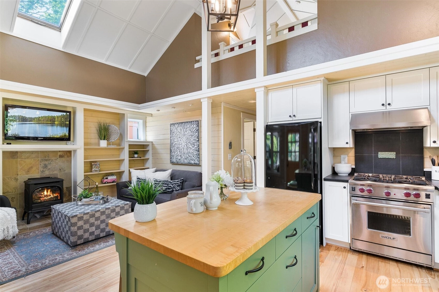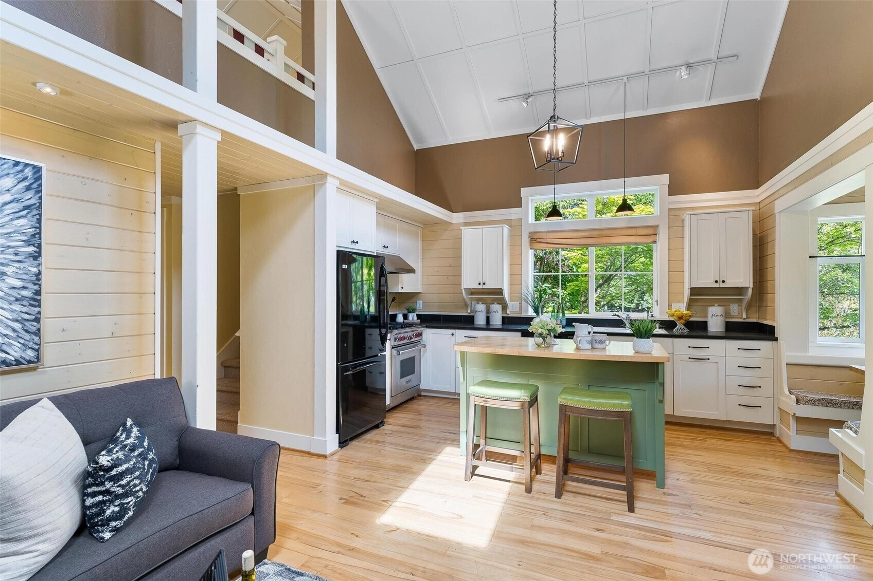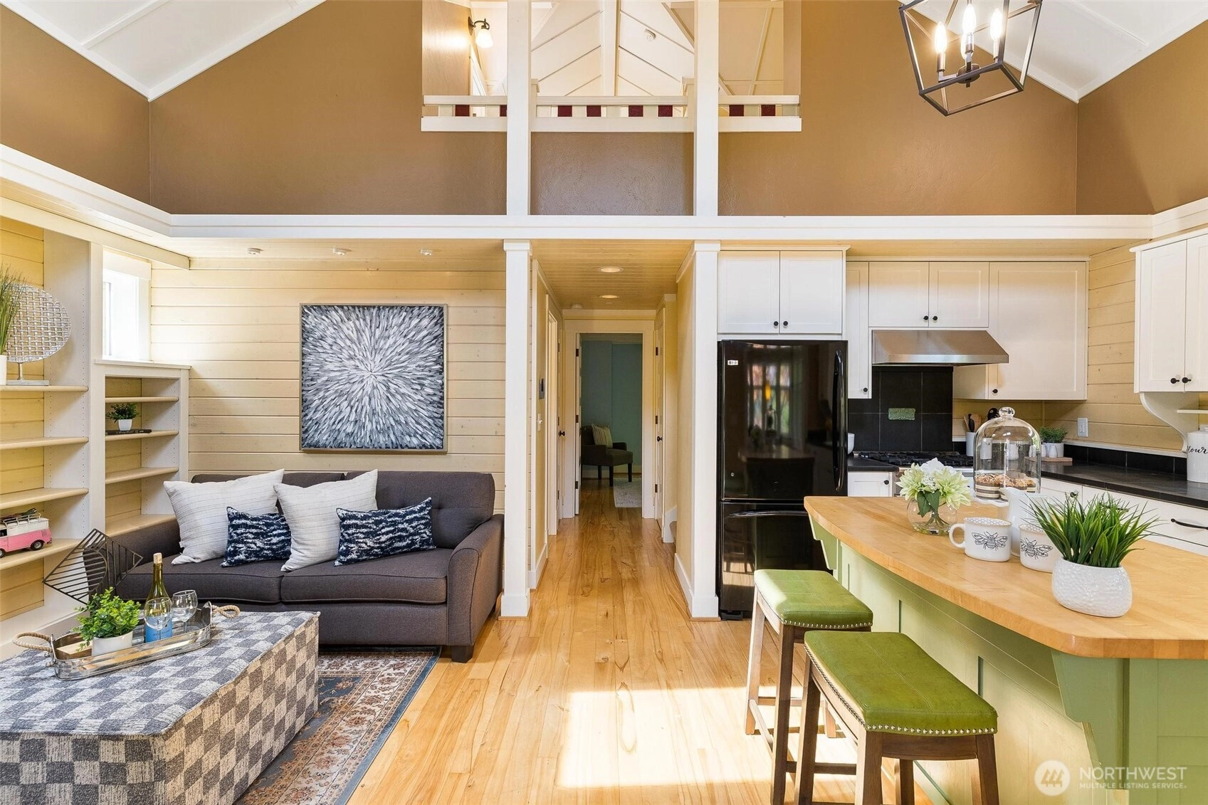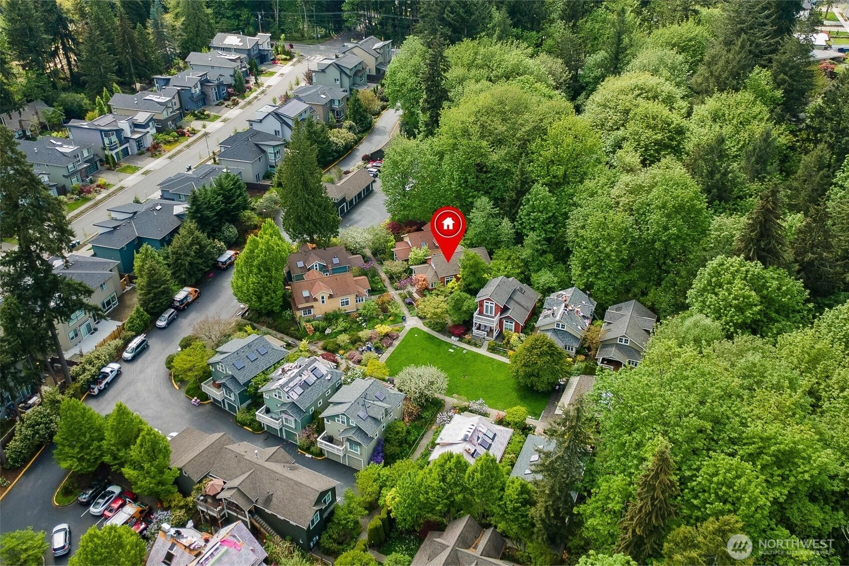 Conover Commons Cottages – Peaceful, private, and just minutes to Kirkland, Redmond, Microsoft, and nearby trails. Backing nearly 5 acres of protected woodland, this cottage blends charm with thoughtful updates. The main floor offers a bedroom, full bath, walk-in closet and a slider that opens to a private deck with tranquil forest views. The open kitchen features a maple island, Wolf range, matte granite counters, and stainless steel appliances. A cozy living room is flanked by a gas fireplace, creating a warm and inviting atmosphere. Upstairs, a spacious loft serves as a second bedroom with its own ¾ bathroom—perfect for guests or a home office. Enjoy the storybook front porch, lush gardens, and low-maintenance landscaping.