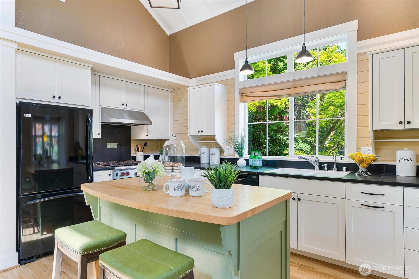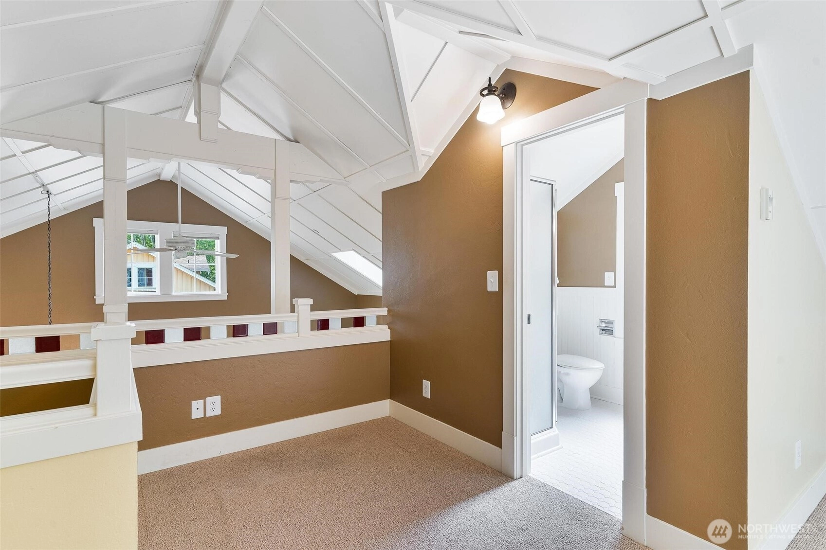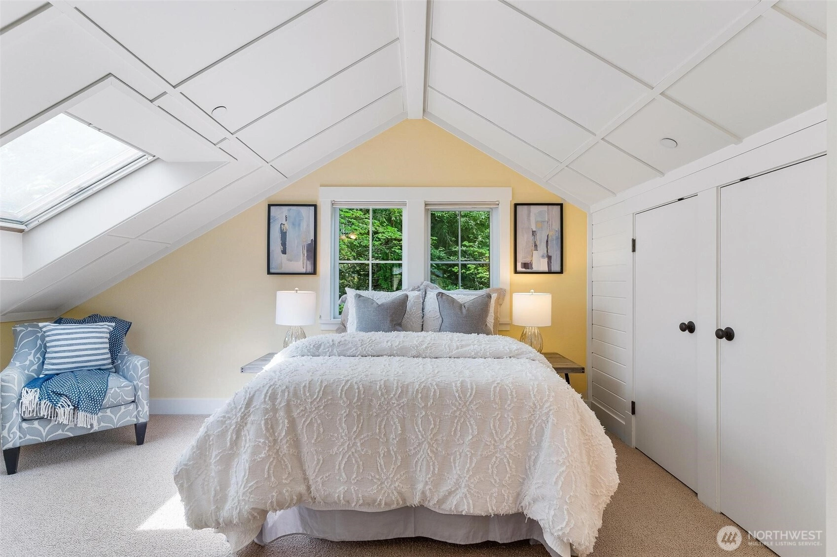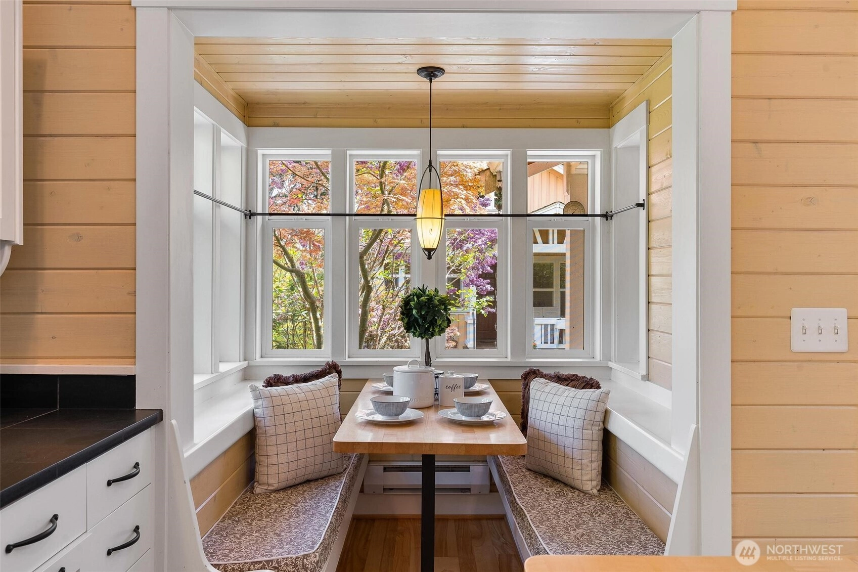 Conover Commons Cottages – Peaceful, private, and just minutes to Kirkland, Redmond, Microsoft, and nearby trails. Backing nearly 5 acres of protected woodland, this cottage blends charm with thoughtful updates. The main floor offers a bedroom, full bath, walk-in closet and a slider that opens to a private deck with tranquil forest views. The open kitchen features a maple island, Wolf range, matte granite counters, and stainless steel appliances. A cozy living room is flanked by a gas fireplace, creating a warm and inviting atmosphere. Upstairs, a spacious loft serves as a second bedroom with its own ¾ bathroom—perfect for guests or a home office. Enjoy the storybook front porch, lush gardens, and low-maintenance landscaping.