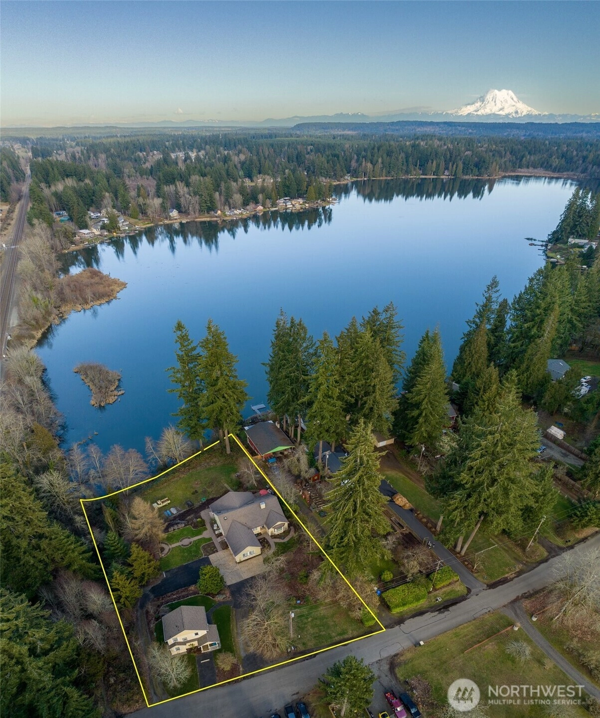 Charming one-story home with an 806 sf ADU situated on over an acre w/ 150ft of medium-bank frontage on Pattison Lake. This peaceful lake offers swimming, kayaking, & fishing. Enjoy a private dock & views of Mt. Rainier & the lake from the deck & several rooms. Main house includes a spacious kitchen, formal dining, & two living spaces. Features include oak hardwood, a pellet stove, & Corian countertops. Primary bedroom offers a 5-piece bath w/ a soaking tub, + French doors that open to the deck & lake view. Two addt’l bedrooms & full bath. New Roof! Detached ADU provides privacy for guests or tenants, w/ a loft sleeping area & 1.25 baths. Ample parking is available, & the location offers convenient access to shopping, dining, & I-5.