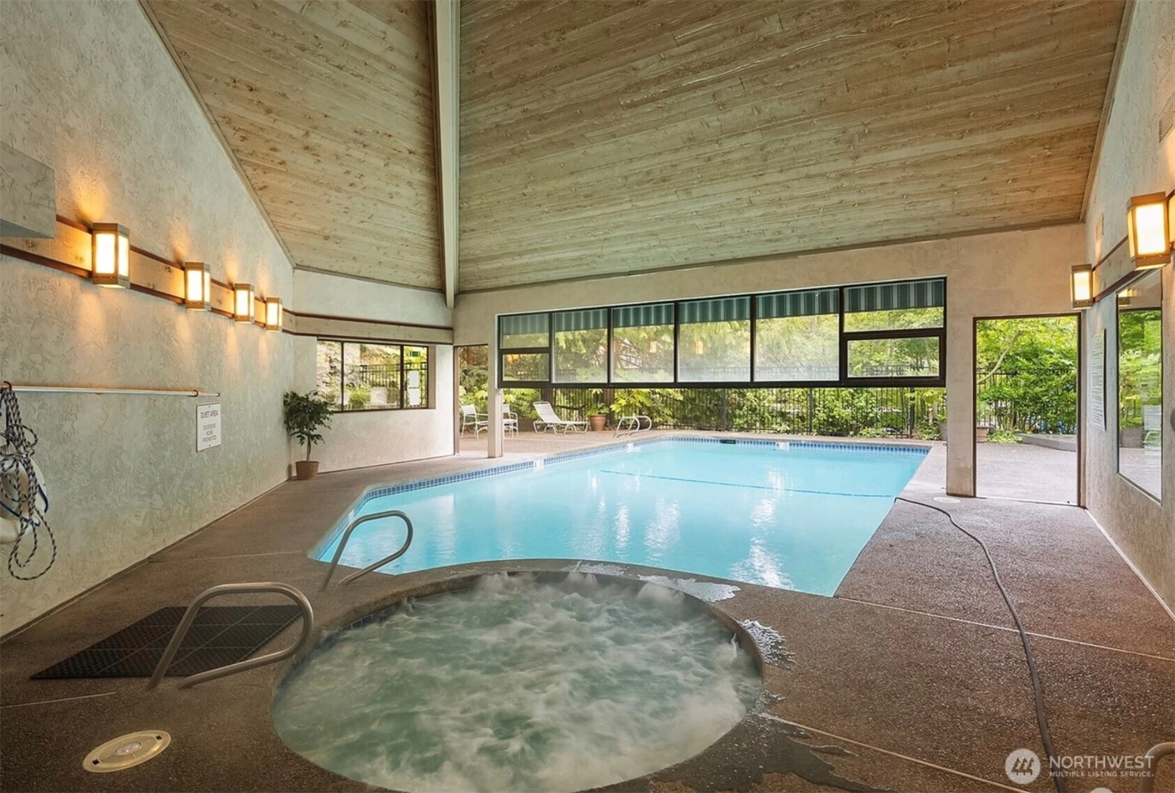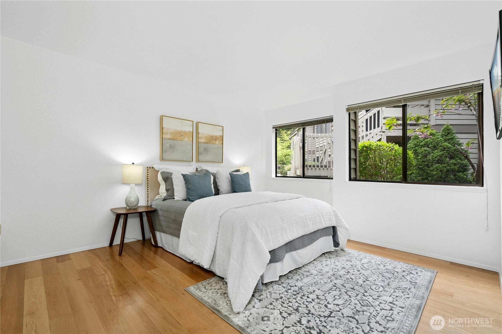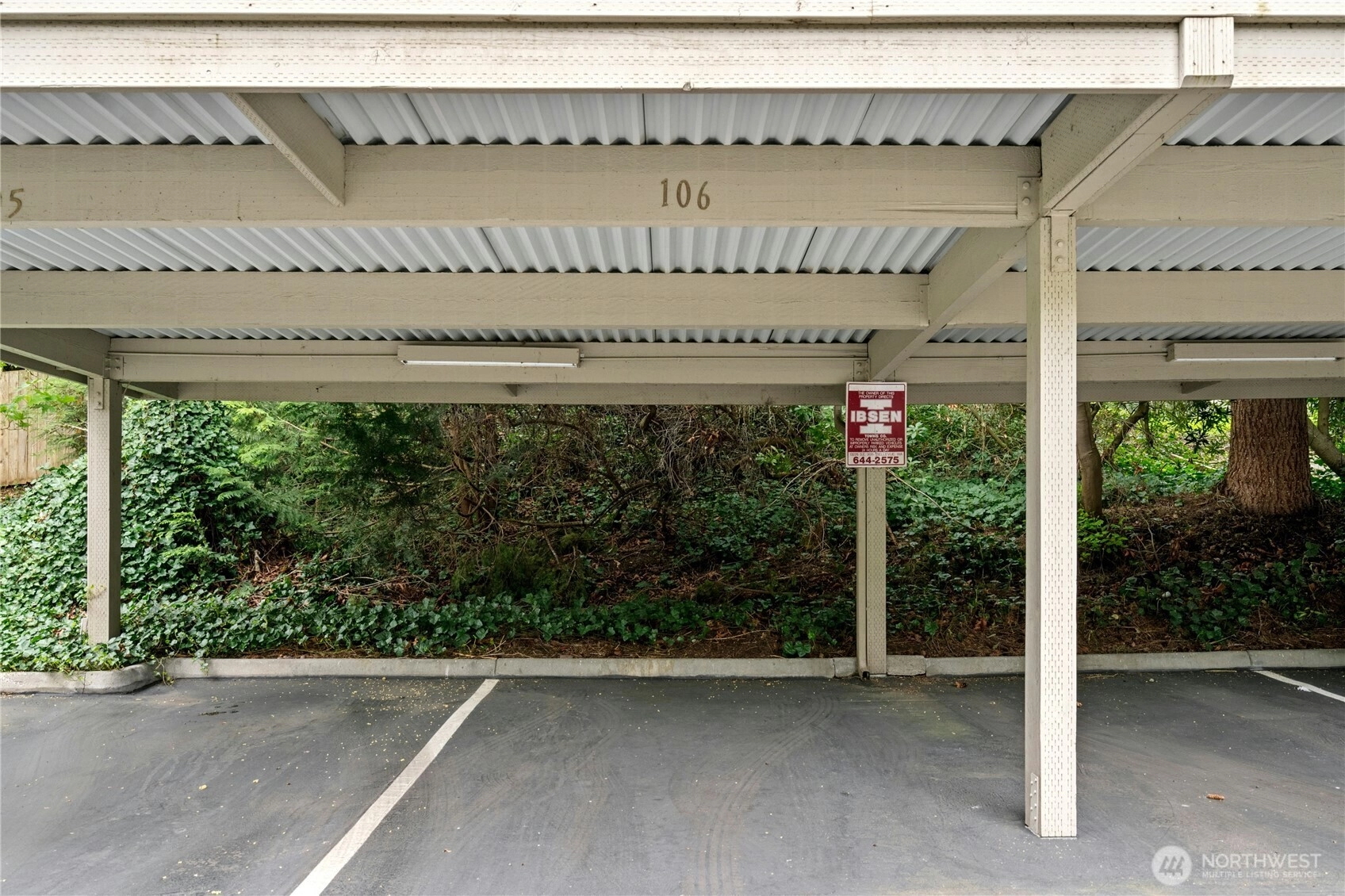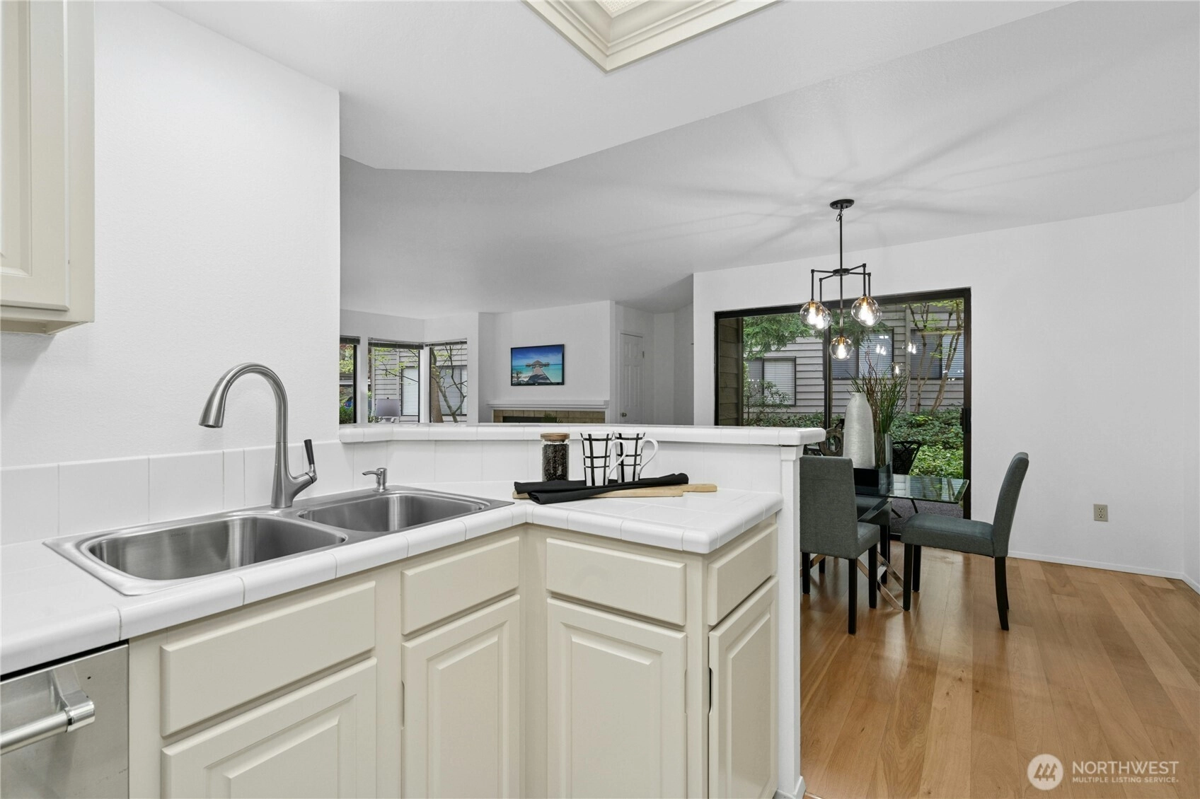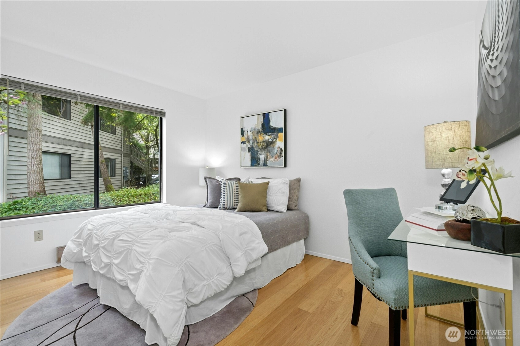 Don't miss this rare opportunity to live in the heart of Downtown Bellevue in a serene, park-like community. This refreshed condo offers ultimate convenience just blocks from world-class shopping, dining, parks, and the new Amazon Towers. Recently updated with fresh paint and new stainless steel appliances, the home features rich hardwood floors, abundant natural light, and a warm inviting atmosphere. The spacious layout includes large bedrooms, generous living room with a cozy wood-burning fireplace, separate dining area, and tranquil primary suite with a walk-in closet and private bath. Located at the quiet back of the property with dedicated covered parking. Clubhouse, indoor/outdoor pool/hot tub. Pet friendly.Top-rated Bellevue schools!