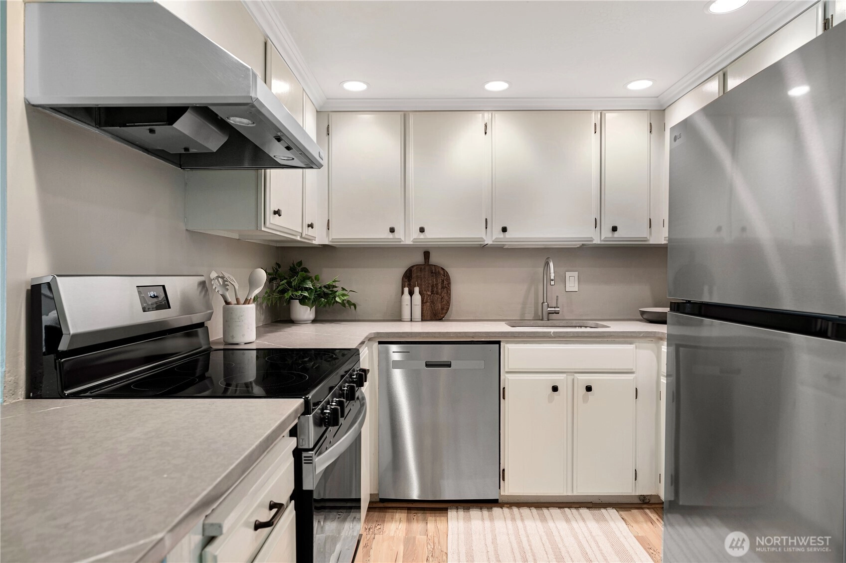 Welcome to Hill House Condominiums~Located on the desirable south slope of Queen Anne, this NE corner unit offers 2 bedrooms and 1.5 baths in a prime location with a Walk Score of 91. Recent updates include brand new stainless steel appliances, quartz countertops, and fresh carpeting throughout. From both bedrooms, enjoy views of the Space Needle and the sparkling city skyline. The home overlooks a beautifully landscaped community garden and includes a functional kitchen, open living area, extra storage, and a deeded parking space in a secure garage. Situated on a quiet street just minutes from downtown Seattle, South Lake Union, and a wide variety of shopping, dining, and entertainment options. Cats friendly.
