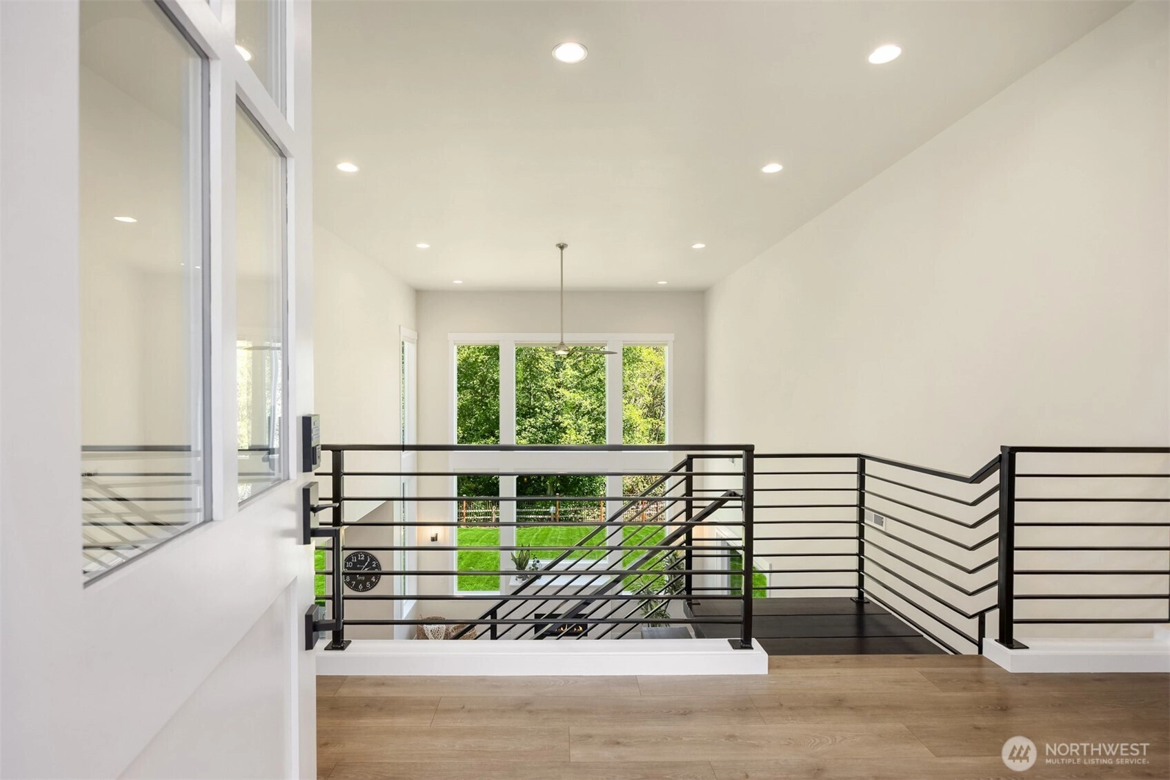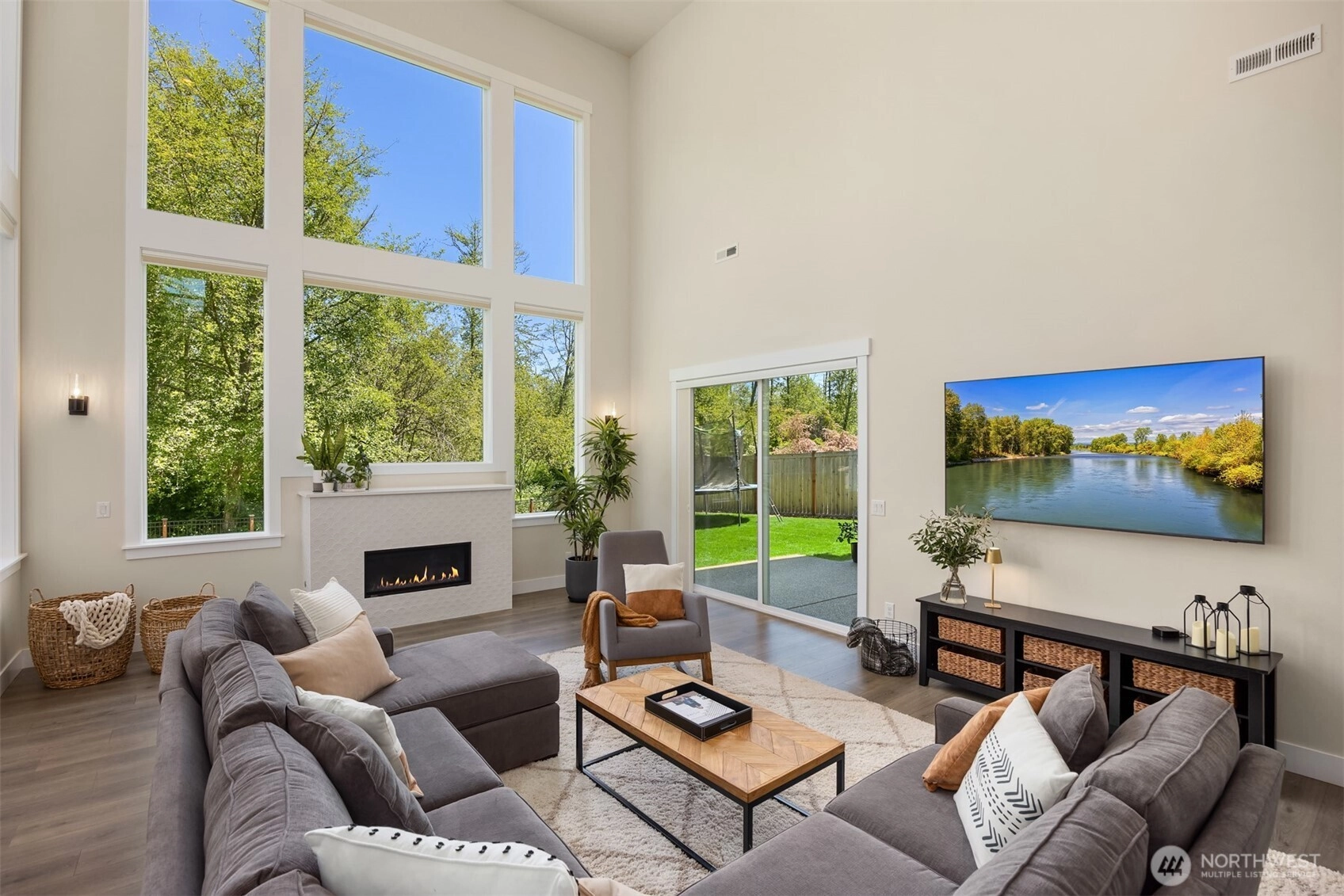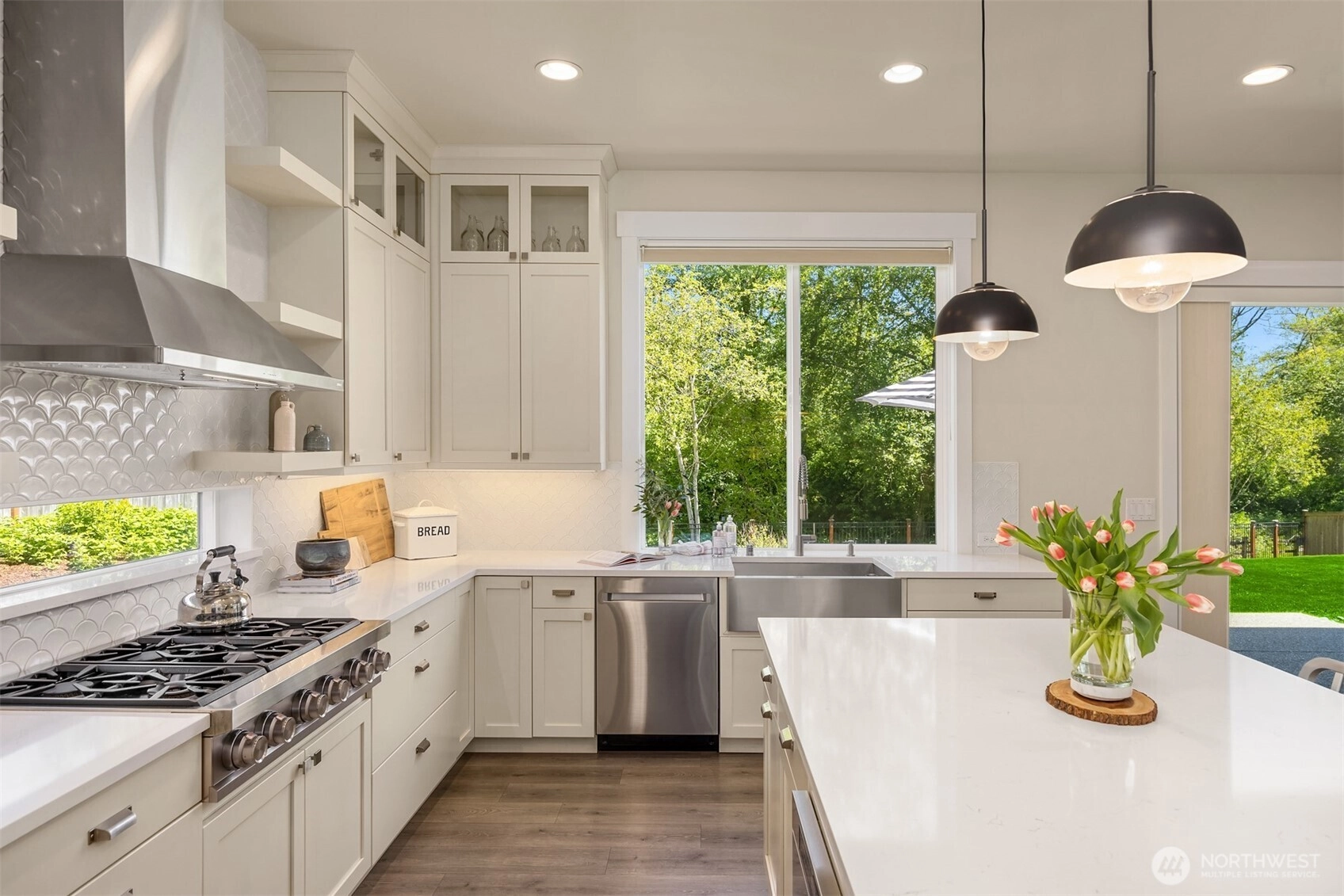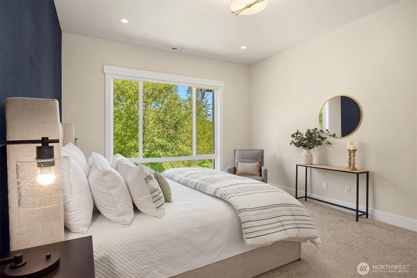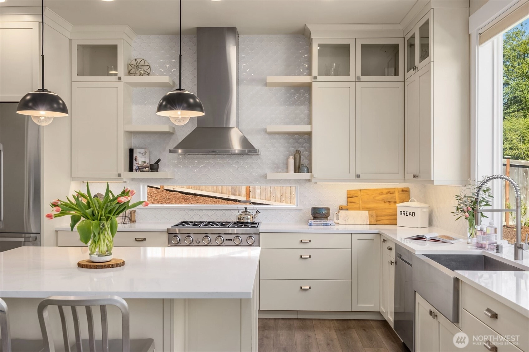 Four-bedroom modern craftsman with expansive and flexible living spaces that backs to protected green open space. Large primary suite with your dream walk-in closet-room is on the main level. Two more bedrooms, a bonus room, and laundry are on the opposite end of the wing and complete the main level. A modern staircase overlooks the bright living level with a dramatic wall-of-windows, chef's kitchen, home gym or office and private guest suite. The upper level offers a game room/bonus room plus a nanny suite, office or guest room with a full bathroom. Ample storage. Fun, fully fenced backyard with mature landscaping. EV-Charger, Cat-6 and Fiber. Less than a mile to the ferry and close to all levels of schools. An impressive, in-town package.