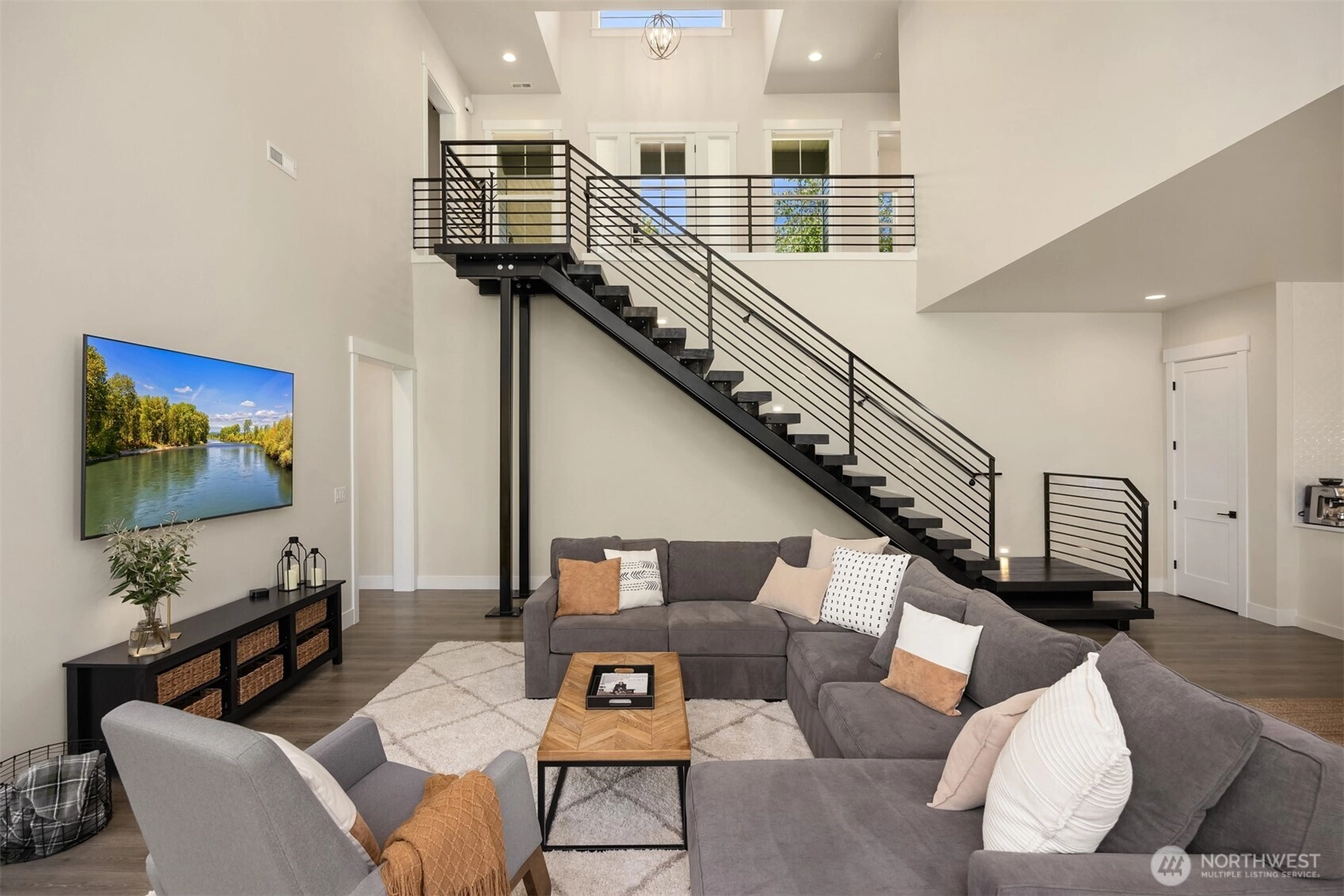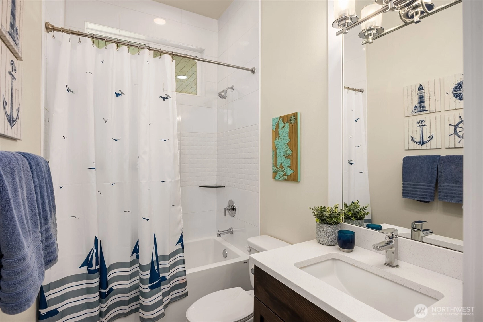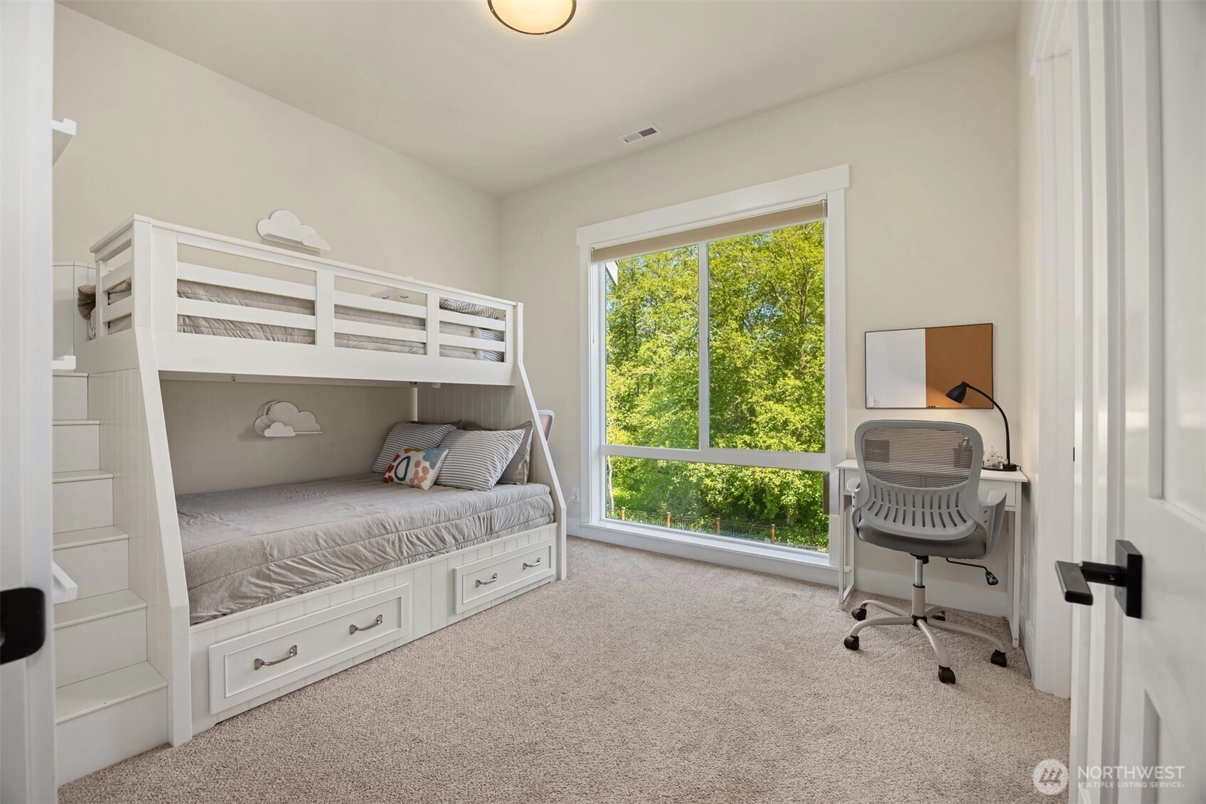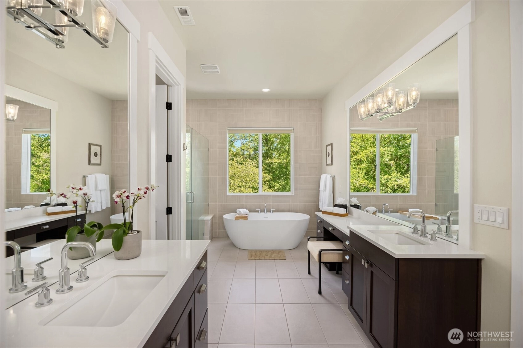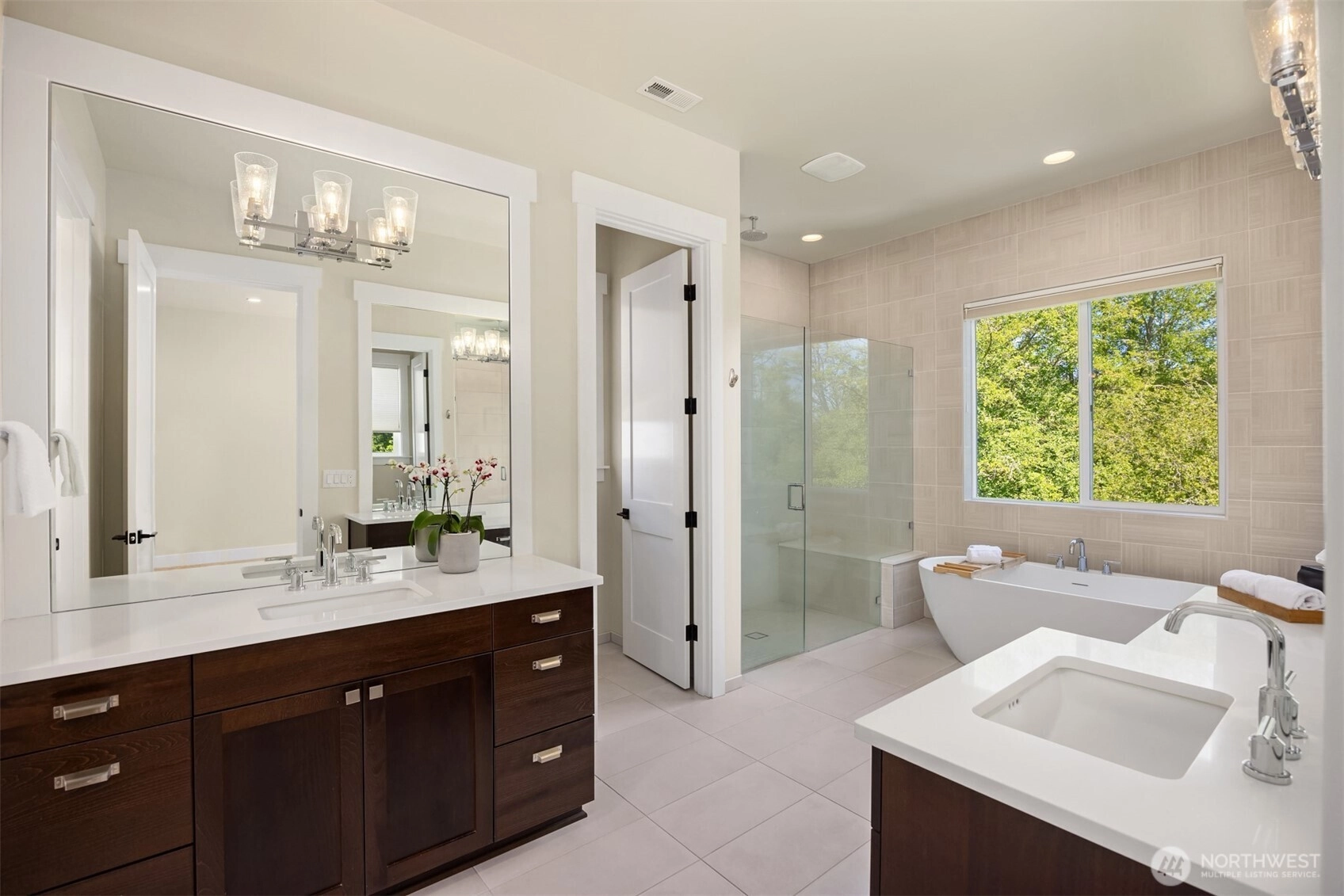 Four-bedroom modern craftsman with expansive and flexible living spaces that backs to protected green open space. Large primary suite with your dream walk-in closet-room is on the main level. Two more bedrooms, a bonus room, and laundry are on the opposite end of the wing and complete the main level. A modern staircase overlooks the bright living level with a dramatic wall-of-windows, chef's kitchen, home gym or office and private guest suite. The upper level offers a game room/bonus room plus a nanny suite, office or guest room with a full bathroom. Ample storage. Fun, fully fenced backyard with mature landscaping. EV-Charger, Cat-6 and Fiber. Less than a mile to the ferry and close to all levels of schools. An impressive, in-town package.