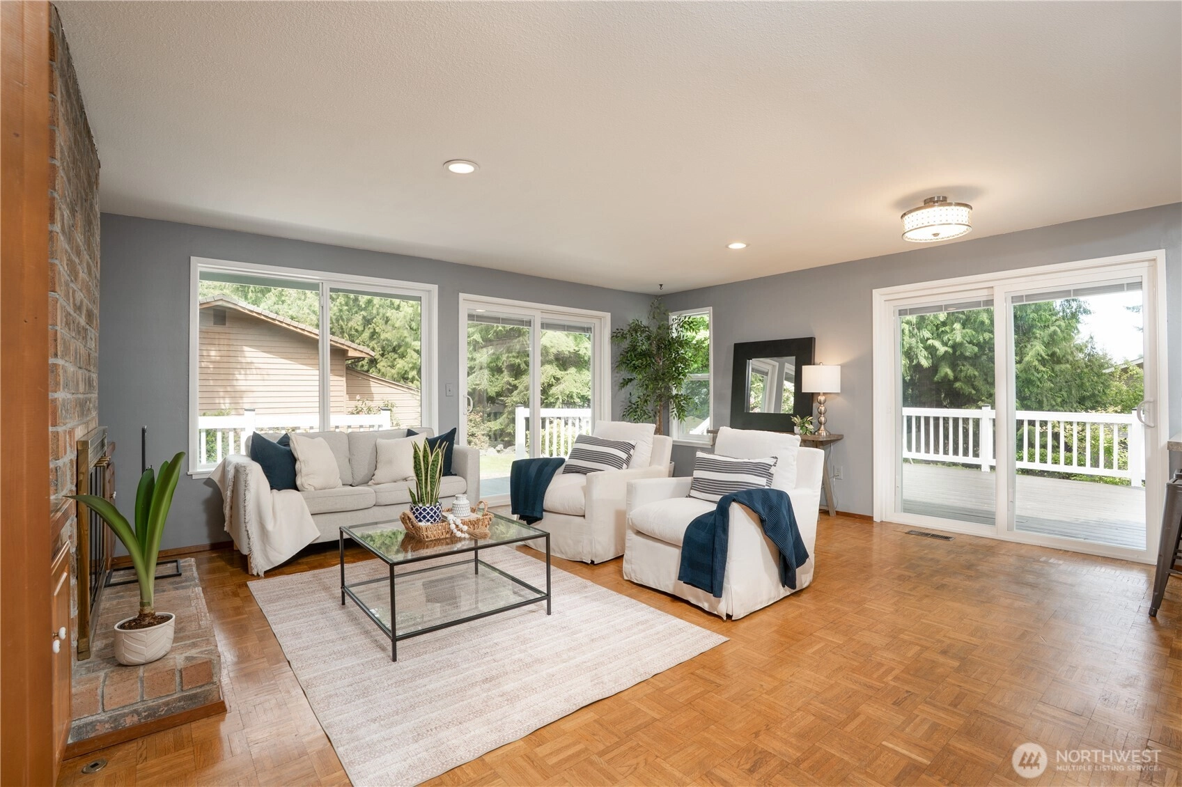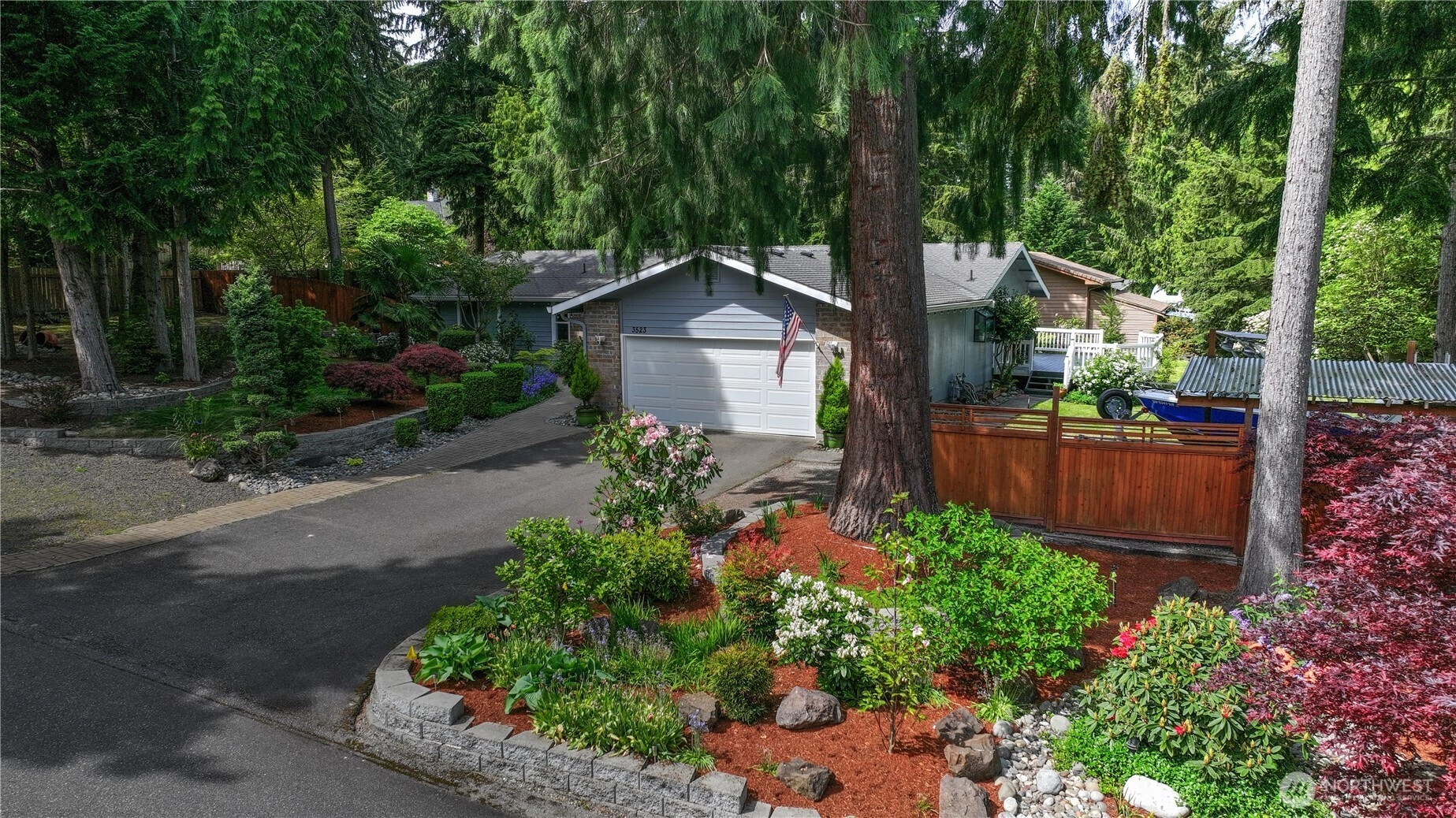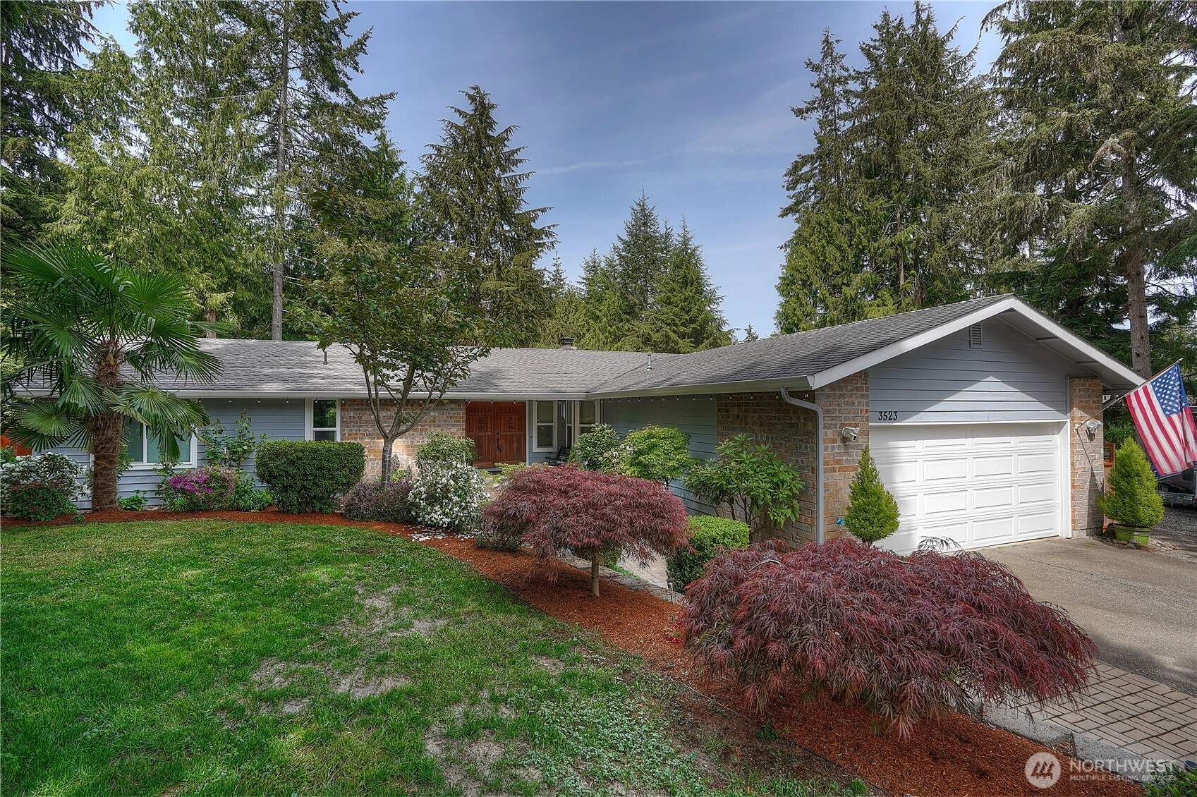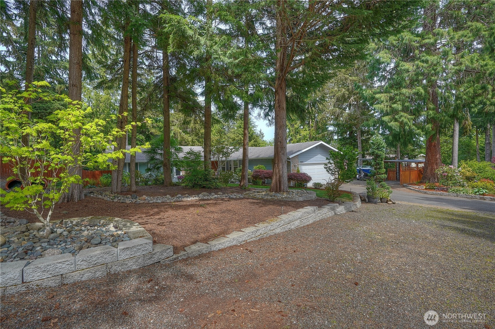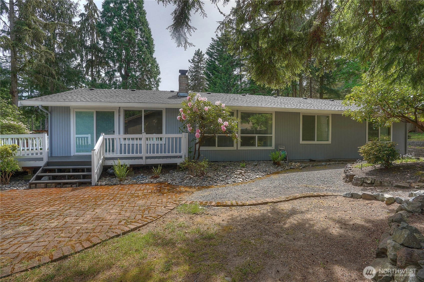 Tucked in the neighborhood of Forest Ridge, this move-in ready 3 bed, 1.75 bath rambler quietly screams PNW charm amidst this private setting. The home features a spacious living room with large new vinyl windows offering serene views of the mature landscaping. French doors lead to a family room that seamlessly connects to the kitchen and a generous wrap-around deck, ideal for outdoor entertaining. A dual-sided gas fireplace adds warmth and character, complemented by built-in cabinetry on each side. Situated on 0.43-acres providing a tranquil and private living experience, while still being conveniently close to Gig Harbor North Shopping and Highway 16 access.