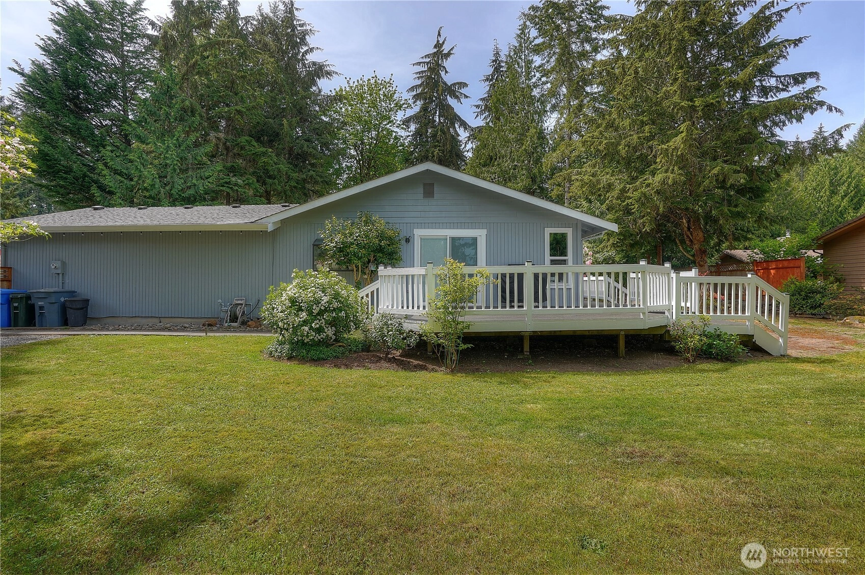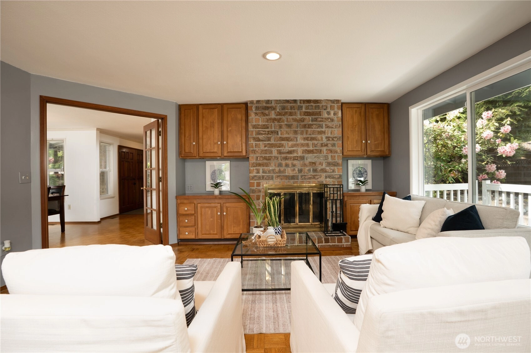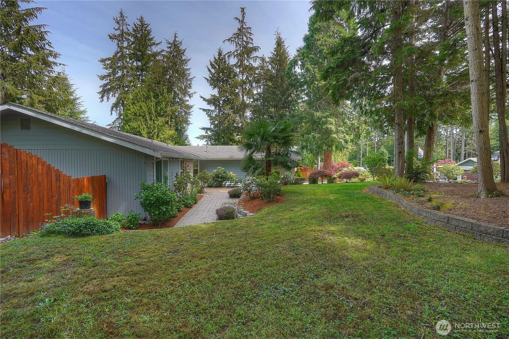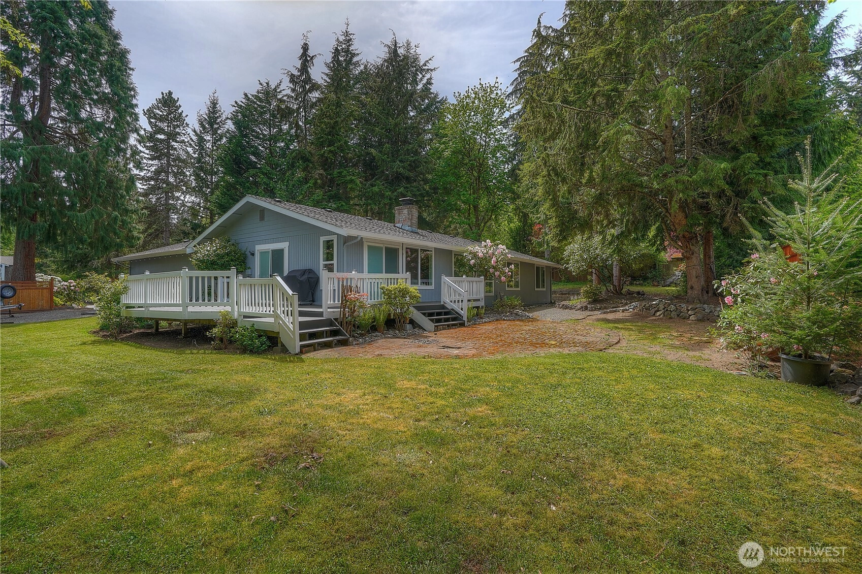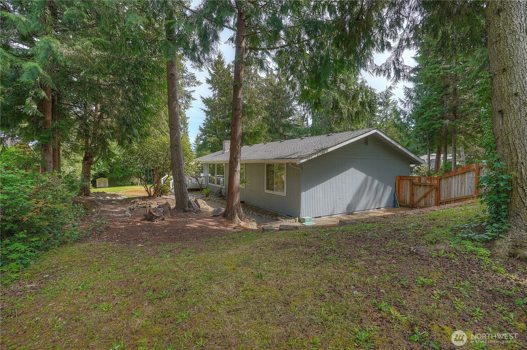 Tucked in the neighborhood of Forest Ridge, this move-in ready 3 bed, 1.75 bath rambler quietly screams PNW charm amidst this private setting. The home features a spacious living room with large new vinyl windows offering serene views of the mature landscaping. French doors lead to a family room that seamlessly connects to the kitchen and a generous wrap-around deck, ideal for outdoor entertaining. A dual-sided gas fireplace adds warmth and character, complemented by built-in cabinetry on each side. Situated on 0.43-acres providing a tranquil and private living experience, while still being conveniently close to Gig Harbor North Shopping and Highway 16 access.