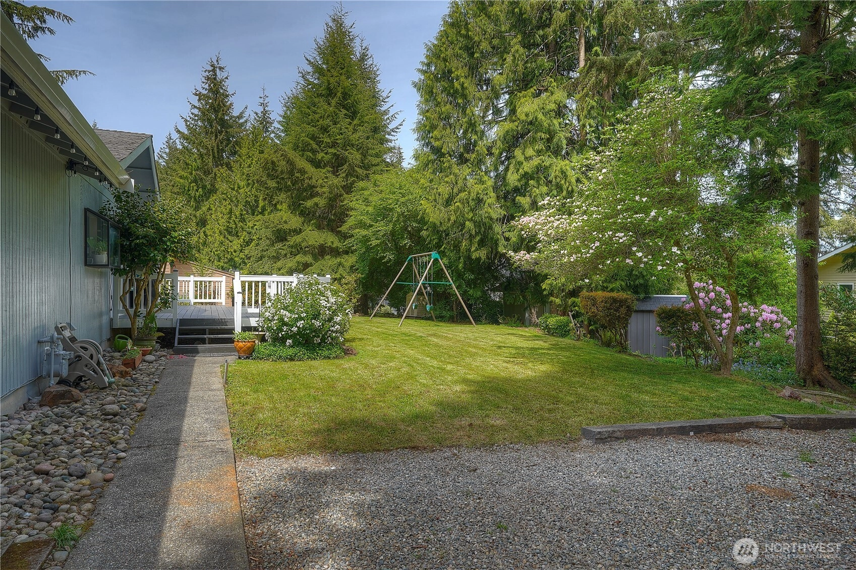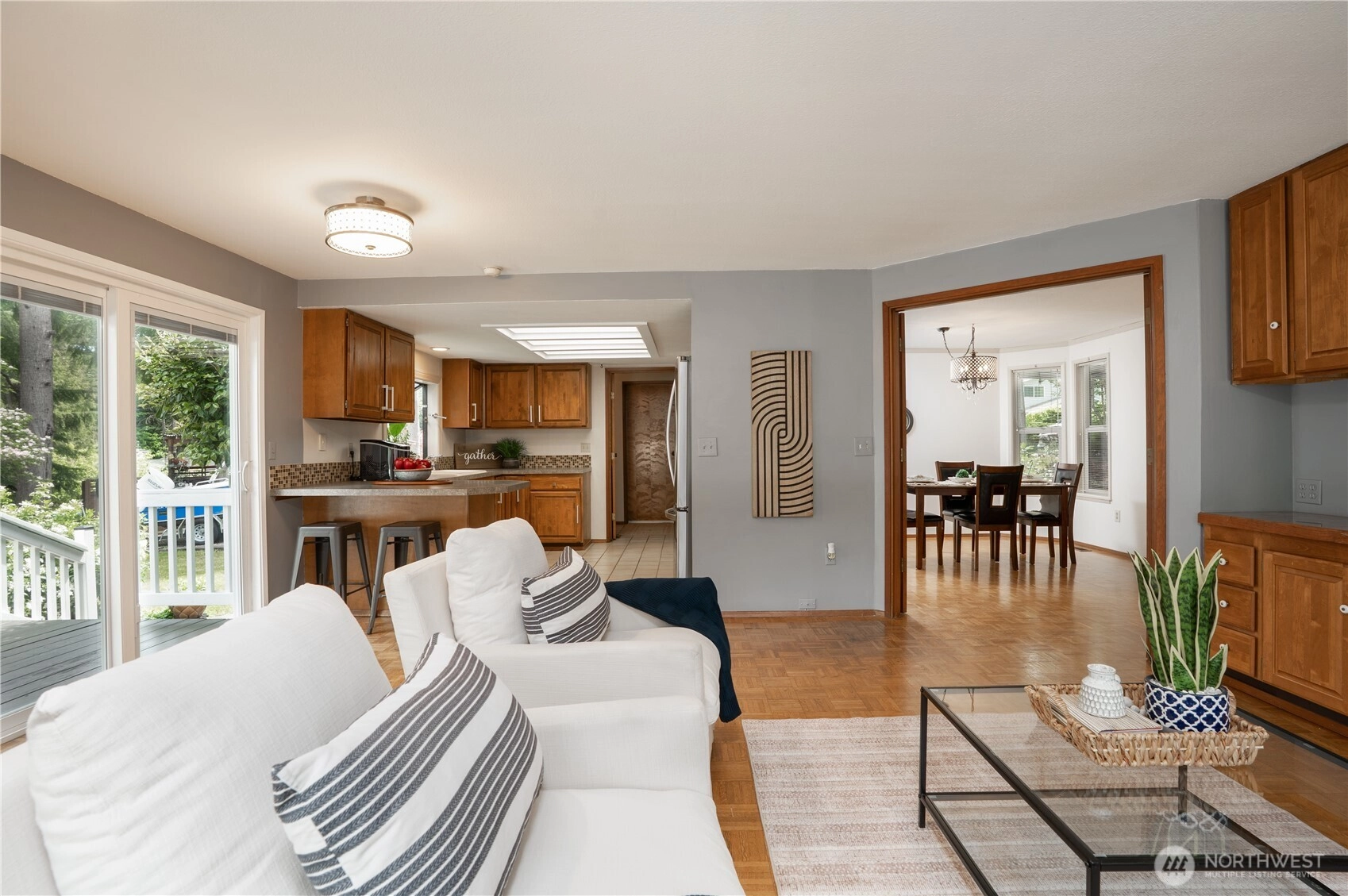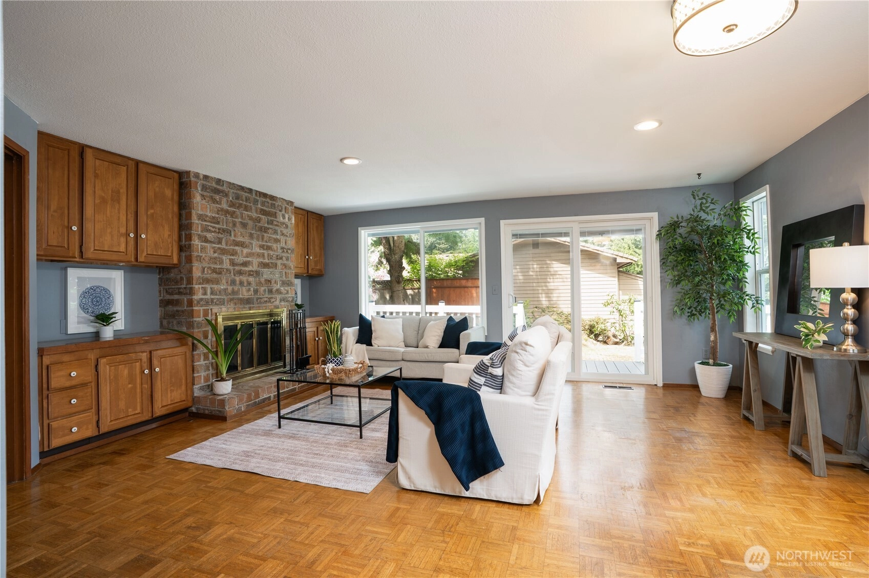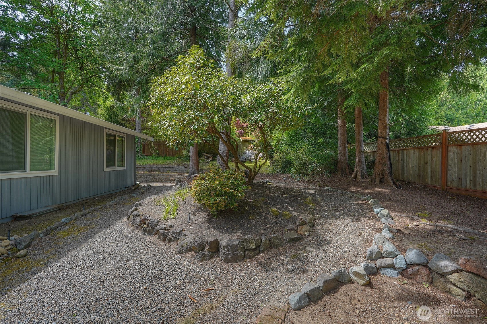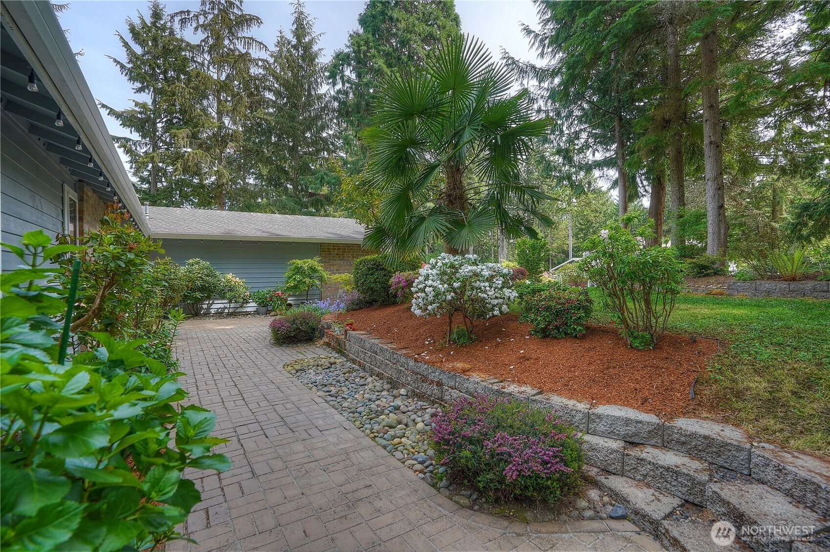 Tucked in the neighborhood of Forest Ridge, this move-in ready 3 bed, 1.75 bath rambler quietly screams PNW charm amidst this private setting. The home features a spacious living room with large new vinyl windows offering serene views of the mature landscaping. French doors lead to a family room that seamlessly connects to the kitchen and a generous wrap-around deck, ideal for outdoor entertaining. A dual-sided gas fireplace adds warmth and character, complemented by built-in cabinetry on each side. Situated on 0.43-acres providing a tranquil and private living experience, while still being conveniently close to Gig Harbor North Shopping and Highway 16 access.