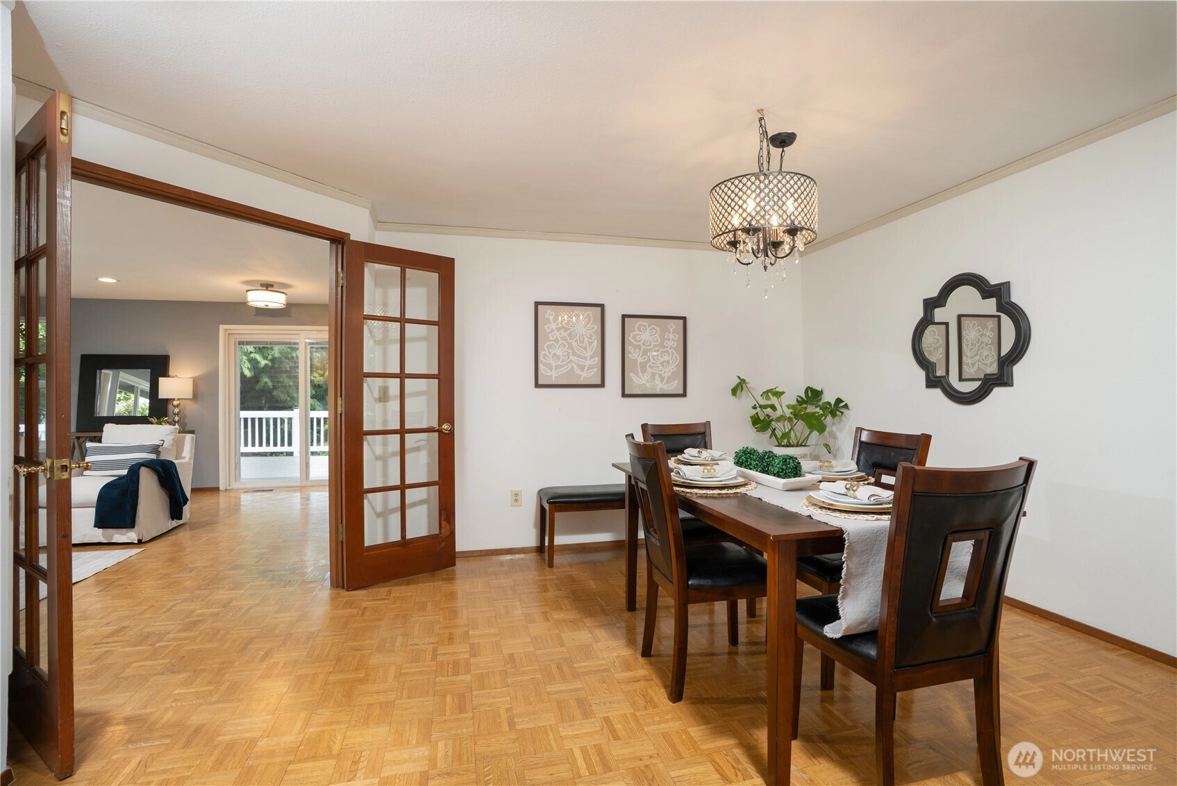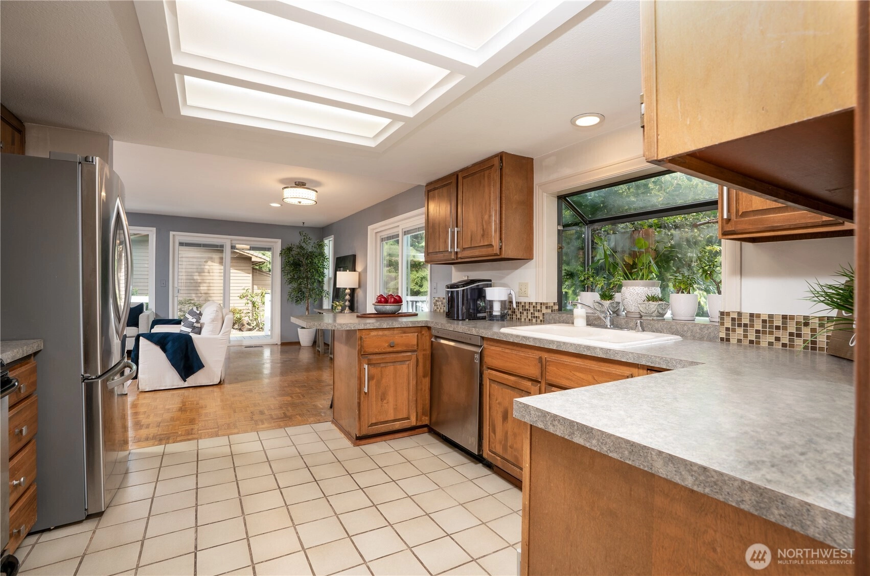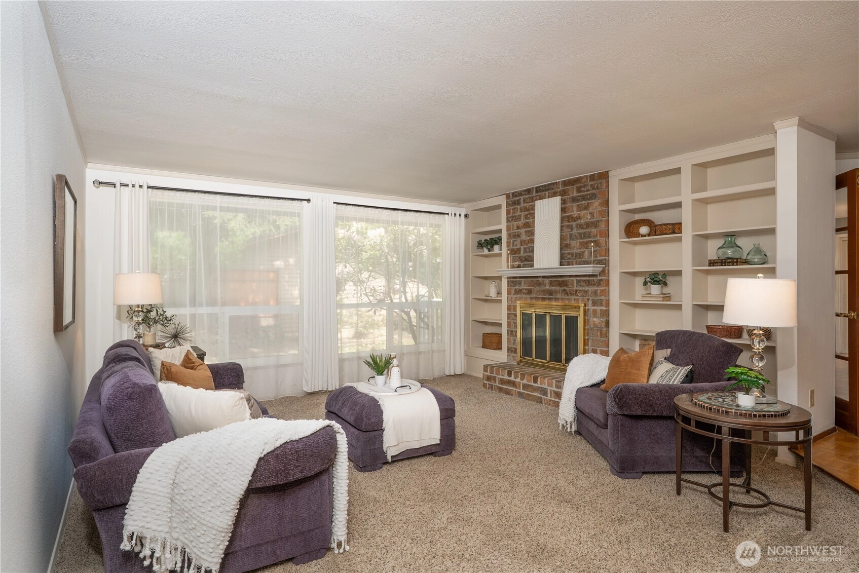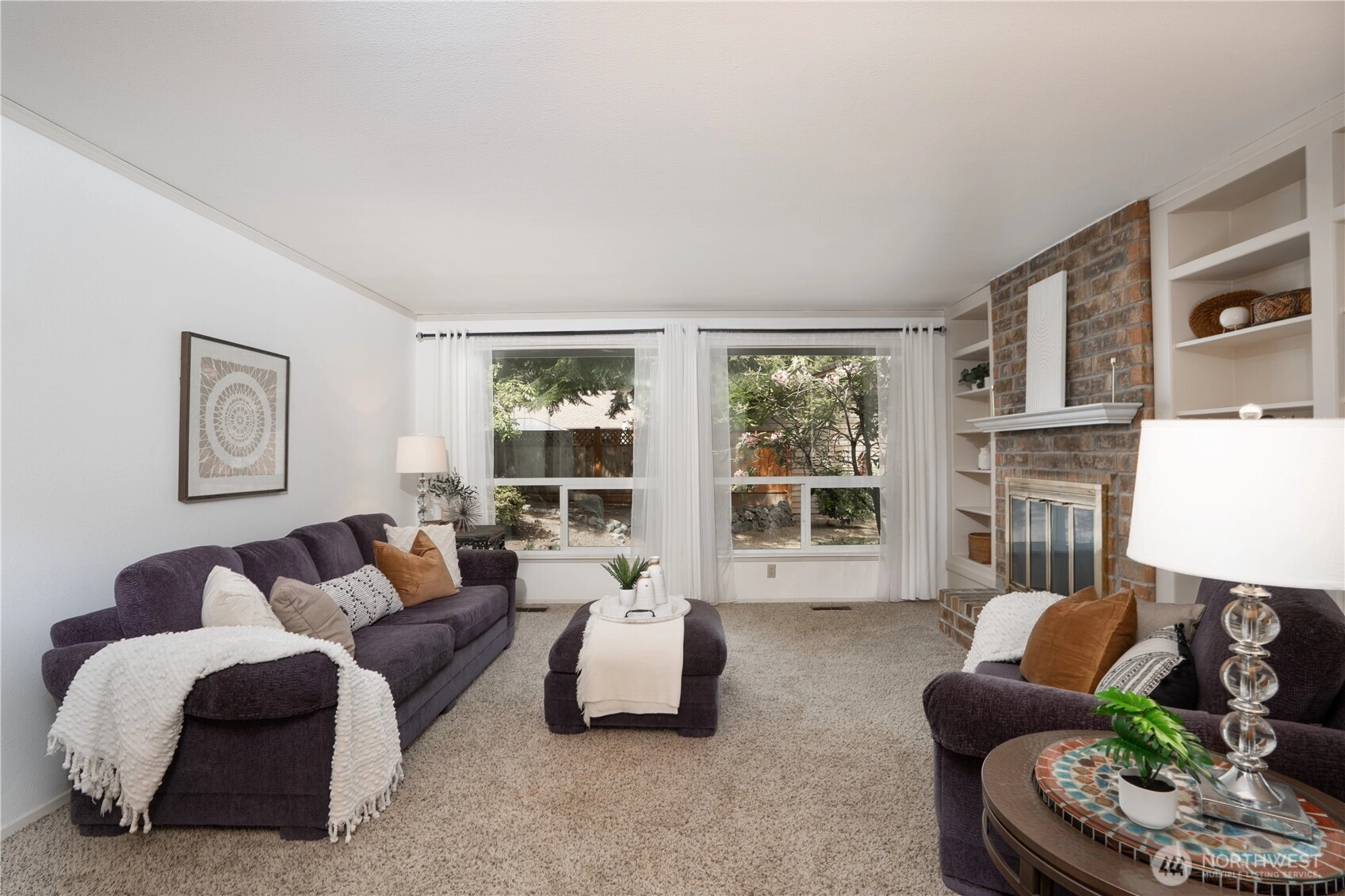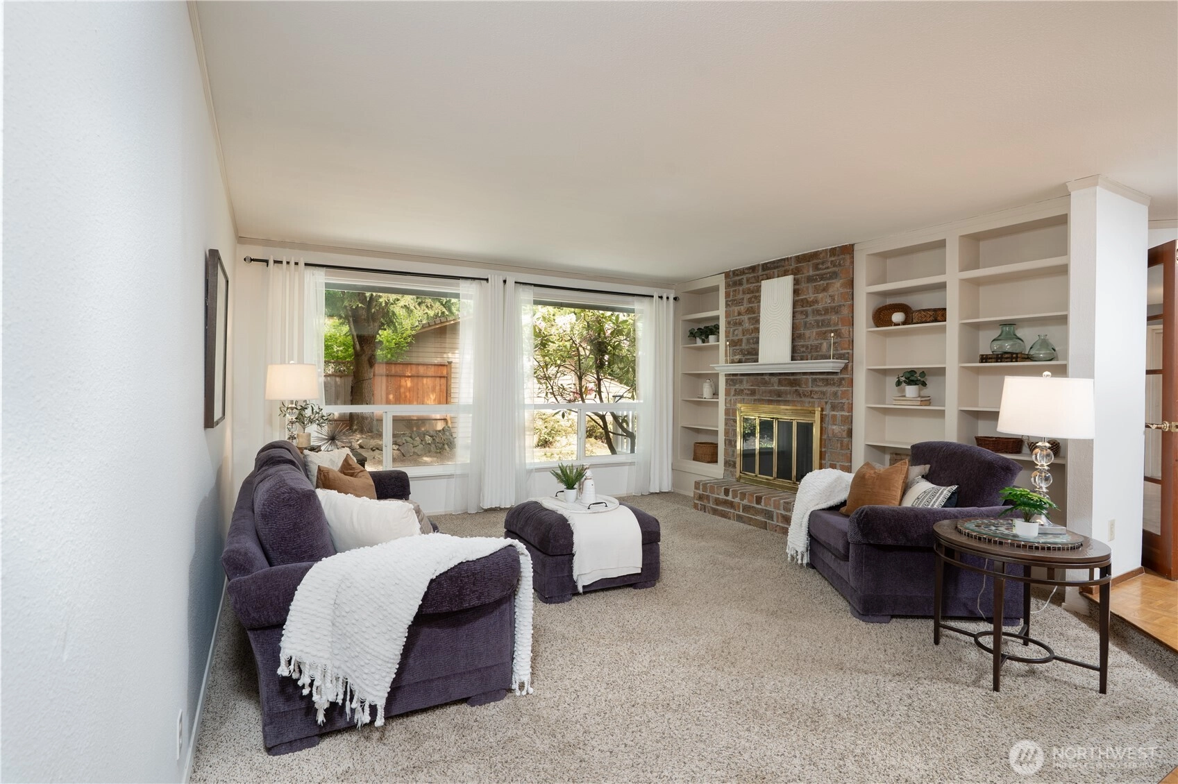 Tucked in the neighborhood of Forest Ridge, this move-in ready 3 bed, 1.75 bath rambler quietly screams PNW charm amidst this private setting. The home features a spacious living room with large new vinyl windows offering serene views of the mature landscaping. French doors lead to a family room that seamlessly connects to the kitchen and a generous wrap-around deck, ideal for outdoor entertaining. A dual-sided gas fireplace adds warmth and character, complemented by built-in cabinetry on each side. Situated on 0.43-acres providing a tranquil and private living experience, while still being conveniently close to Gig Harbor North Shopping and Highway 16 access.