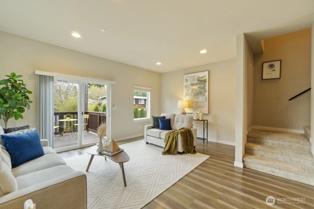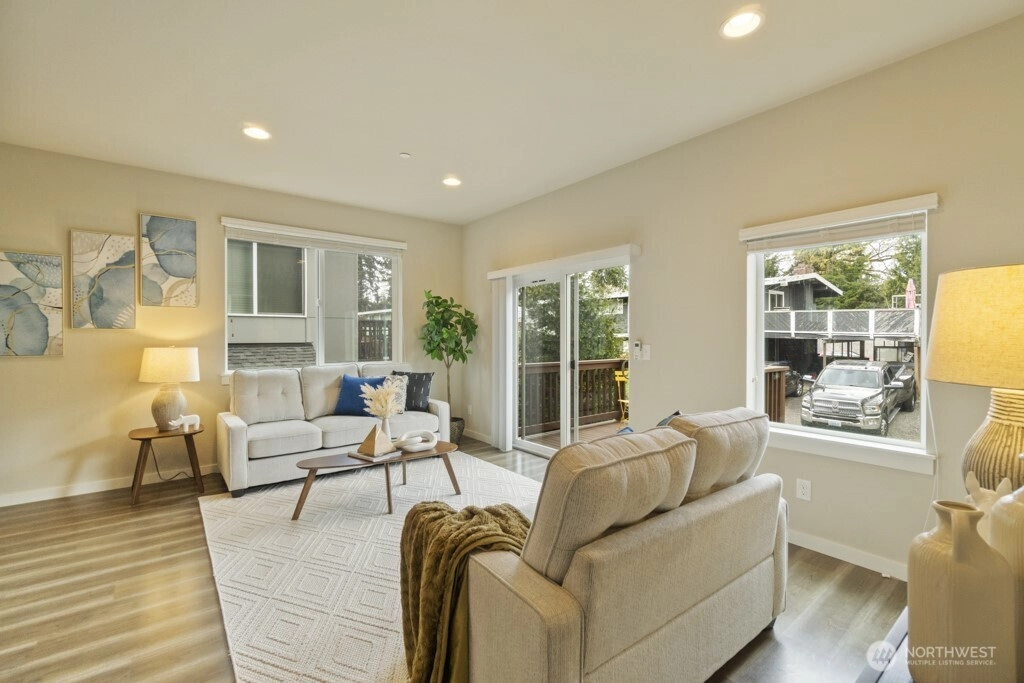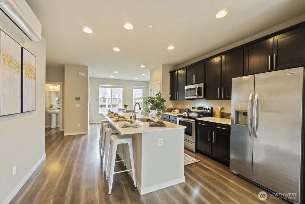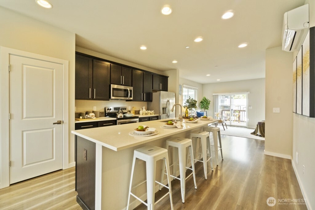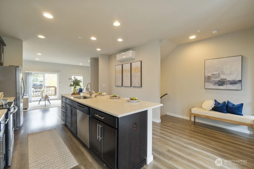 Located just north of Seattle in Lynnwood, this modern townhouse offers a blend of space, style, & convenience. It features 4 bedrooms & 3.25 bathrooms, including 2 ensuite primary bedrooms—ideal for flexible living or guests. The open layout is filled w/natural light, tall ceilings, & a modern color palette. The gourmet kitchen has quartz countertops, stainless steel appliances, & a pantry—perfect for everyday living & entertaining. Mini-split system + smart home features offer year-round comfort. Outside, enjoy a freshly stained deck, new sod, fenced yard, & 2-car garage. Conveniently located near I-5/I-405, Alderwood Mall, Interurban trail, Martha Lake, a dog park, & the upcoming Light Rail with easy Park & Ride access. Move-in ready!