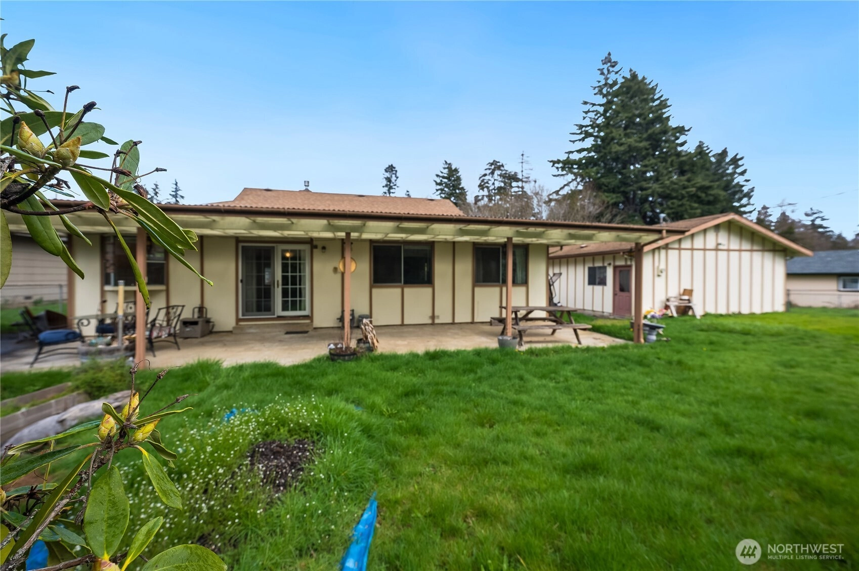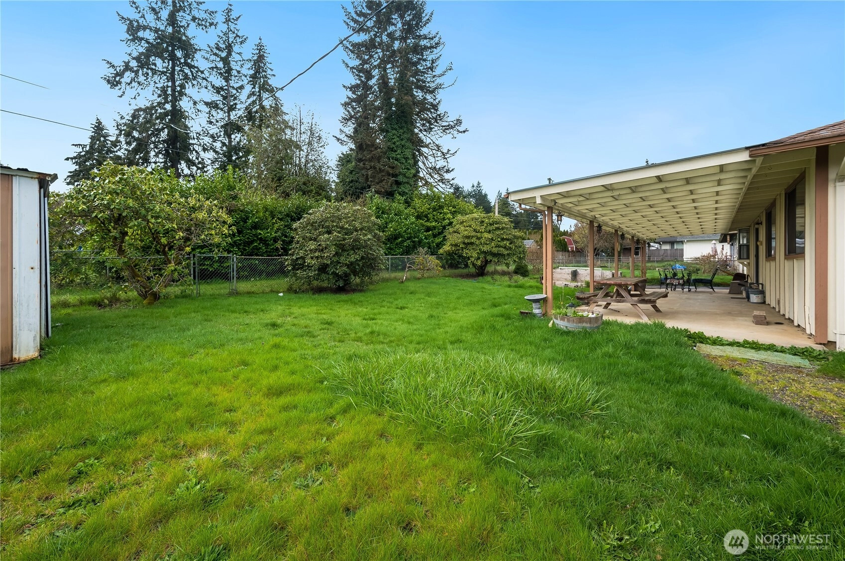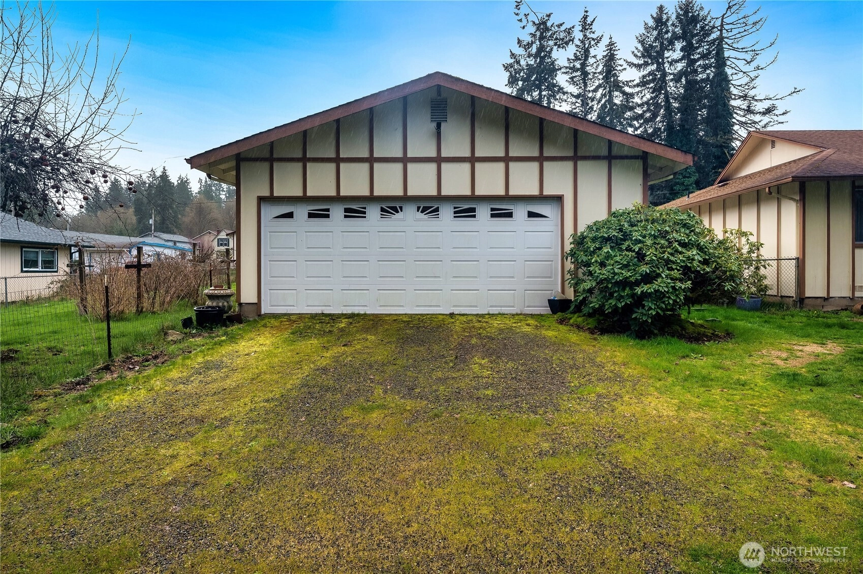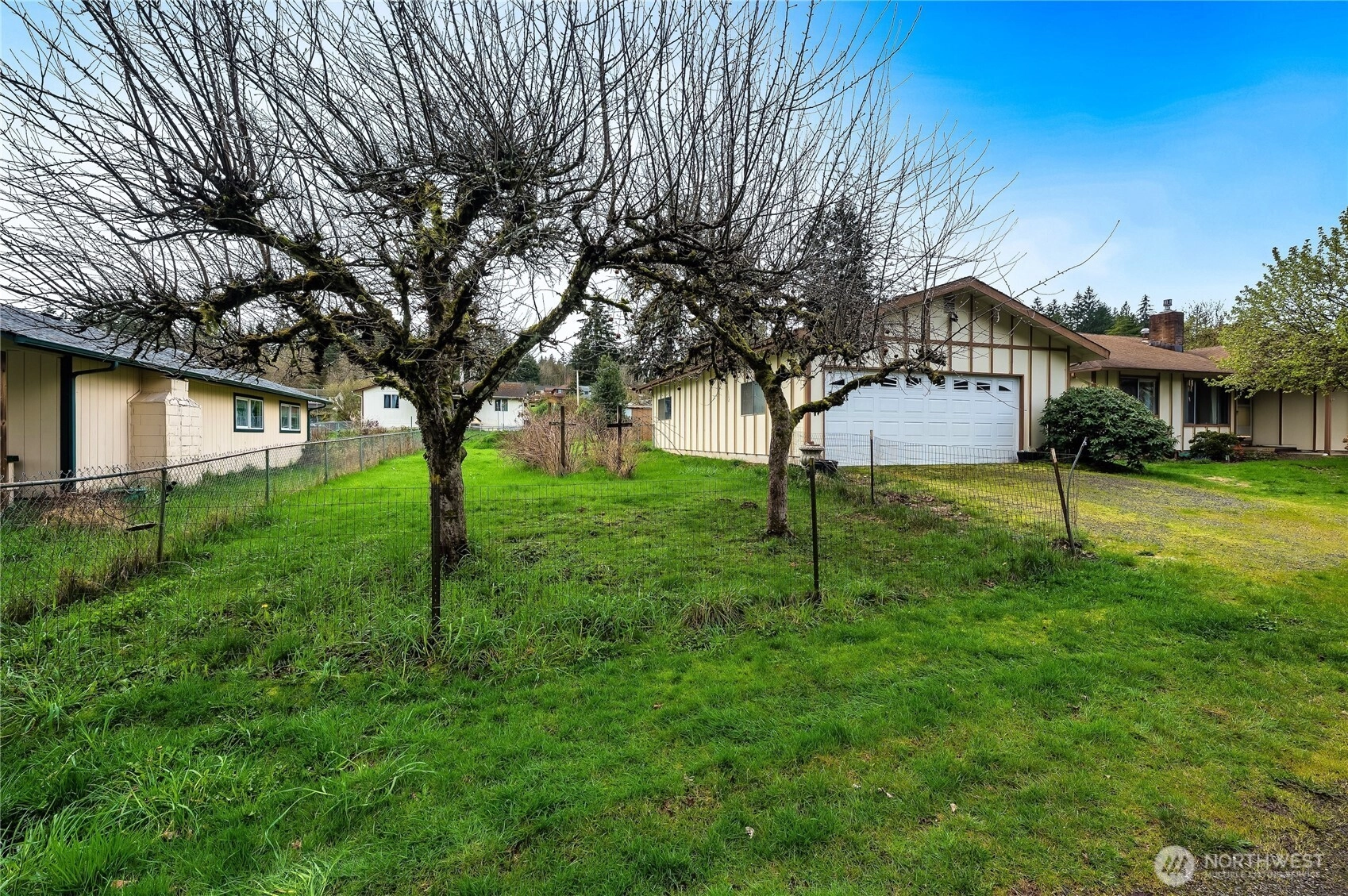 Get away from the hustle to this charming 3 bed 1.75 bath Rambler on a huge fenced lot! Updated! – Fresh interior paint - Laminate floors throughout - Spacious living room w/ cozy gas fireplace. Bonus room, perfect for family room, home office, utility space, or even a possible 4th bedroom! - Outside – the huge covered patio creates the ideal space for relaxing, entertaining, or outdoor dining. Detached 960sqft garage gives you lots of options; park 3-4 cars, be creative in the large workshop or Hey, w/ a 3/4 bath already there, convert a portion into an ADU, guest suite, home office, AirBnB, rental income or even an art/music studio - Garden space w/ fruit trees, blueberries and blackberries is ready for your magic to happen!