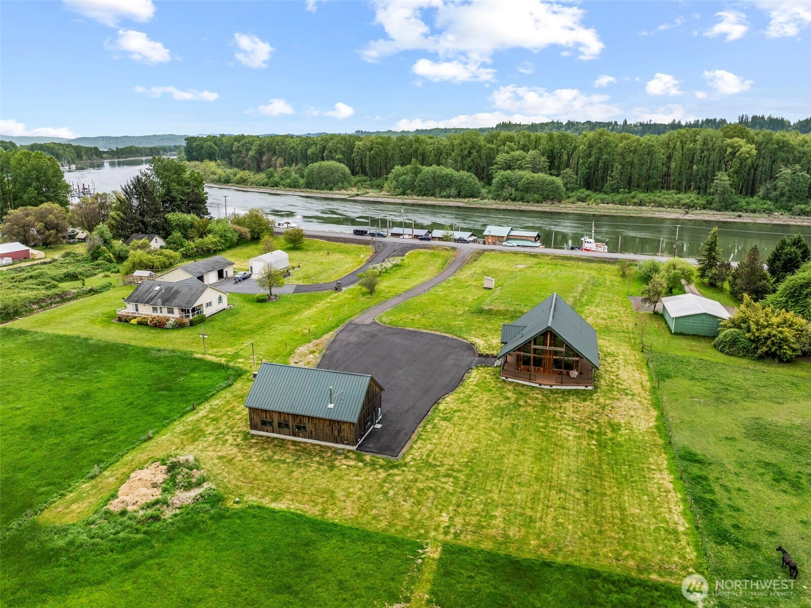 MAJOR PRICE SHIFT in the Grove! You'll find level, lush lawn, pristine pastures, your own crop circle plus this custom-built timber-framed home w/log siding, soaring ceilings, beautiful vistas all around, 48x30 shop, commercial septic system, near public boat launch & park, private yacht club & marina, not far to services & I-5 freeway/SR 432 access. Public water serves this gorgeous 3 BR, 2 bath home w/office boasting open concept kitchen & amazing great room, pellet stove, wood trim, Emerson windows & sliders, custom built 9' entry doors, expansive covered deck, massive ensuite w/private balcony. Opportunity is now to schedule a tour of this 2,432 square foot home & shop w/spacious paved parking, driveway & approach - Willow Grove awaits!