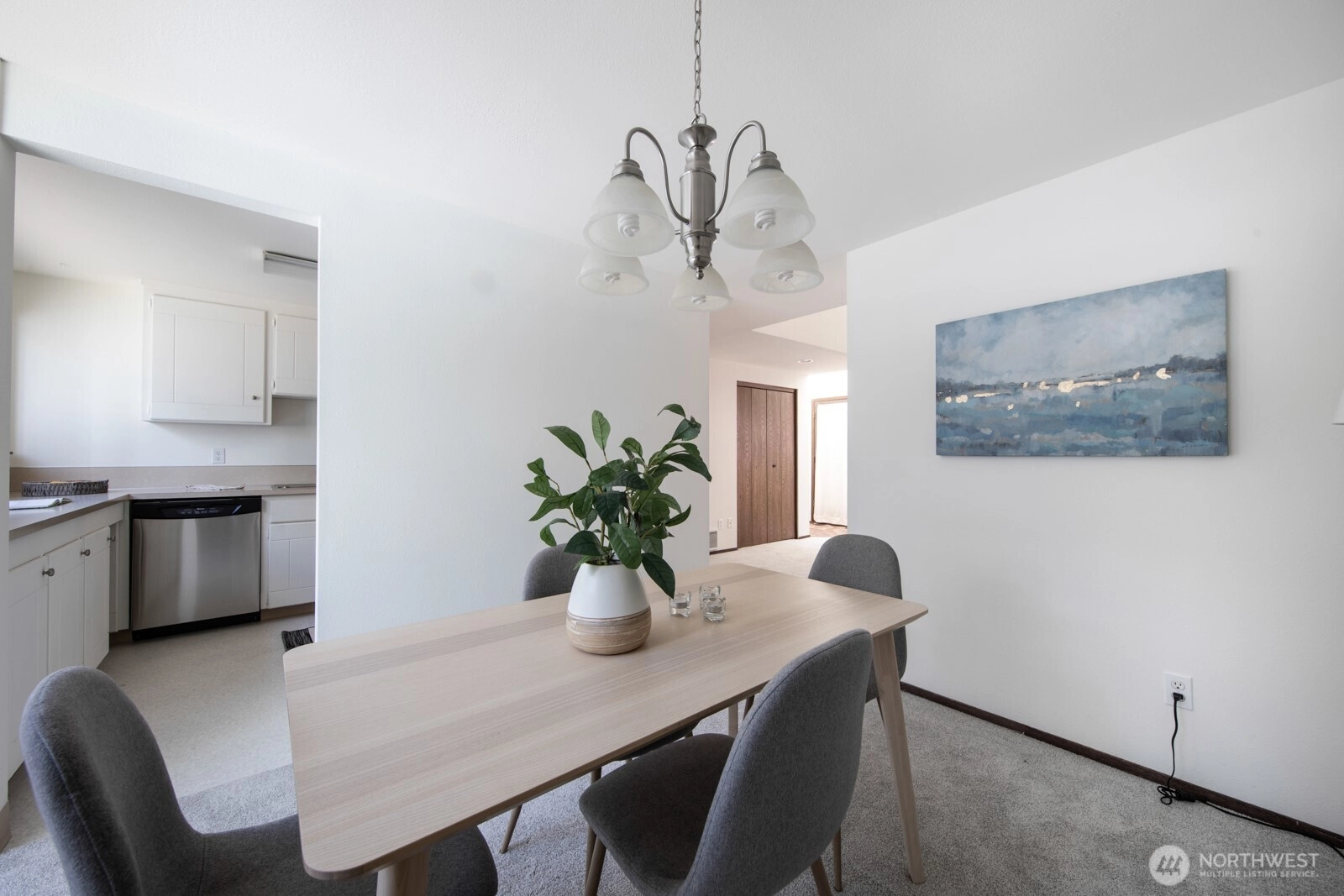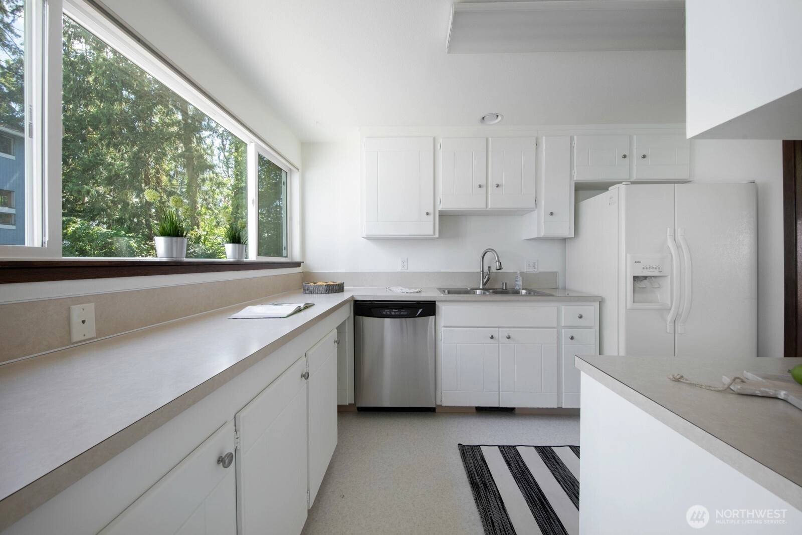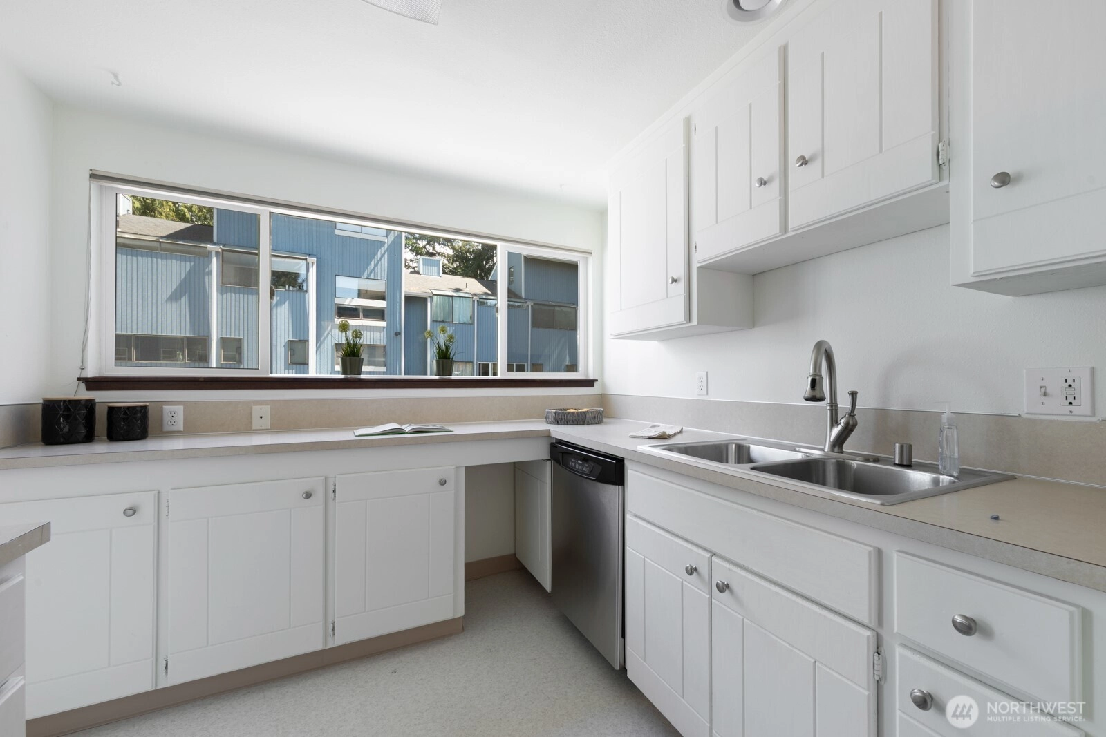 This cheerful, single-level condo offers plenty of natural light throughout. Recently updated with fresh paint and new flooring, it's move-in ready and waiting for you. Enjoy the wood-burning fireplace in the comfortable living room and space for hosting in full dining room. A condo with kitchen space to actually cook! Large primary bedroom provides a peaceful retreat, in unit W/D. You'll appreciate having your own private, oversized two-car garage with extra storage space, EV possible! Just minutes from downtown Edmonds' shopping, restaurants, ferry, trains, trails and beaches. With easy access to I-5, 99 and good local schools nearby this well-positioned condo offers convenience and comfort in a great location. Welcome home!