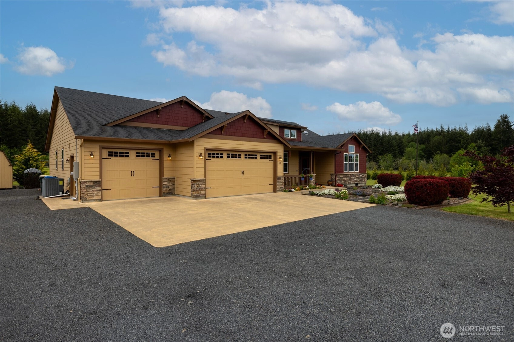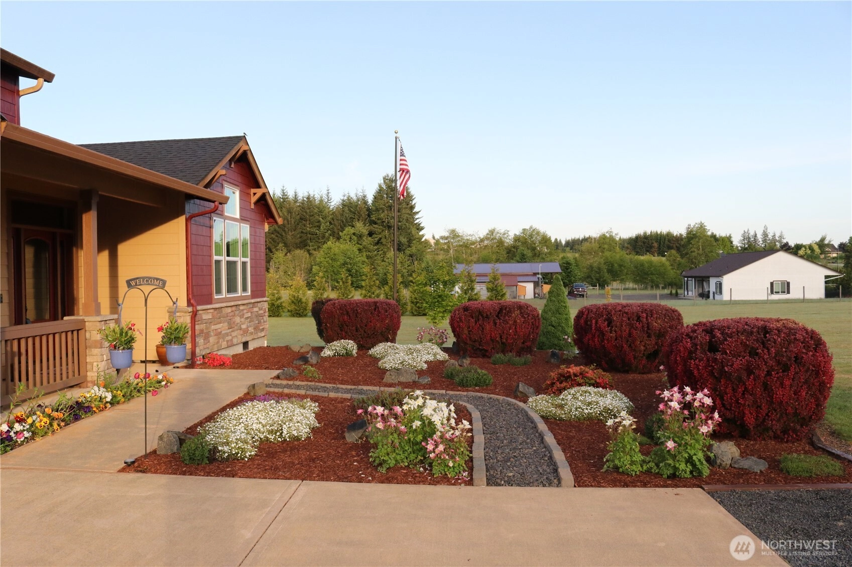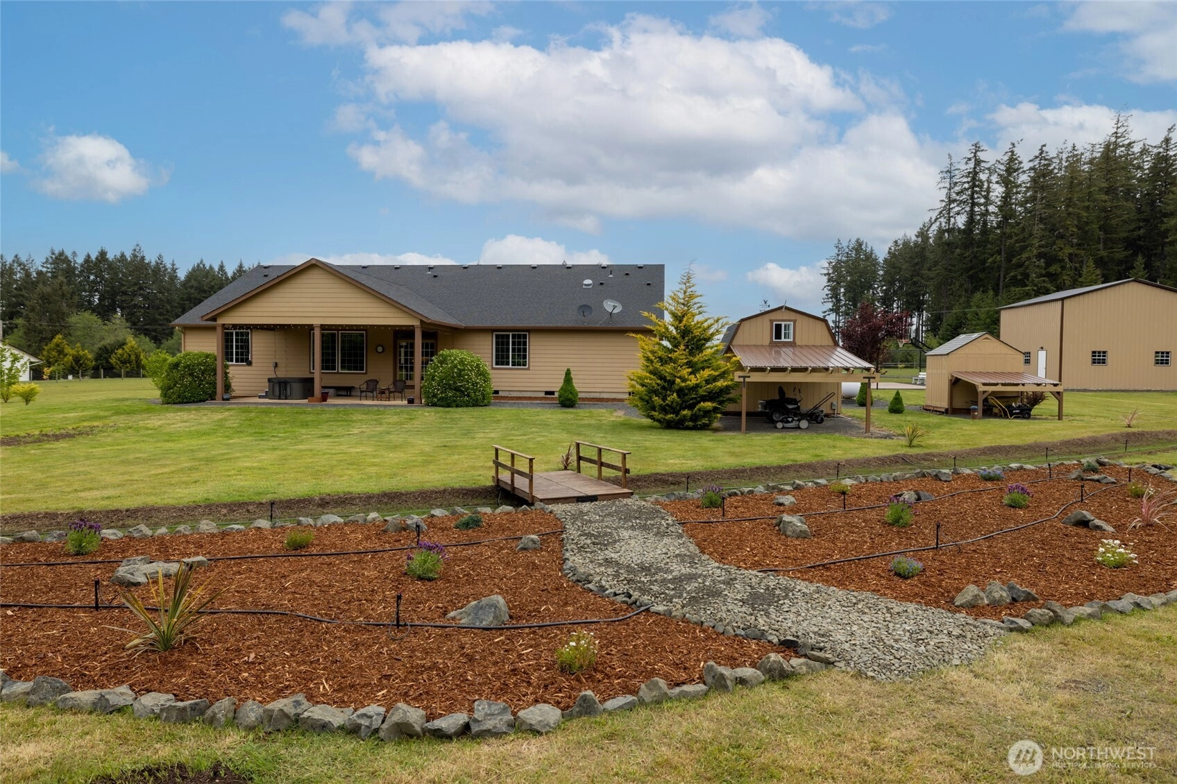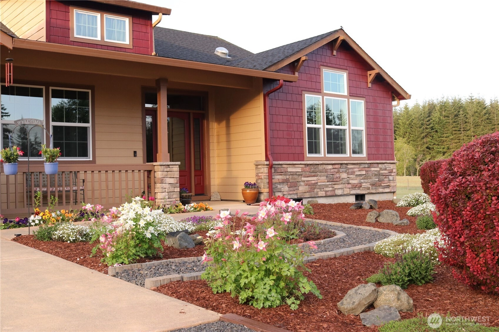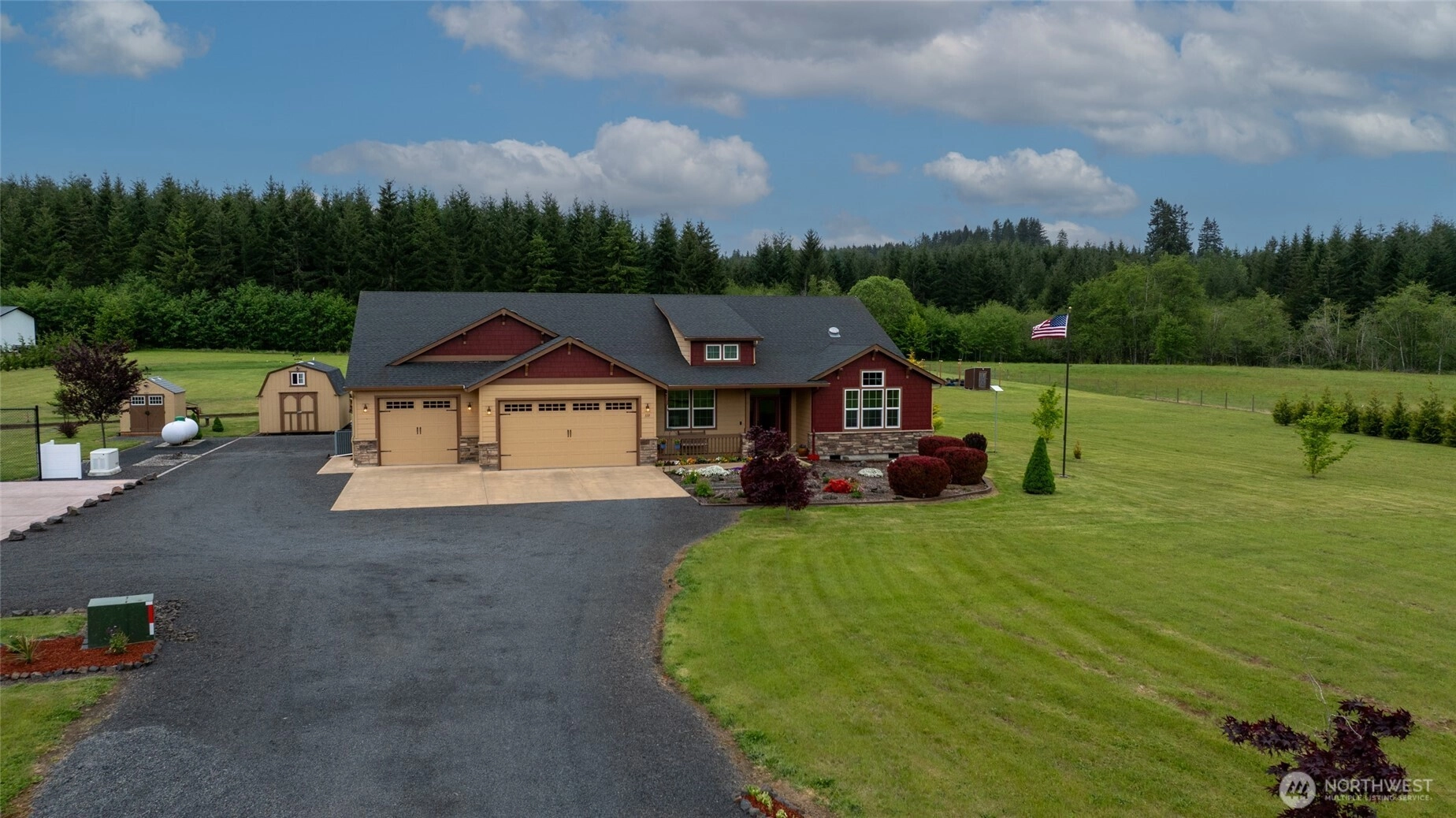 Stunning Adna area home sits on 5 manicured acres! This grand custom kitchen is going to please any chef in the house, with custom cabinets w/soft close drawers, enormous island, an abundance of counter space & storage. All this opening up to a large living room & dining room area w/an easy flow out to the covered porch area. Home has 3 bedrooms an office, built in bookshelves, large walk in pantry, vaulted ceilings & commercial grade laminate flooring. The primary has a custom shower, walk in closet & a make-up sitting area. The exterior is just as grand w/a shop, outbuildings, heat pump, garden area & a basketball court. A ground mounted 10,220w solar panel array. 22Kw standby generator and so much more.
