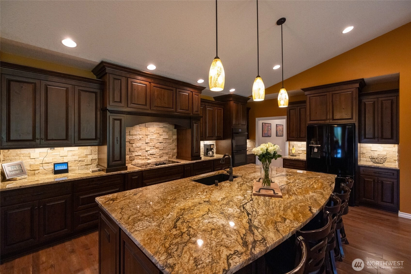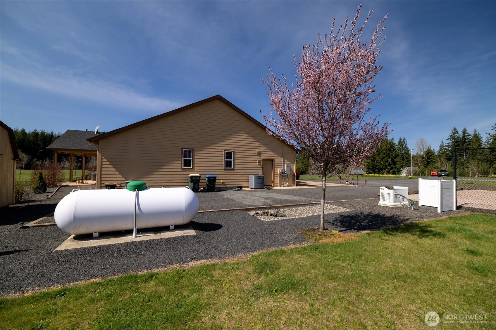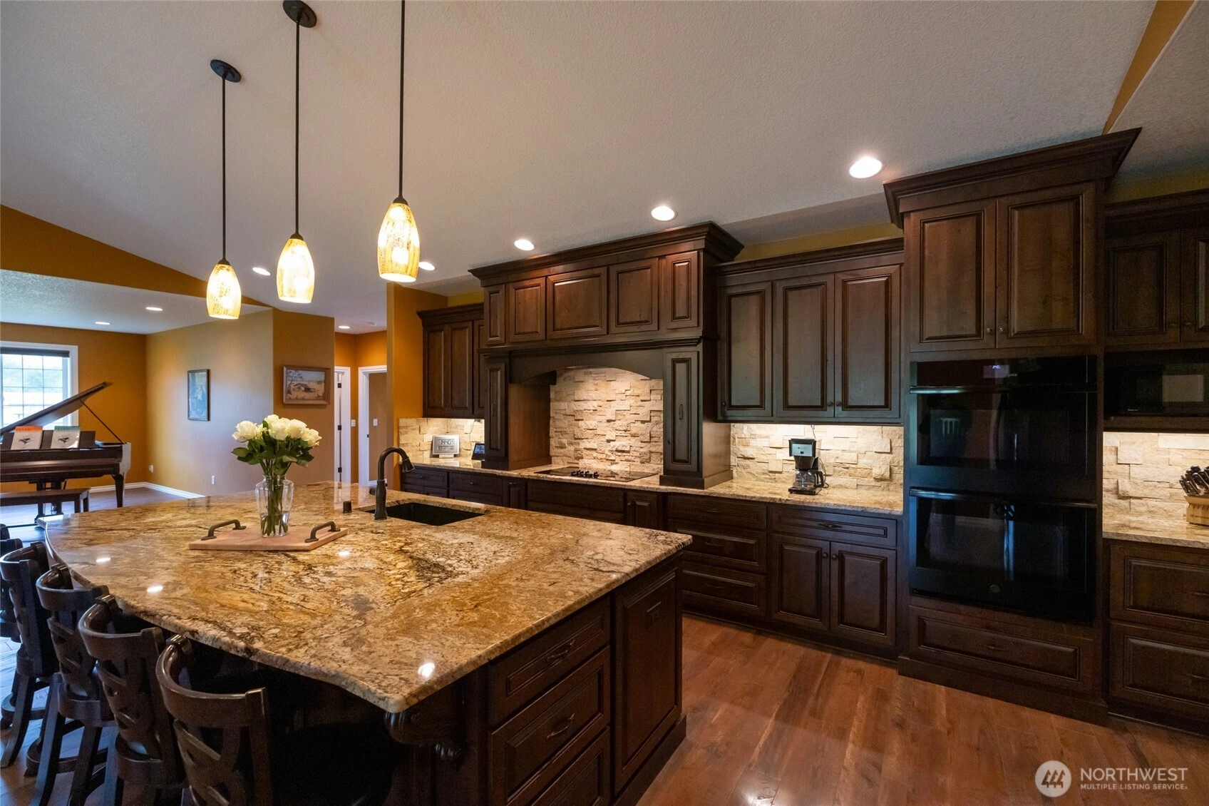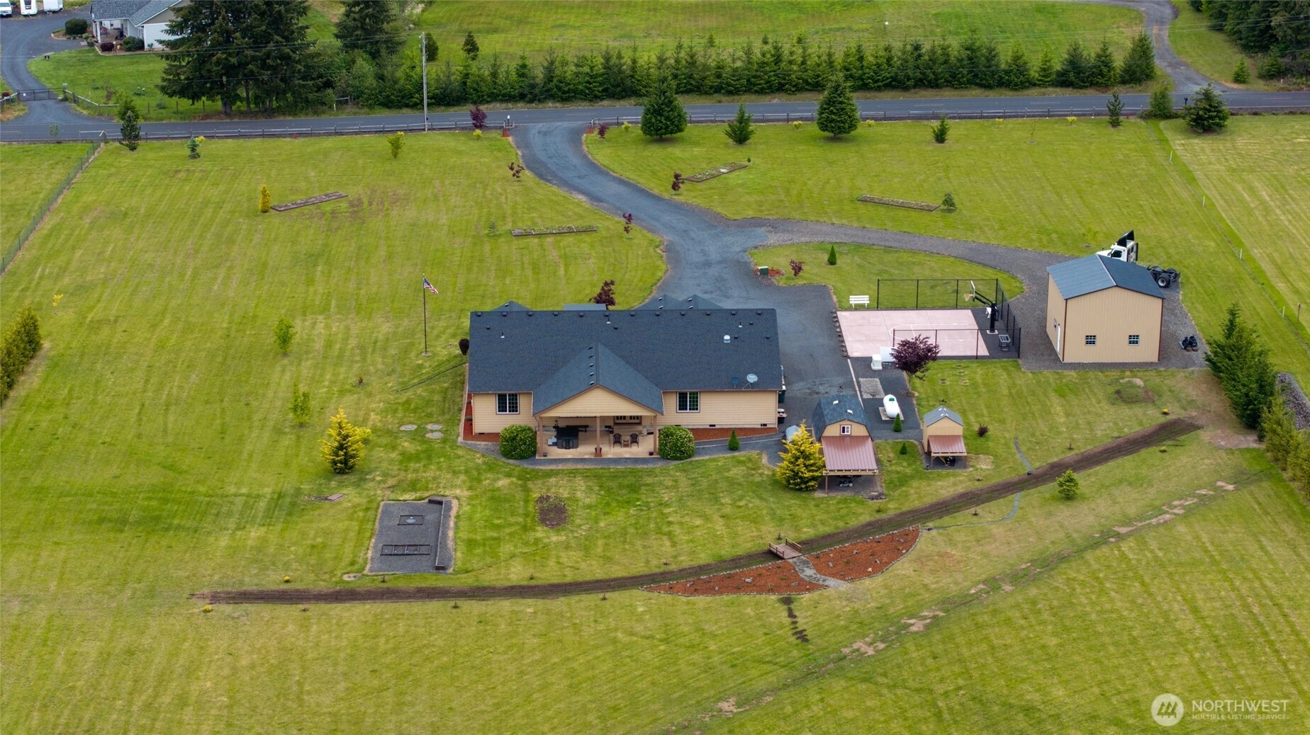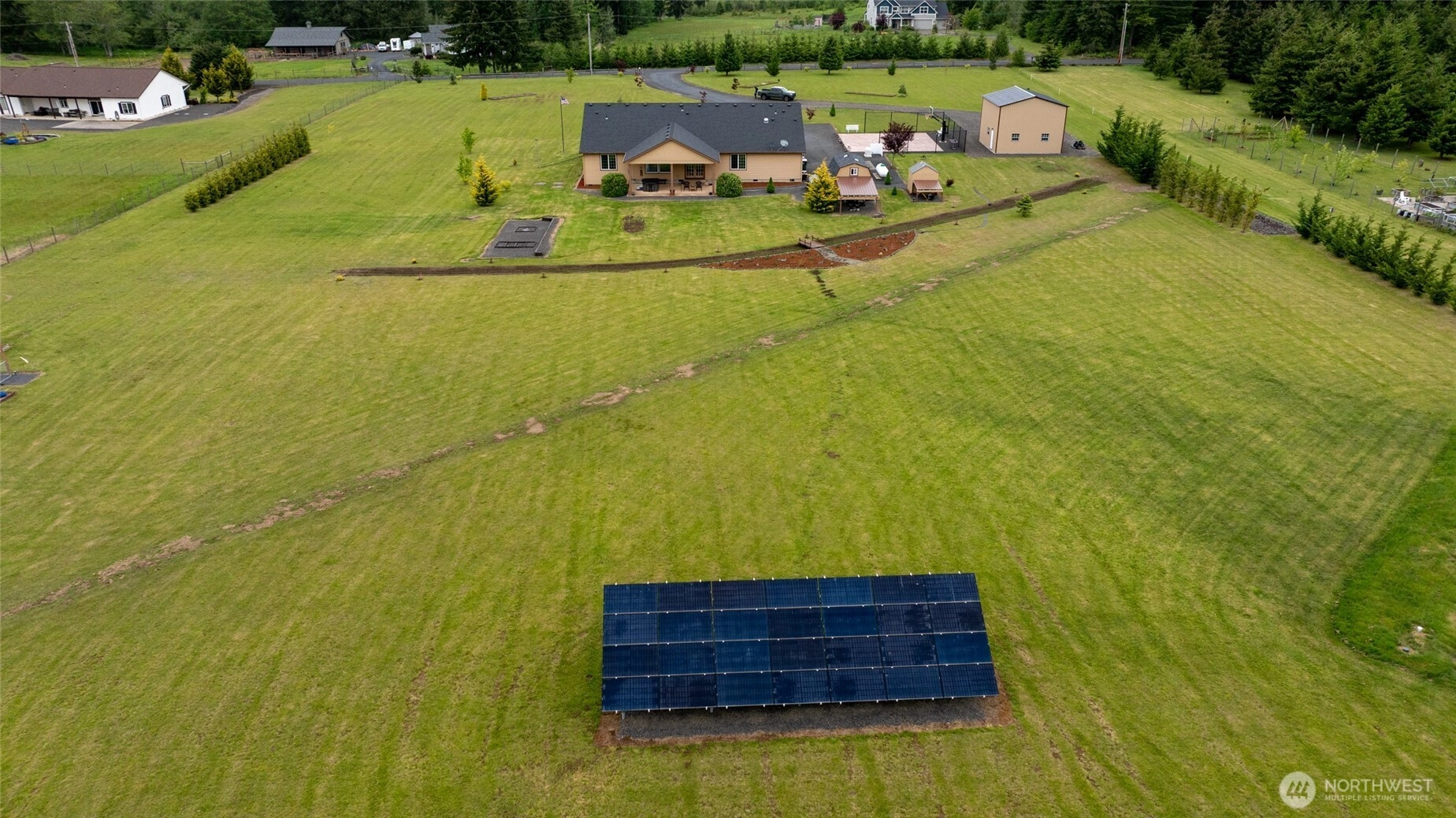Stunning Adna area home sits on 5 manicured acres! This grand custom kitchen is going to please any chef in the house, with custom cabinets w/soft close drawers, enormous island, an abundance of counter space & storage. All this opening up to a large living room & dining room area w/an easy flow out to the covered porch area. Home has 3 bedrooms an office, built in bookshelves, large walk in pantry, vaulted ceilings & commercial grade laminate flooring. The primary has a custom shower, walk in closet & a make-up sitting area. The exterior is just as grand w/a shop, outbuildings, heat pump, garden area & a basketball court. A ground mounted 10,220w solar panel array. 22Kw standby generator and so much more.