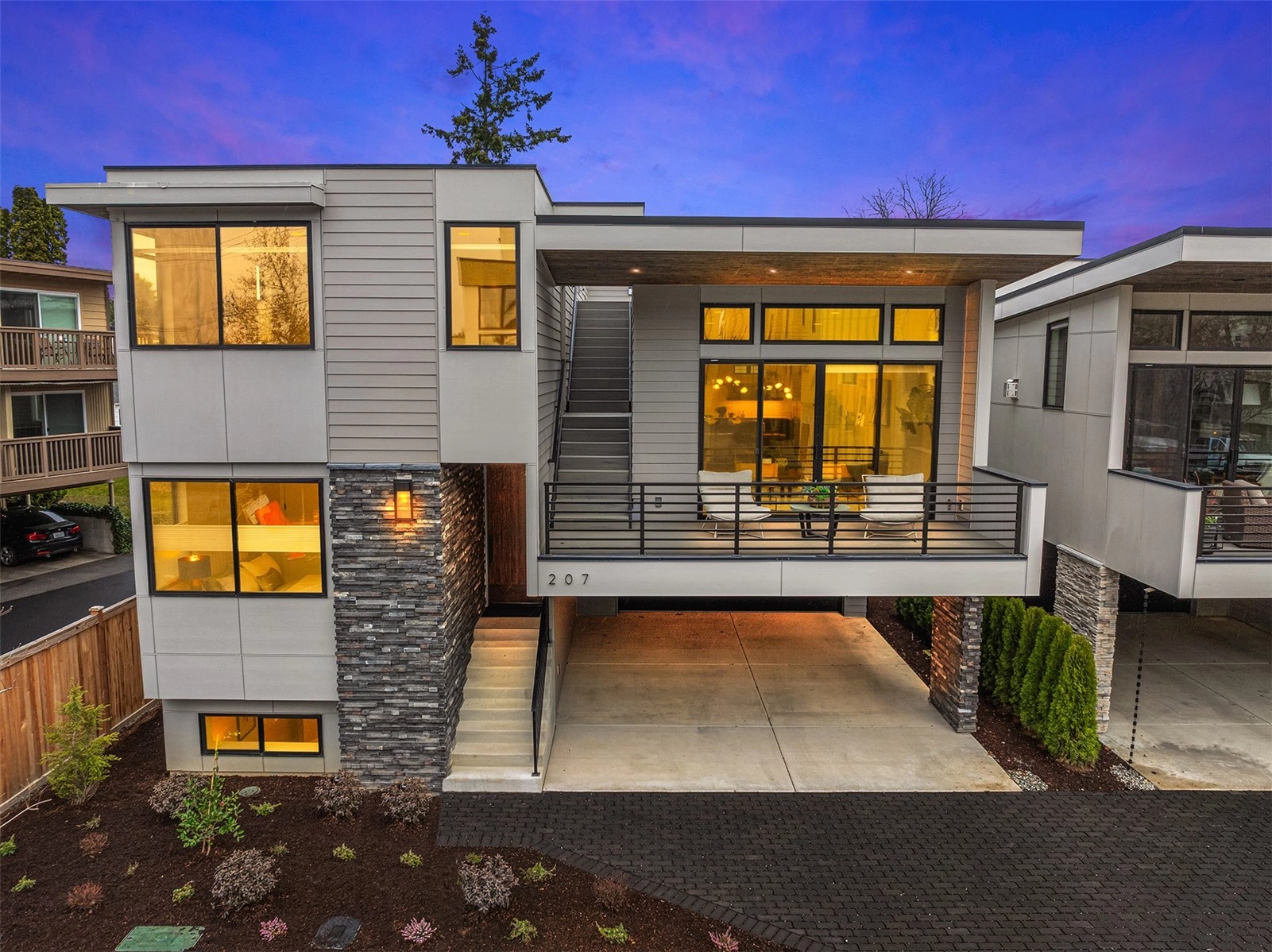 Stunning New Contemporary Home by ESP Custom Homes in coveted Moss Bay community & Lake Washington SD just 1 block from Kirkland's waterfront, marina or downtown cultural amenities. 3 Bedrooms boast their own unique charm, ample natural light, and private bathrooms w designer fixtures. Gorgeous finish quality features a modern take on the mid-century modern aesthetic. Whether you are gathering in the main floor great room & chef's kitchen, enjoying breathtaking sunset, lake, mountain & territorial views from the massive rooftop deck, or heading out on the town or lake, this home is the entertainer's dream. 4 covered parking spots with 2 car garage & EV charging for ample parking & storage. Convenient fully fenced synthetic turf dog run.