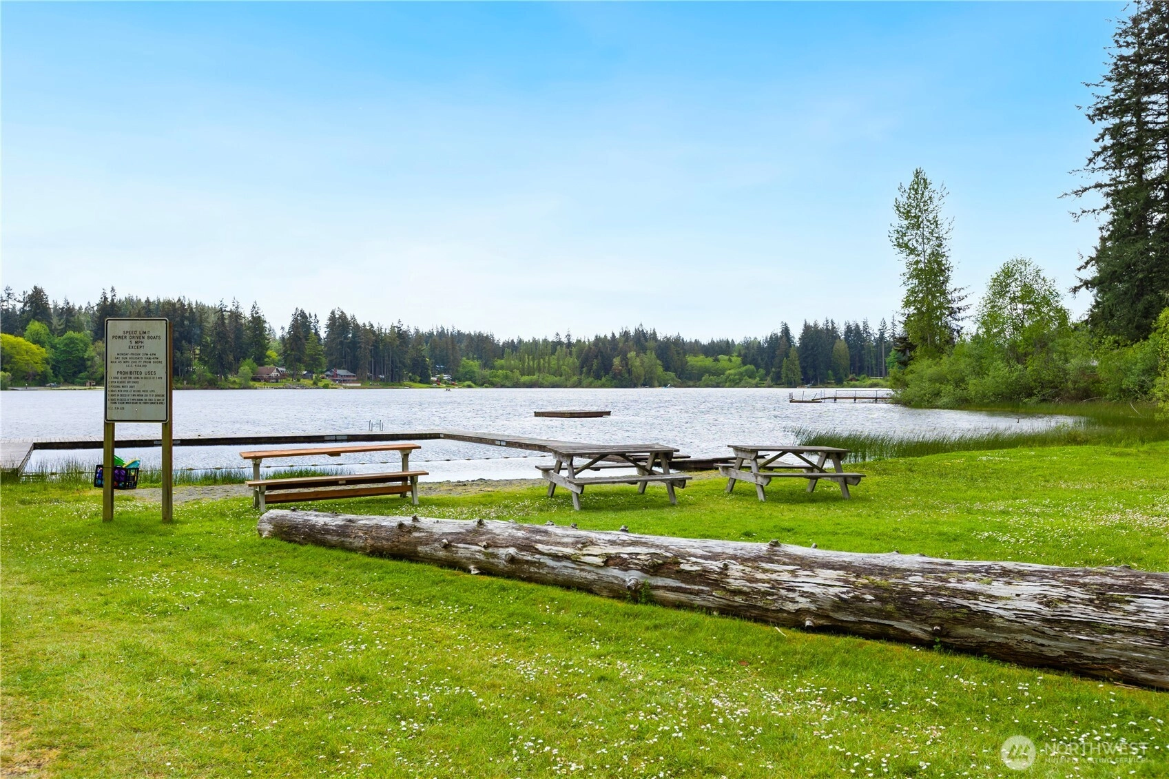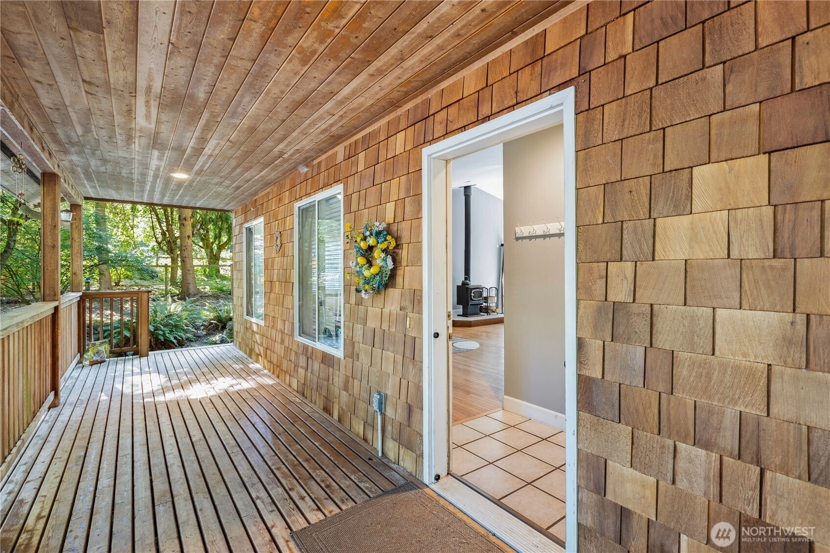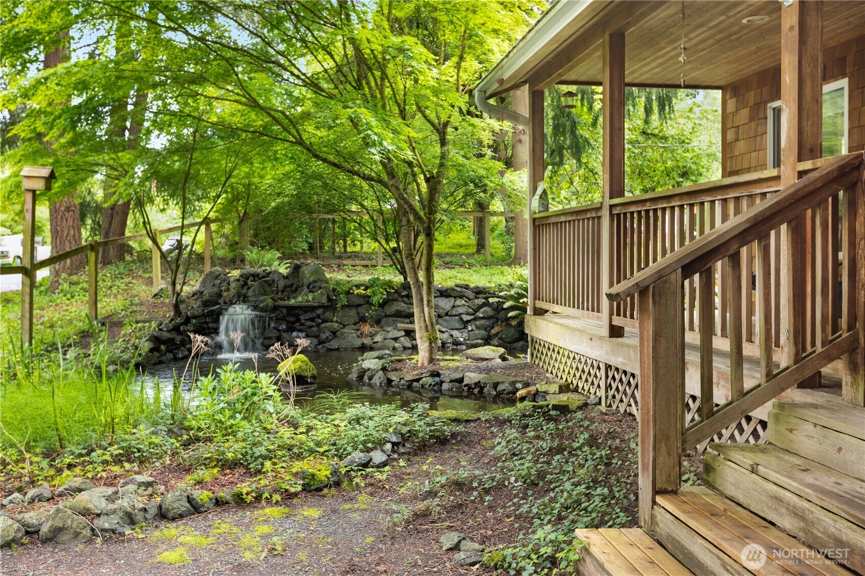 Tucked into a peaceful, wooded setting, this Clinton home offers the perfect blend of comfort and nature. A classic cabin-style front porch welcomes you in, leading to vaulted ceilings, hardwood and tile floors, and a cozy wood stove for chilly evenings. The open kitchen is ideal for everyday living or weekend entertaining. Step outside to your own private oasis with a koi pond and waterfall. The primary suite includes an attached bath. Ample storage throughout. Private access to Deer Lake adds year-round recreation to this serene Whidbey Island getaway.