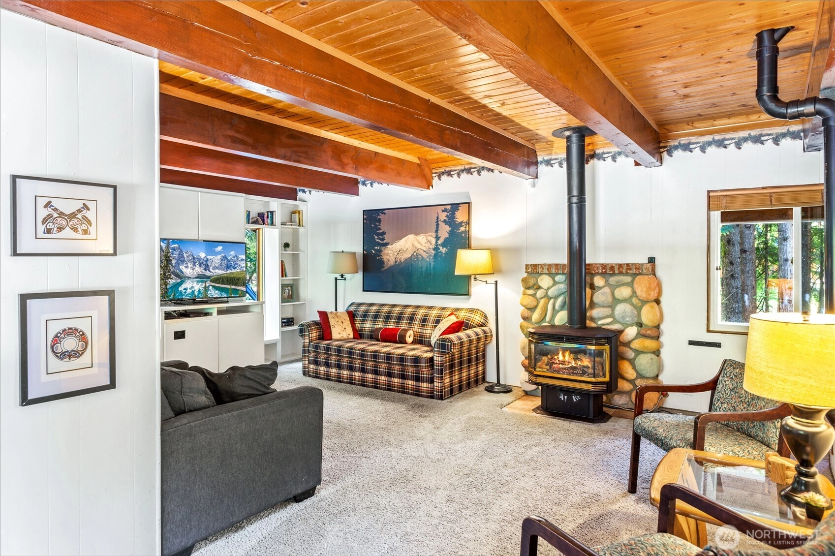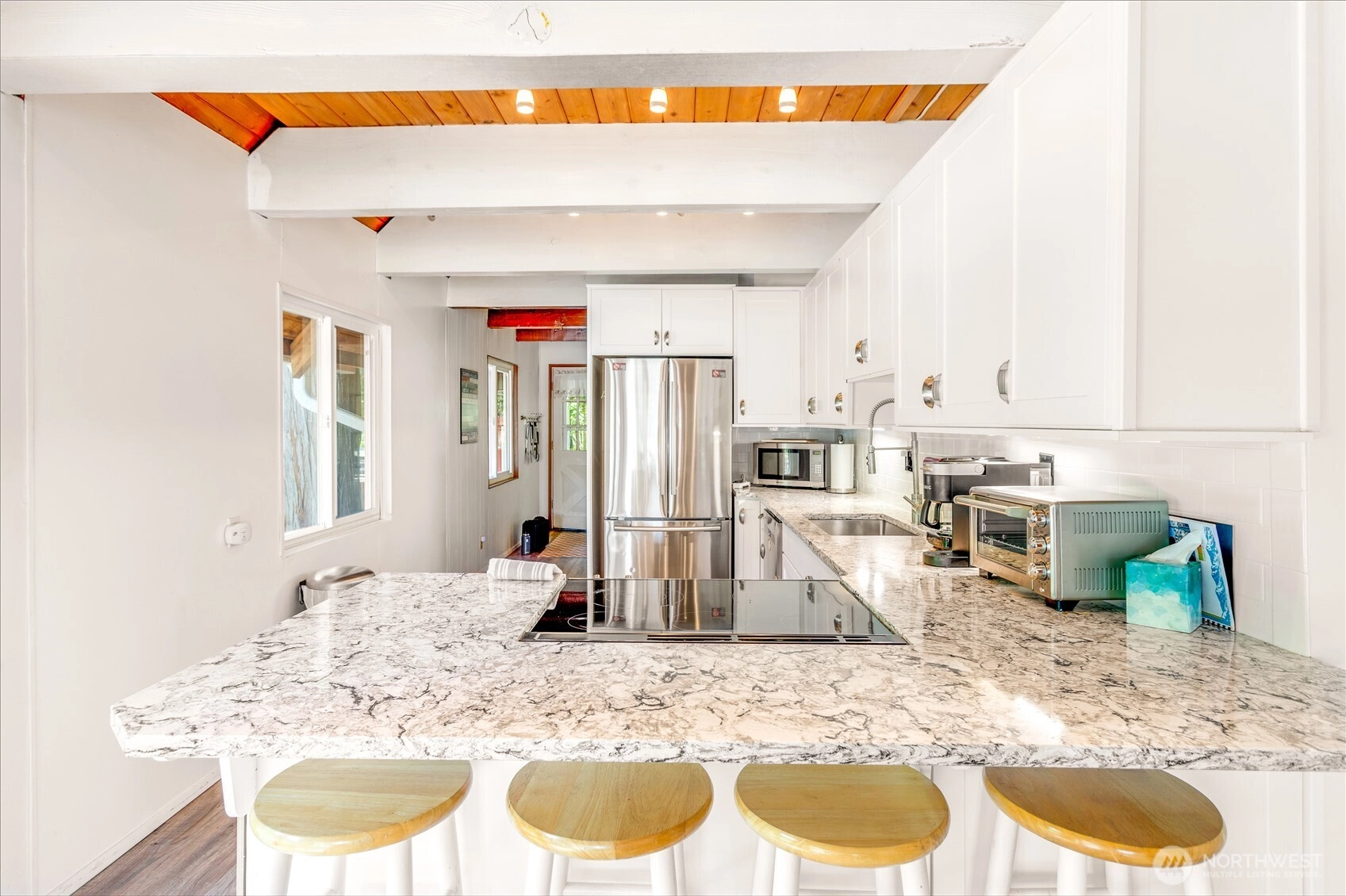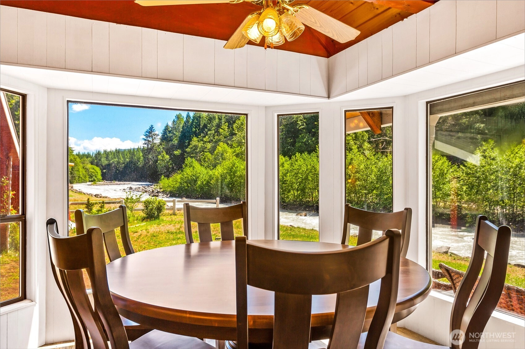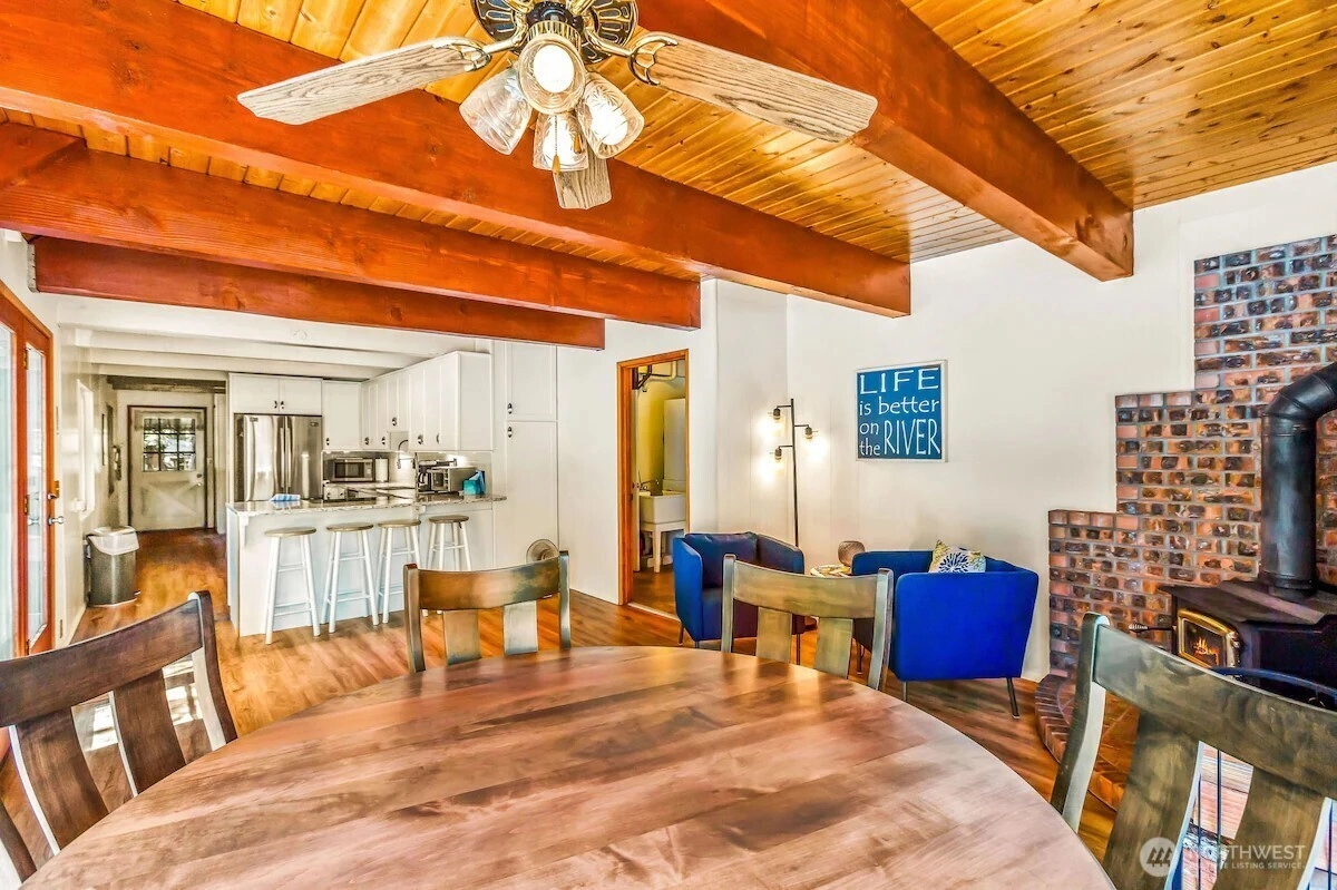 Escape to River Bank Cabin—your all-season retreat on the White River! Wake to the river’s calm, then unwind in the hot tub or by the fire pit. This charming cabin blends rustic warmth—exposed beams, gas & wood stoves—w/ modern updates like quartz counters, laminate flooring, new cabinetry, & large windows. Enjoy a well-equipped kitchen, cozy dining nook w/ river views, & comfortable sleeping for up to 6 guests, including a king-sized master suite w/ breathtaking views. 2 bathrooms, a powder room, plush linens, & a backup generator. In winter, hit the nearby slopes or enjoy the snowy scenery from the hot tub. In summer, explore hiking trails & discover stunning waterfalls. River Bank Cabin is the perfect escape in every season.