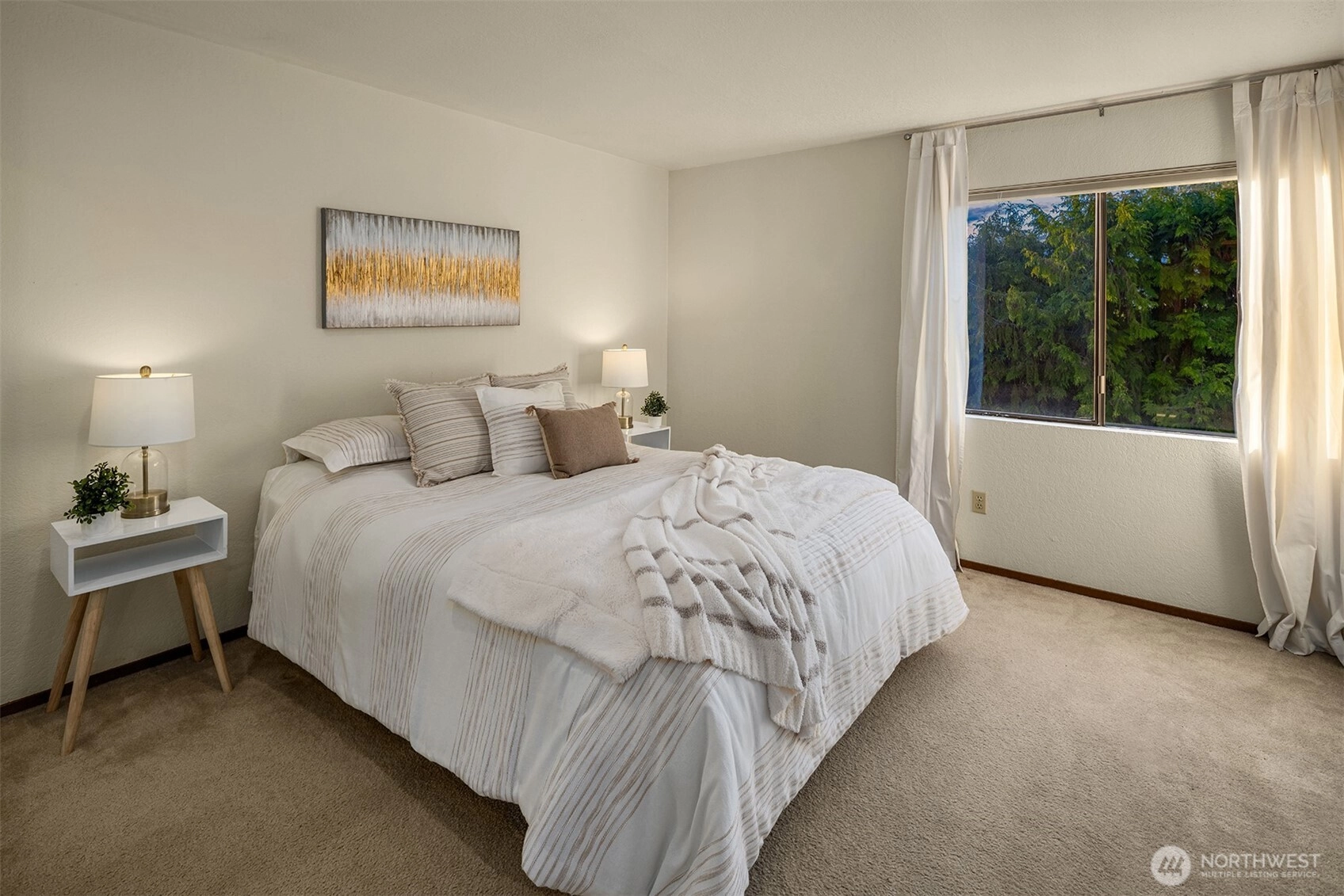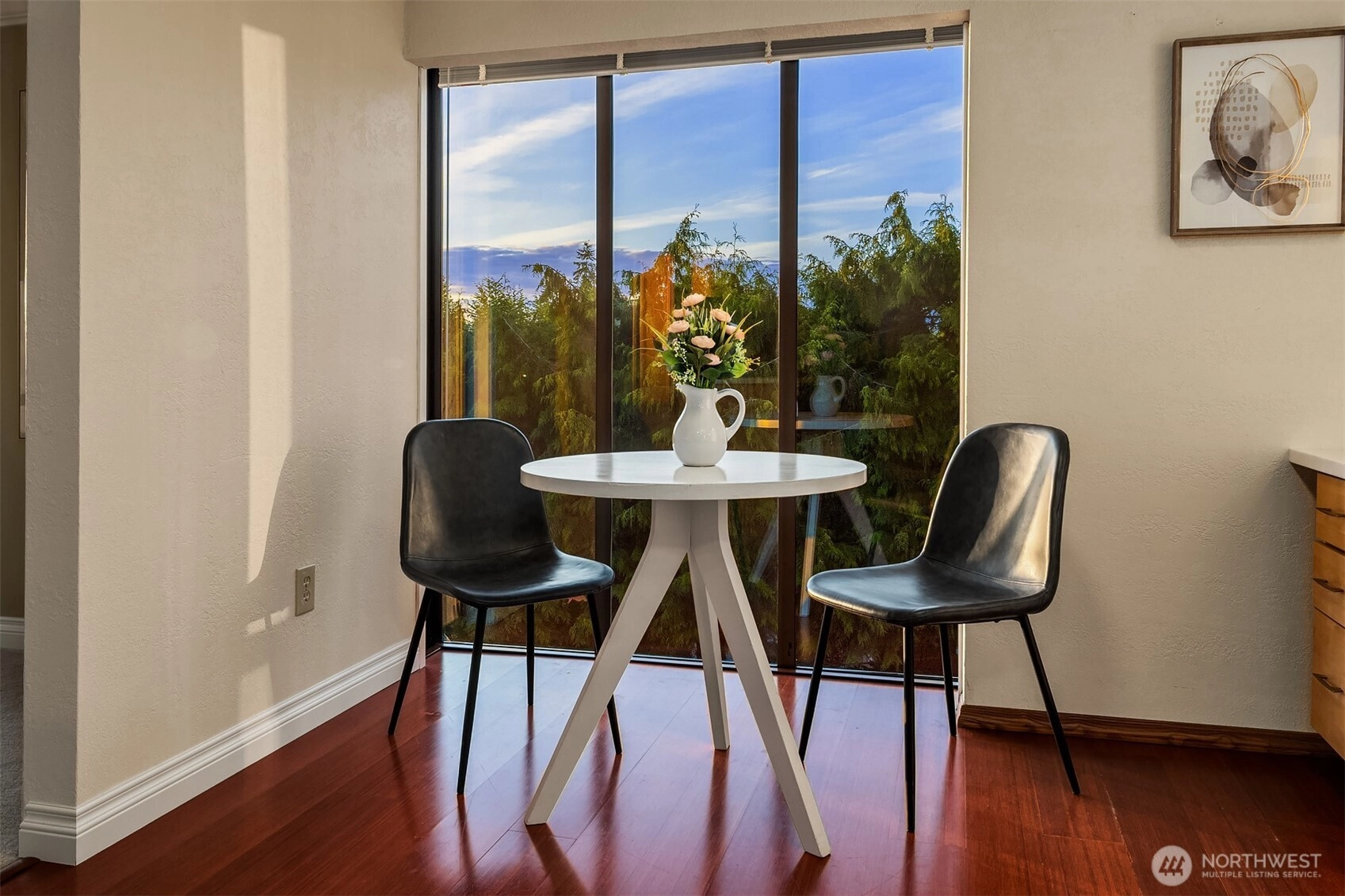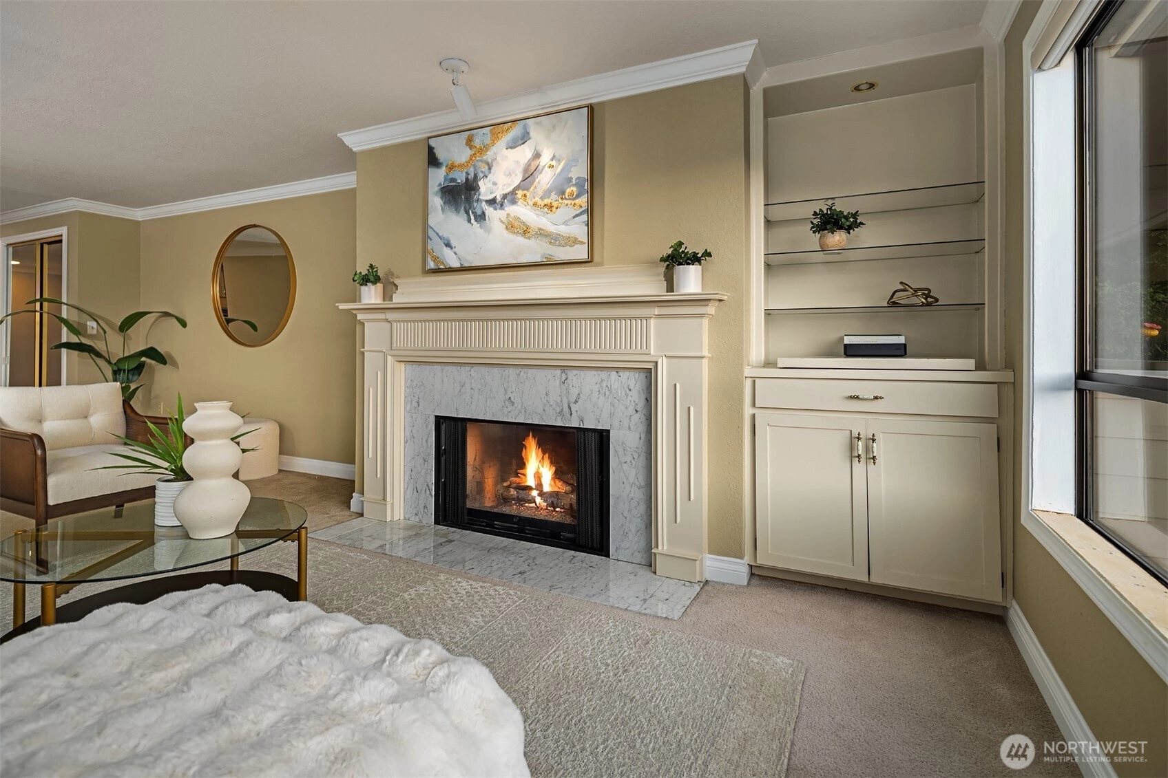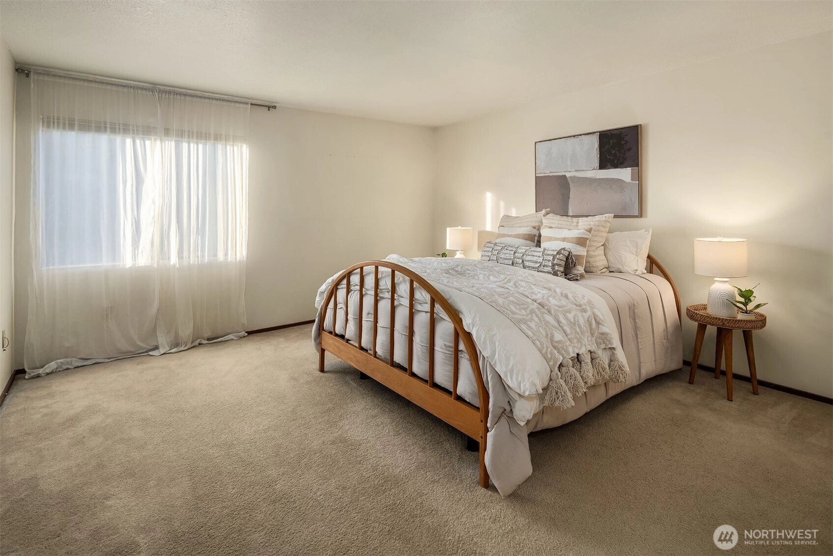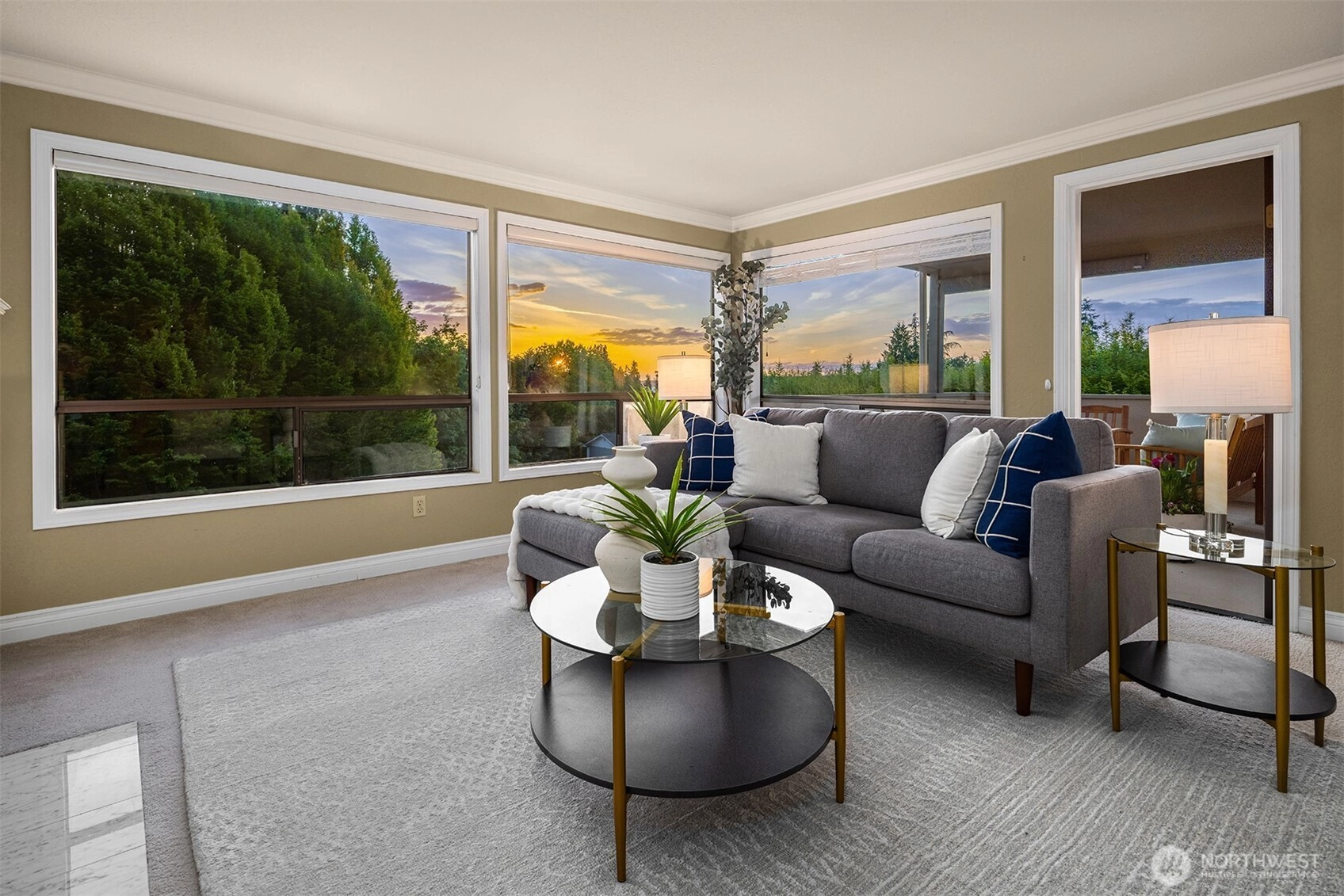 Gorgeous Sunset View Condo in the coveted Edmonds bowl! 2-bed 2-bath corner unit, thoughtfully designed w oversized windows. This light-filled home features a warm & welcoming living room w wood-burning fireplace & an updated kitchen. Perfect for hosting guests or enjoying a quiet evening in. Step outside to your spacious private deck w a peekaboo view of the shimmering Puget Sound & the majestic Olympic Mountains. The primary suite boasts an en-suite ¾ bath, the second bedroom offers flexibility for guests, a home office, or a creative retreat. Addl highlights: Elevator, in-unit laundry, & private garage w opener. Just a 5-minute walk to DT Edmonds w charming shops, local dining & seaside strolls. MUST SEE to Appreciate! Preinspected!