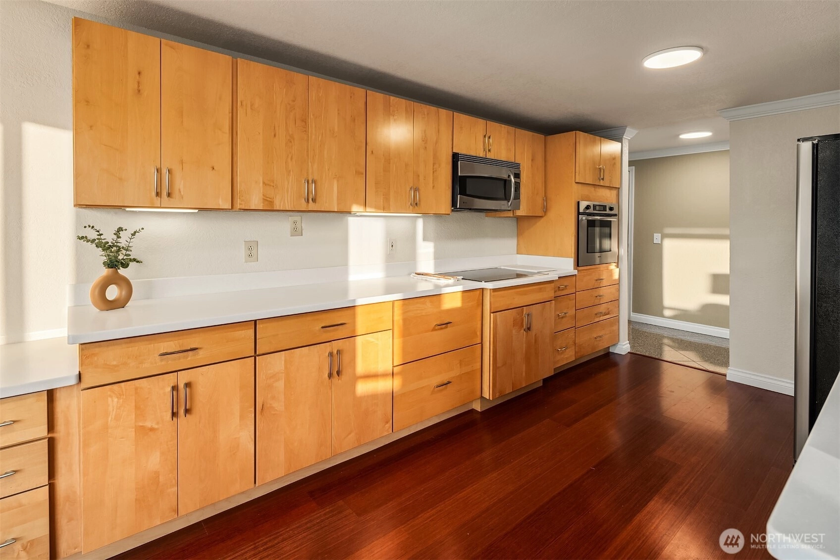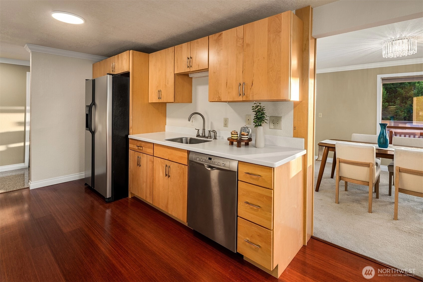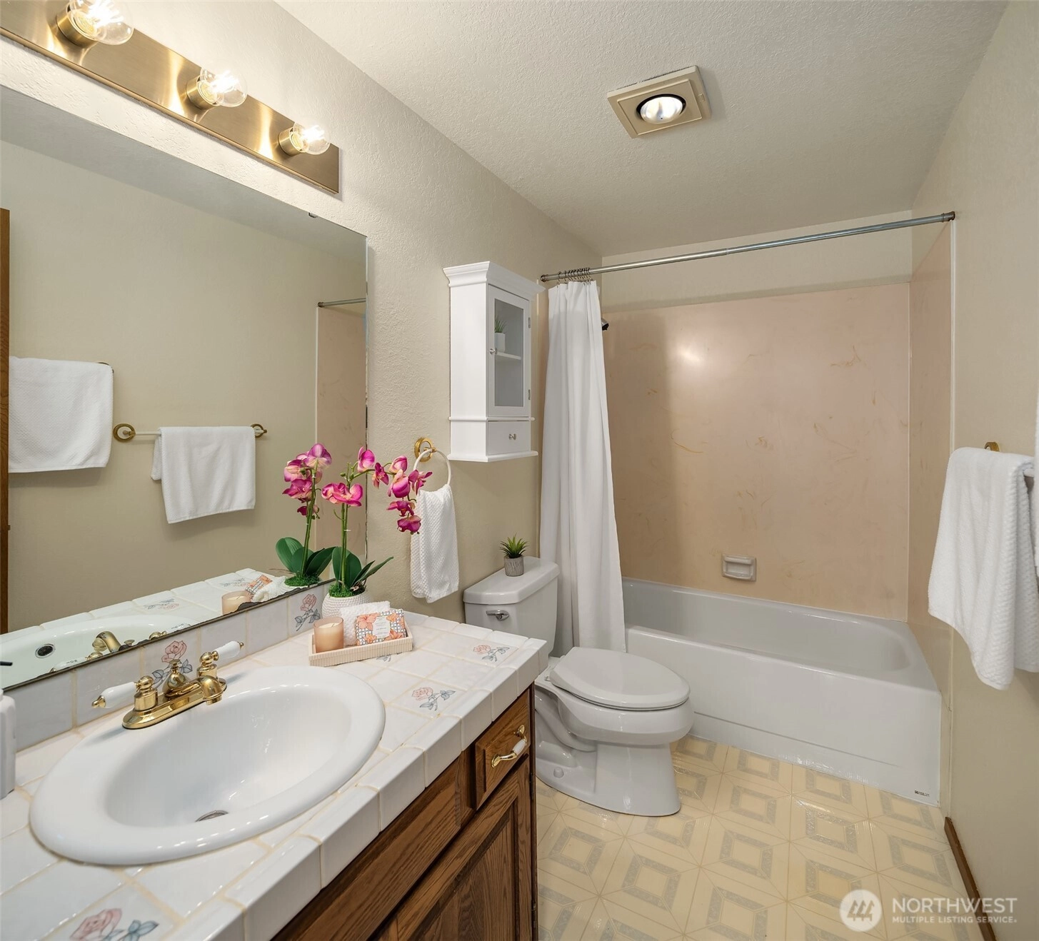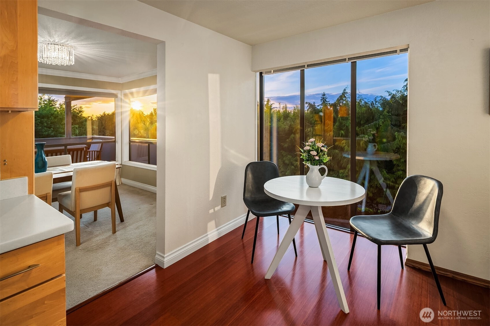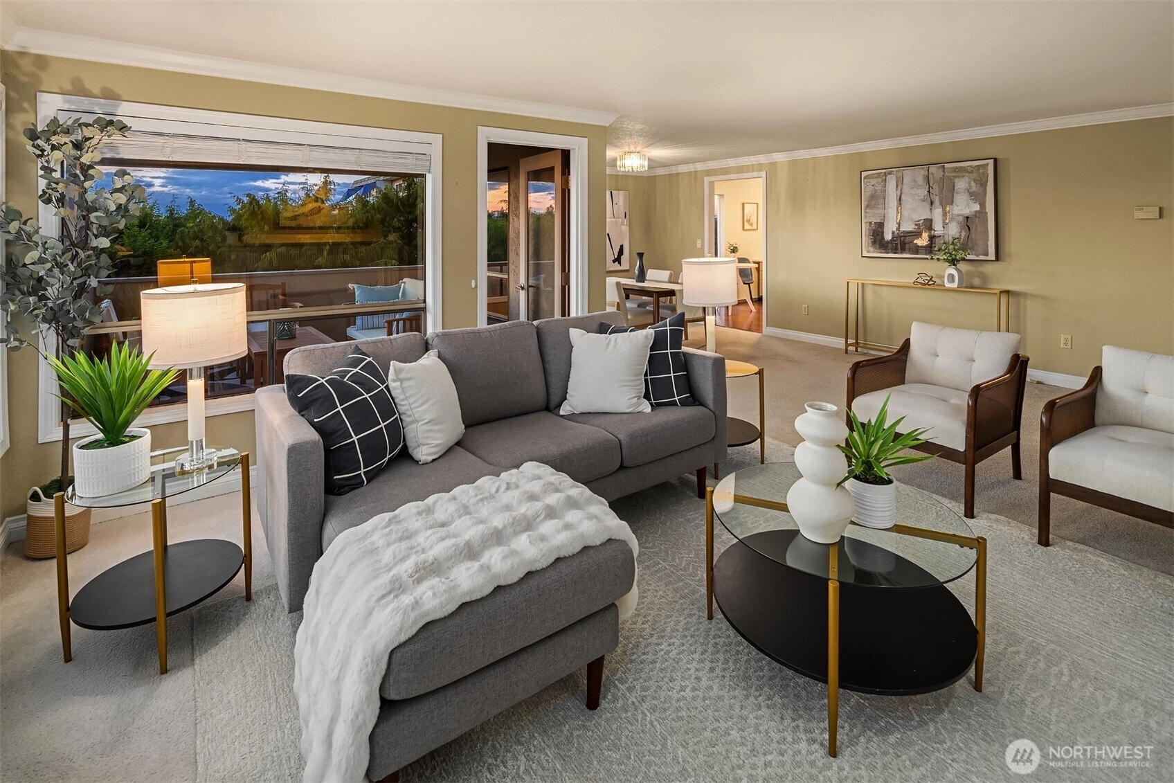 Gorgeous Sunset View Condo in the coveted Edmonds bowl! 2-bed 2-bath corner unit, thoughtfully designed w oversized windows. This light-filled home features a warm & welcoming living room w wood-burning fireplace & an updated kitchen. Perfect for hosting guests or enjoying a quiet evening in. Step outside to your spacious private deck w a peekaboo view of the shimmering Puget Sound & the majestic Olympic Mountains. The primary suite boasts an en-suite ¾ bath, the second bedroom offers flexibility for guests, a home office, or a creative retreat. Addl highlights: Elevator, in-unit laundry, & private garage w opener. Just a 5-minute walk to DT Edmonds w charming shops, local dining & seaside strolls. MUST SEE to Appreciate! Preinspected!