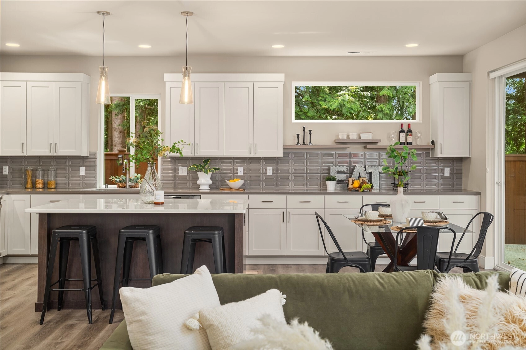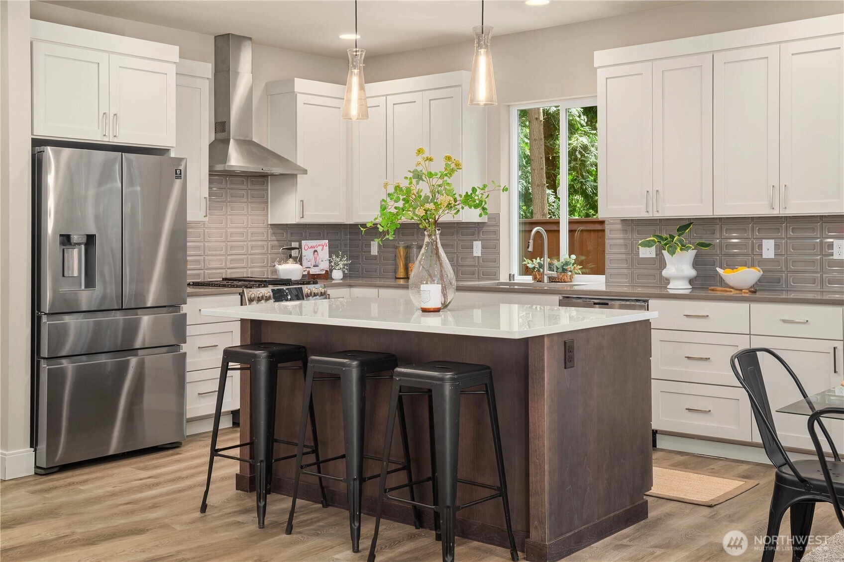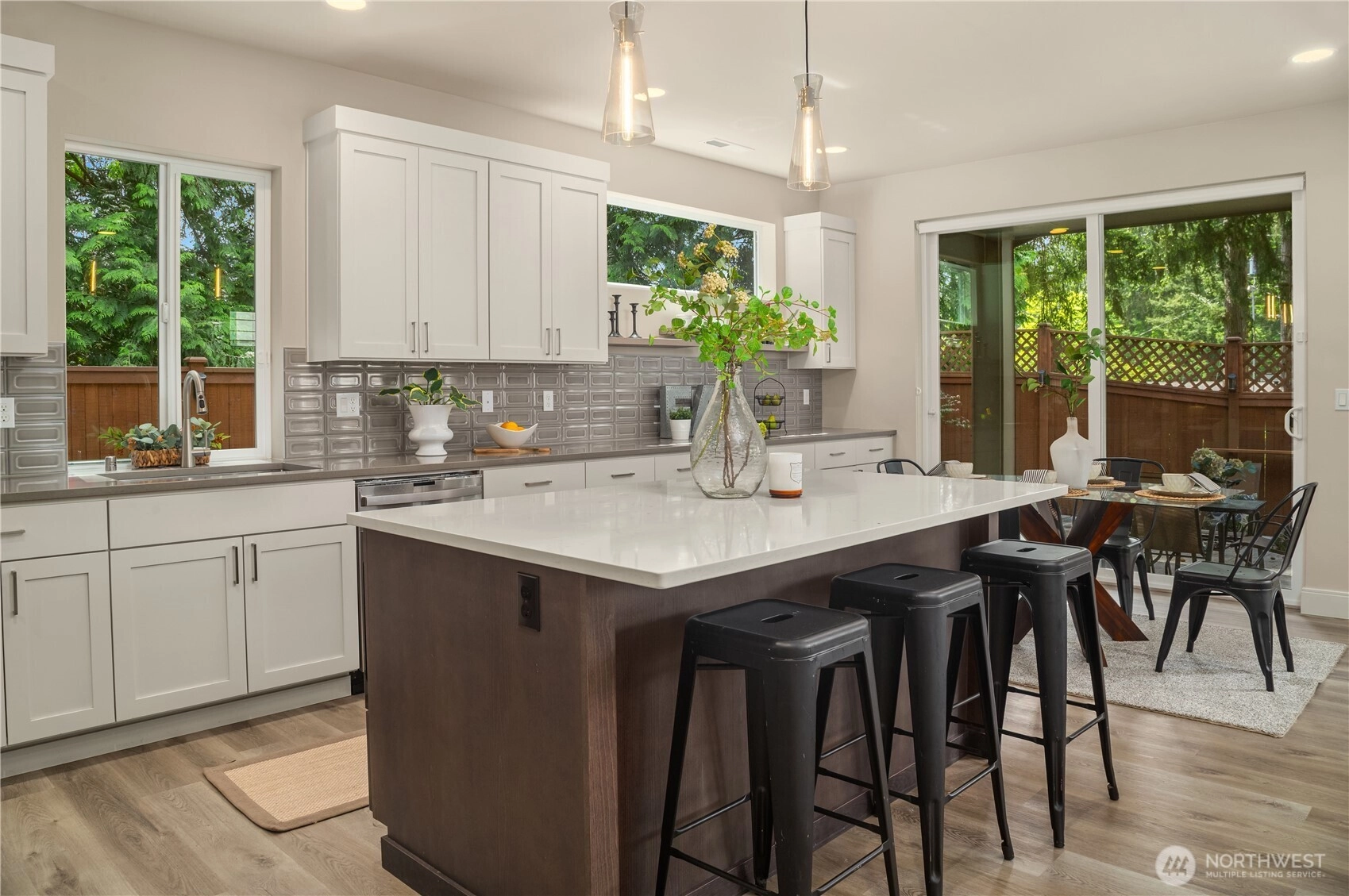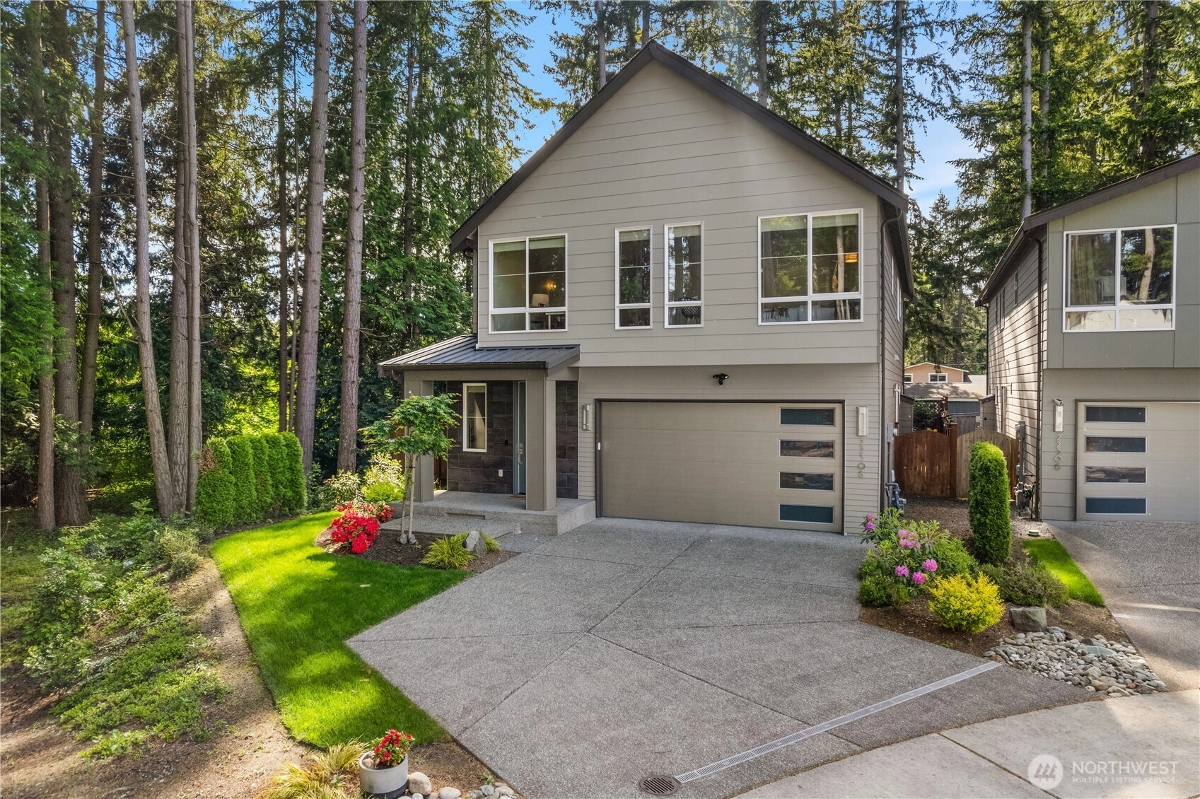 Experience tranquil luxury in this beautifully appointed home, ideally located at the end of a peaceful, friendly cul-de-sac. Thoughtfully designed & impeccably maintained, it seamlessly blends modern elegance with everyday comfort. The open-concept kitchen is a dream for entertainers—featuring slab quartz countertops, ss appliances, & access to a private, covered patio. Upstairs, retreat to a spacious primary suite w spa-like 5-piece bath, alongside a flexible bonus space + two additional bedrooms. A fourth bedroom is conveniently located on the main level, perfect for guests or a dedicated home office. Oversized windows throughout the home frame views of lush greenery & an adjacent greenbelt, showcasing serene PNW beauty. Welcome home!