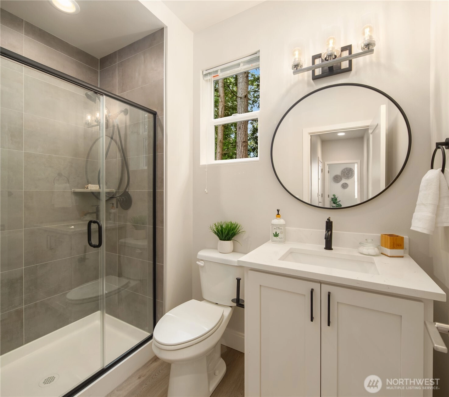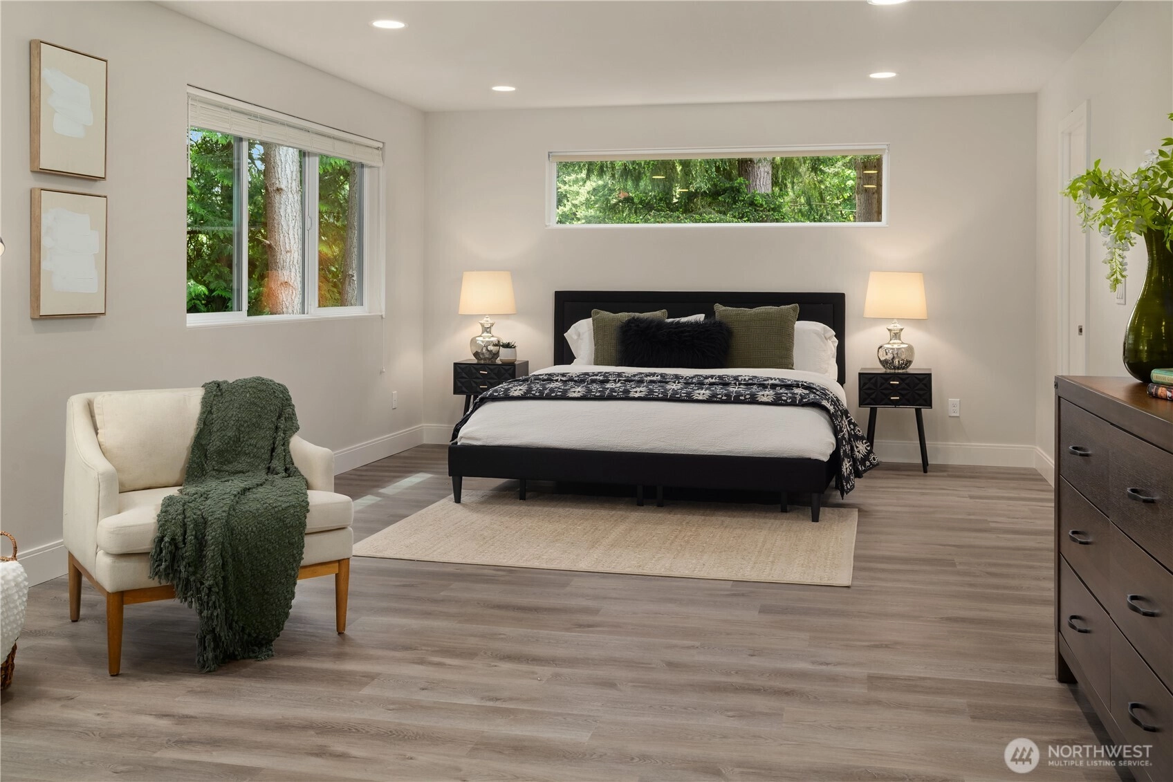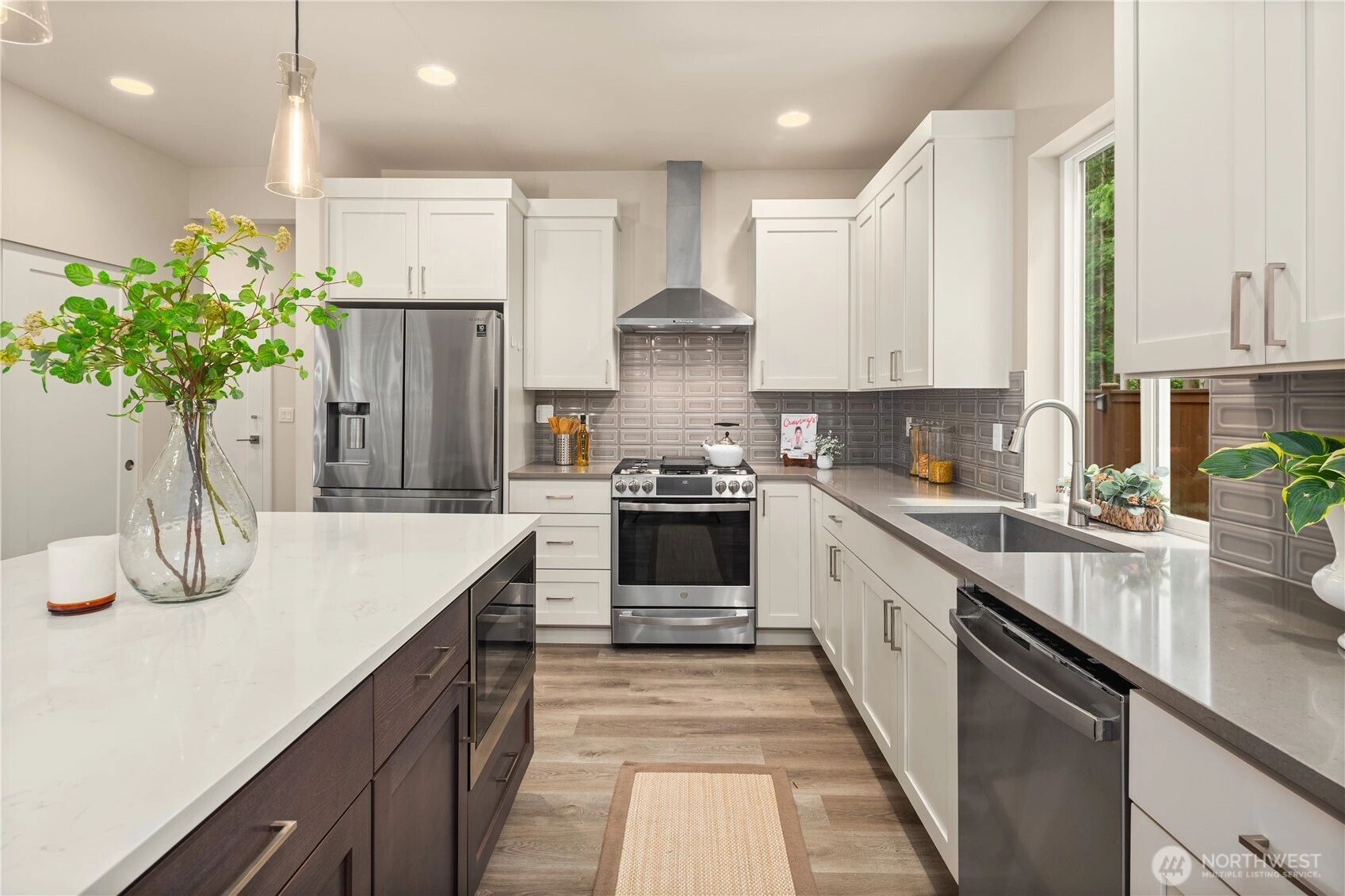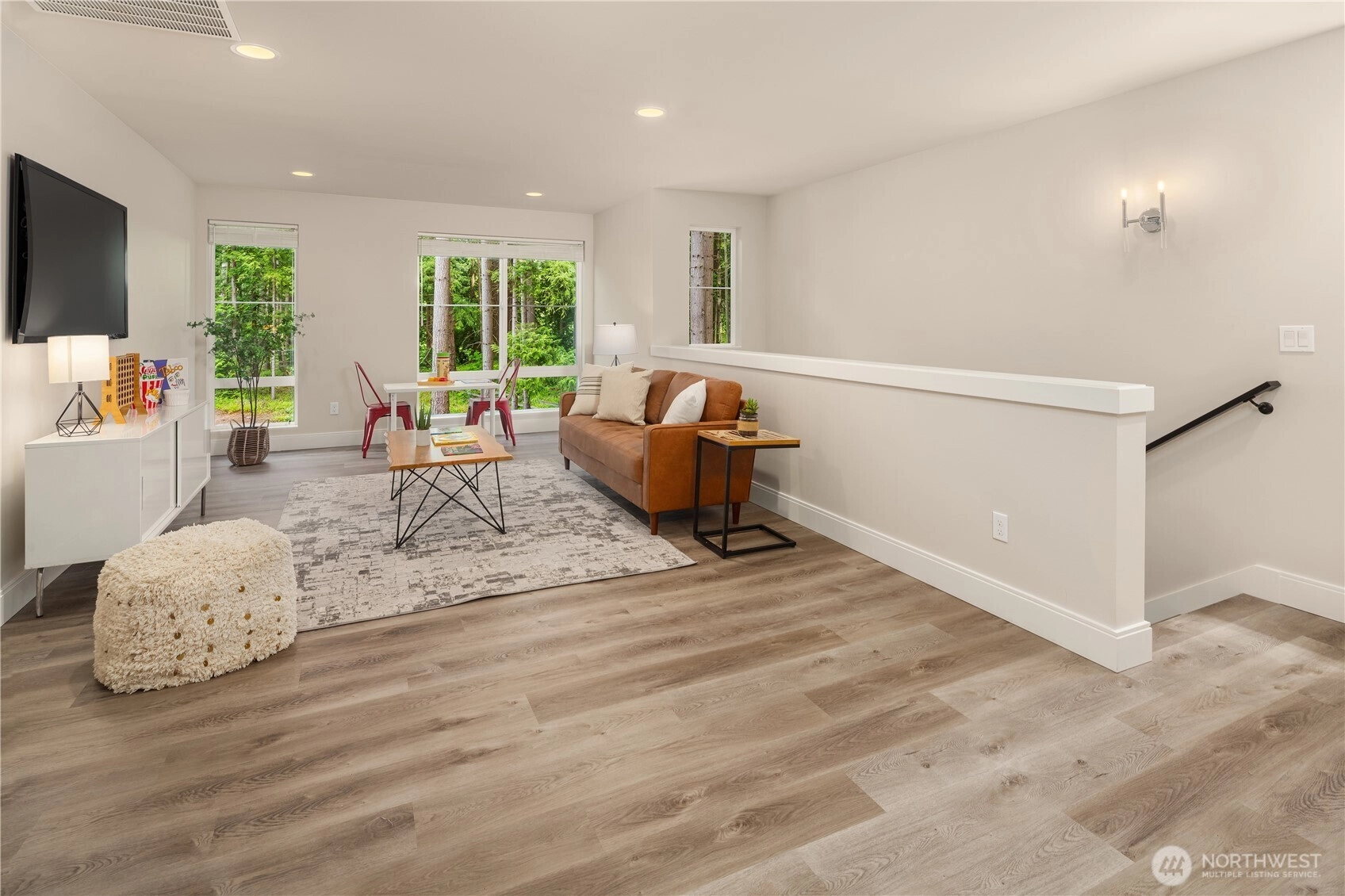 Experience tranquil luxury in this beautifully appointed home, ideally located at the end of a peaceful, friendly cul-de-sac. Thoughtfully designed & impeccably maintained, it seamlessly blends modern elegance with everyday comfort. The open-concept kitchen is a dream for entertainers—featuring slab quartz countertops, ss appliances, & access to a private, covered patio. Upstairs, retreat to a spacious primary suite w spa-like 5-piece bath, alongside a flexible bonus space + two additional bedrooms. A fourth bedroom is conveniently located on the main level, perfect for guests or a dedicated home office. Oversized windows throughout the home frame views of lush greenery & an adjacent greenbelt, showcasing serene PNW beauty. Welcome home!
