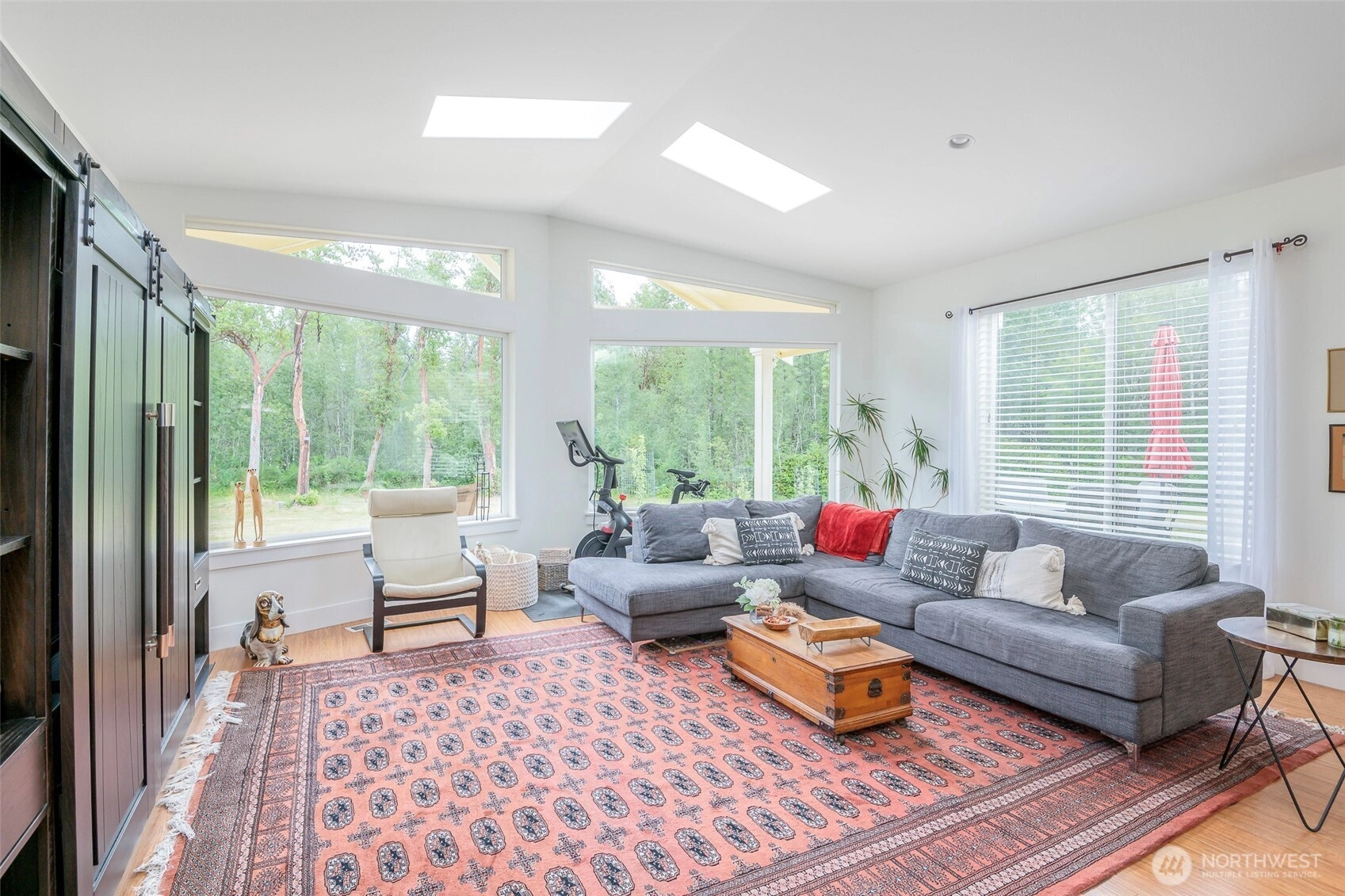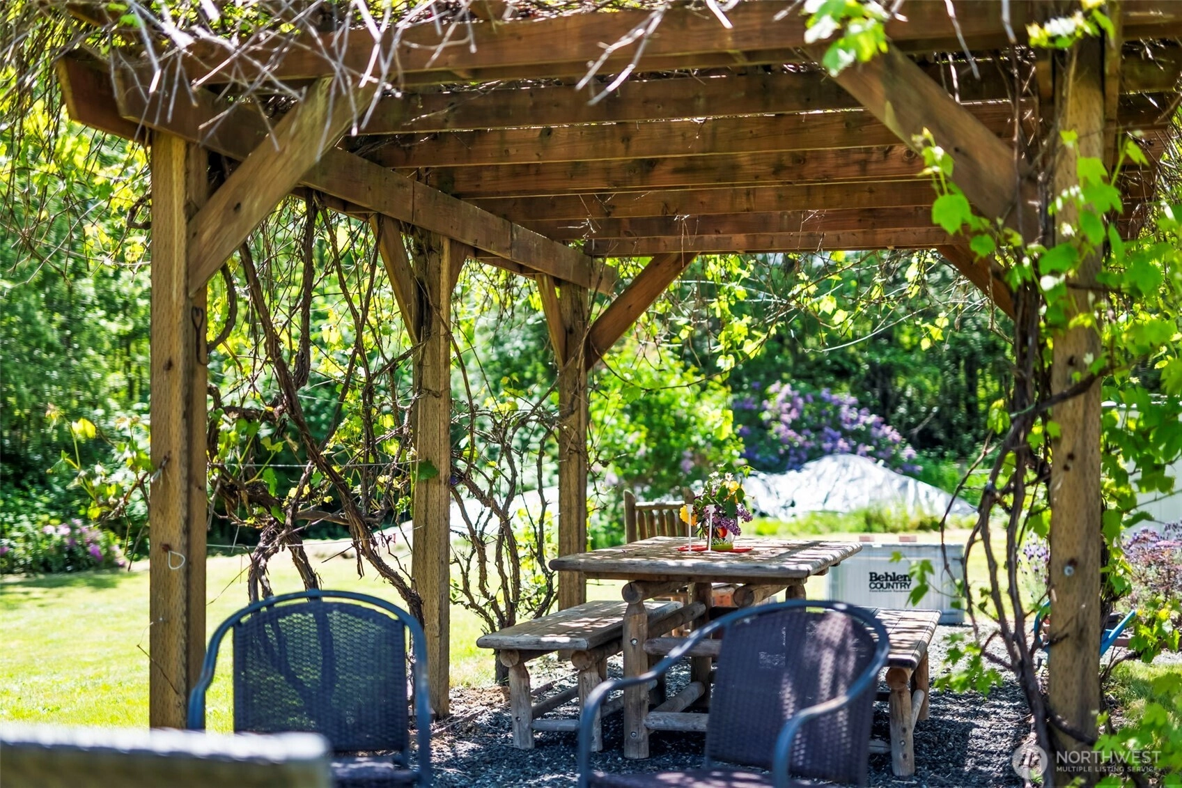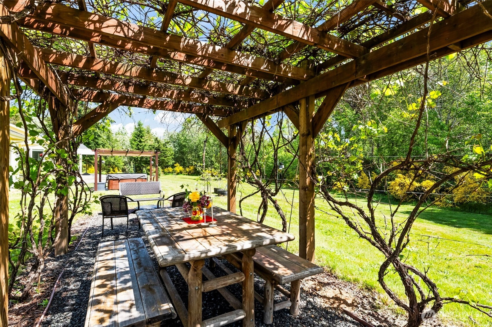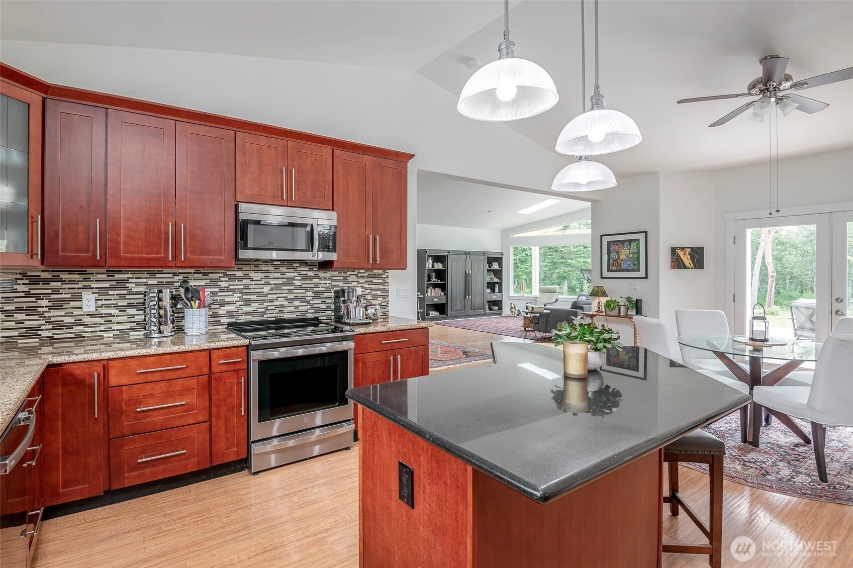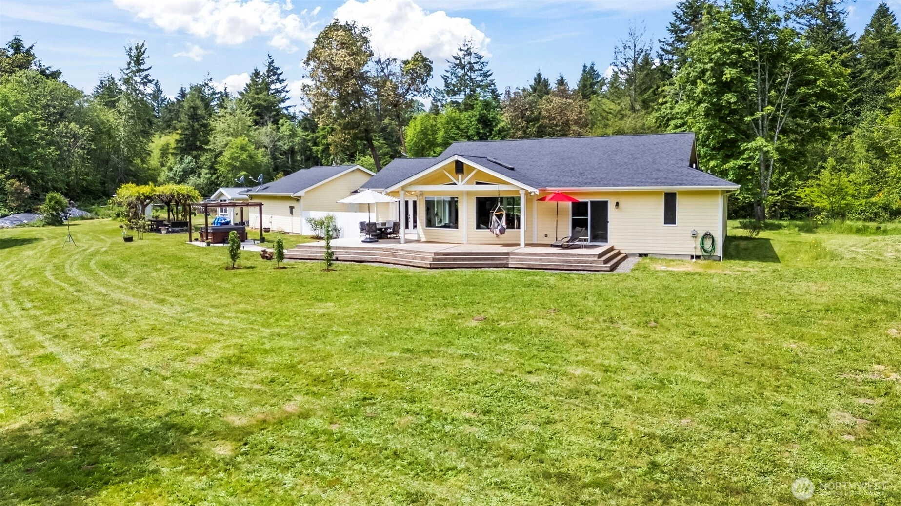 Experience the serenity of a 5-acre sanctuary with this charming one-level home. Featuring an open floorplan, large kitchen, 3 bedrooms, 2 baths, & primary suite with dual walk-ins. Enjoy a fenced yard with a nature trail, fruit trees, and a watershed for beauty without upkeep. New deck, hot tub, whole-house generator, and ample storage with 2 outbuildings, and a 3-car garage. Your peaceful Key Peninsula retreat awaits.